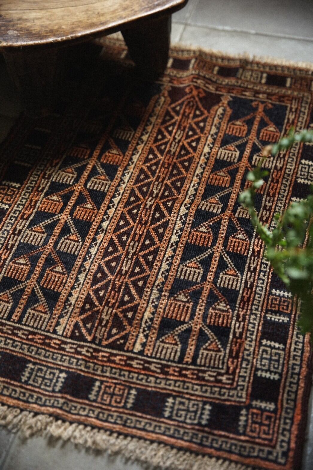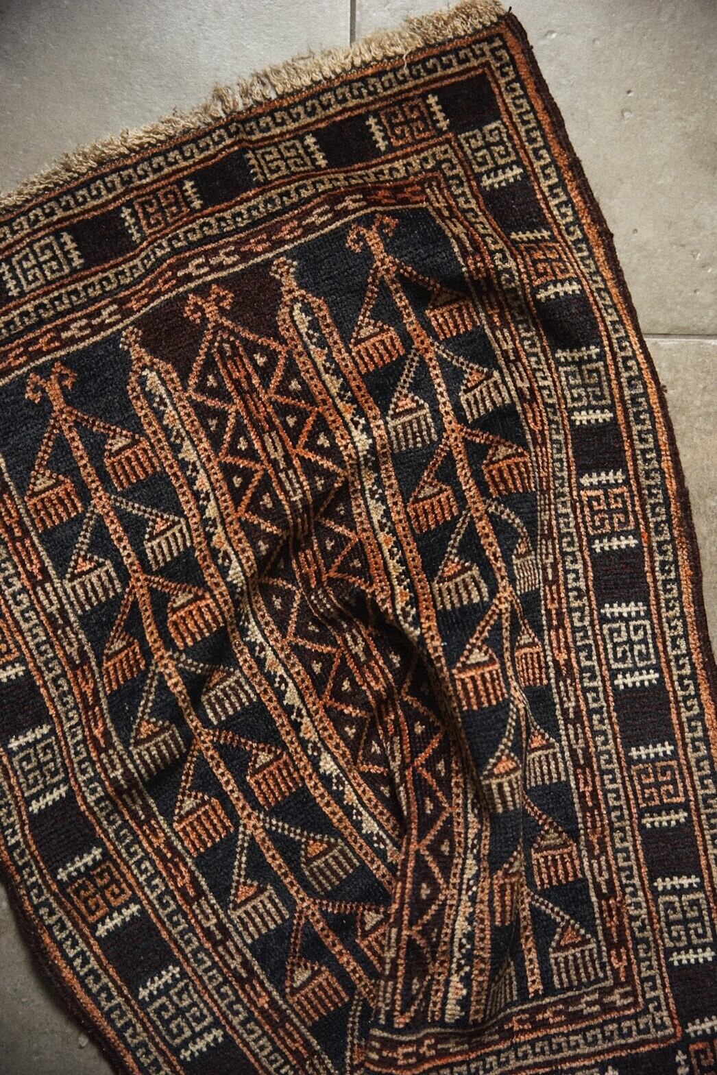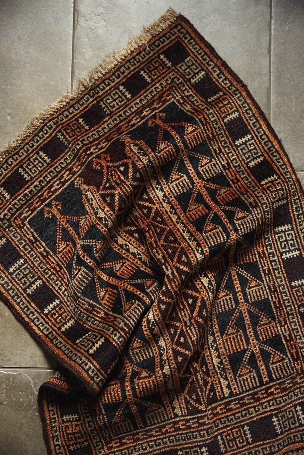 ブラウン、テラコッタ、ネイビー、アイボリーなどの落ち着いたトーンでまとまったトルクメン族によるアリホジャラグ。