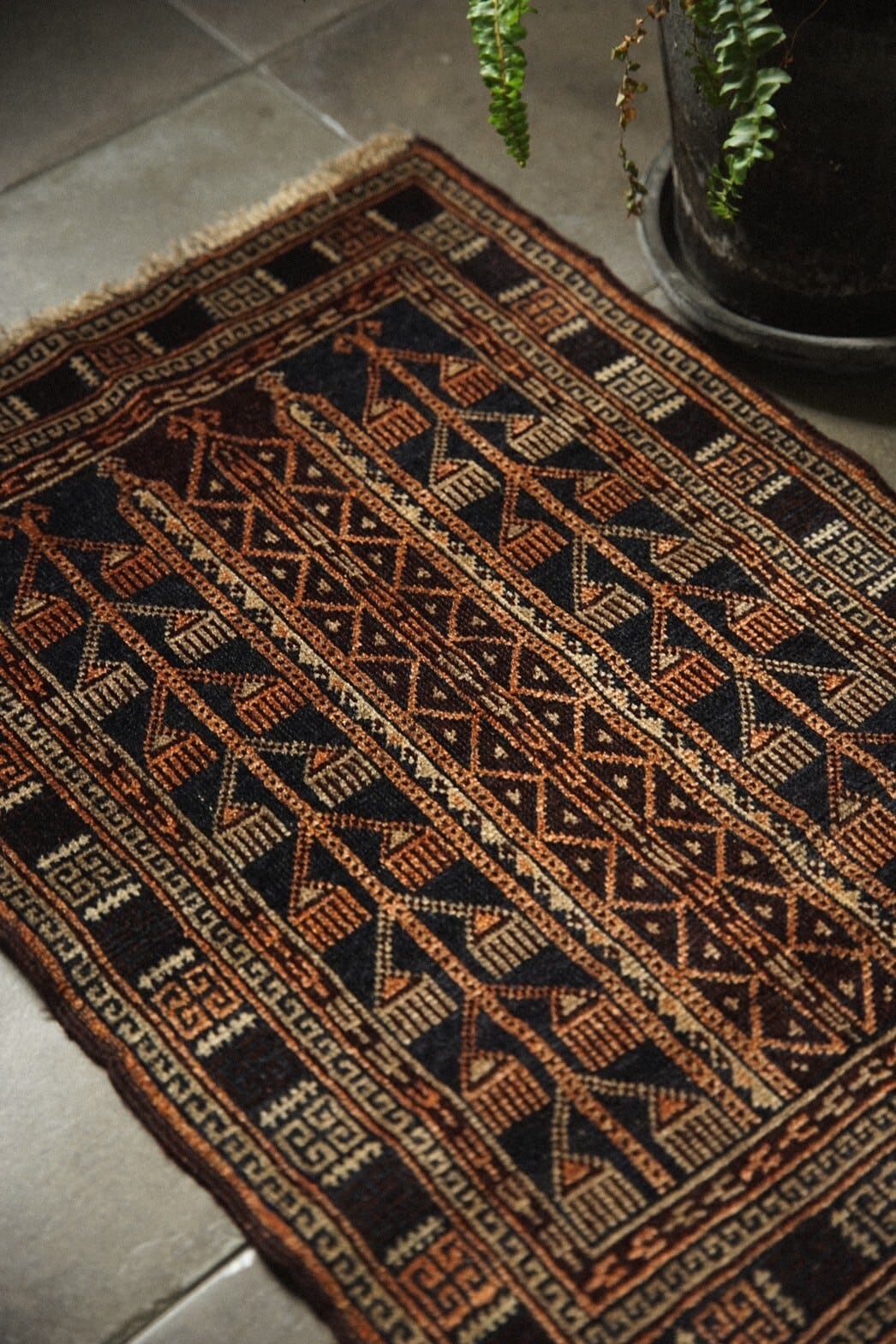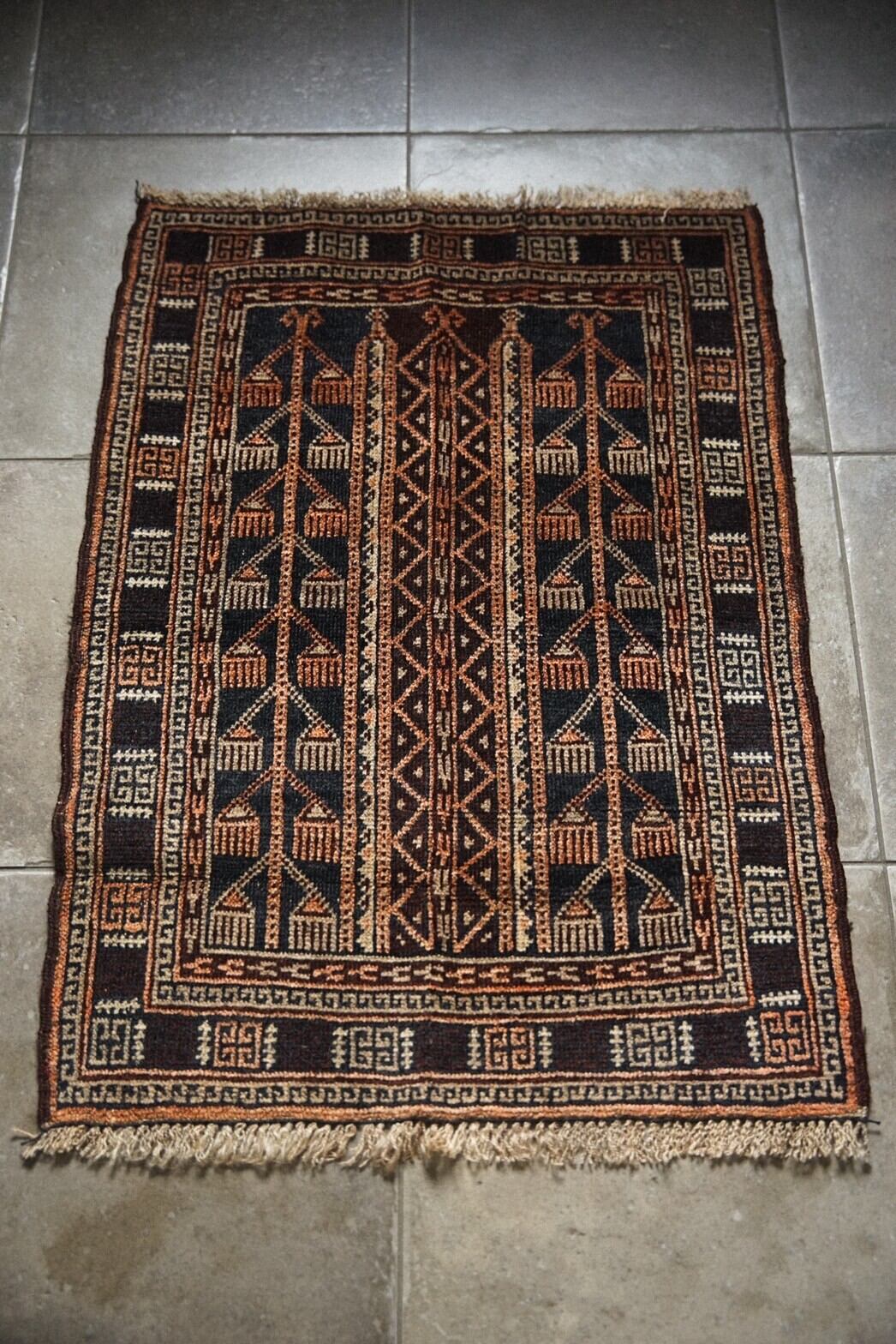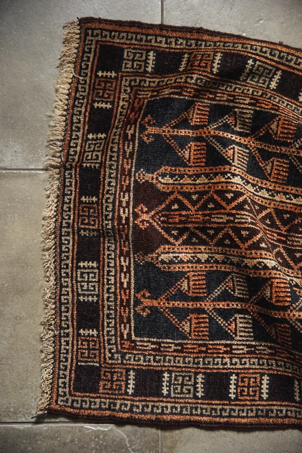 ブラウン、テラコッタ、ネイビー、アイボリーなどの落ち着いたトーンでまとまったトルクメン族によるアリホジャラグ。