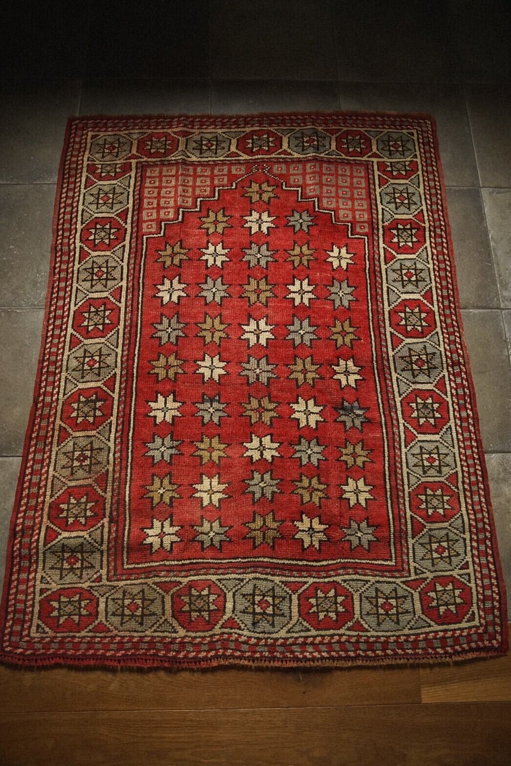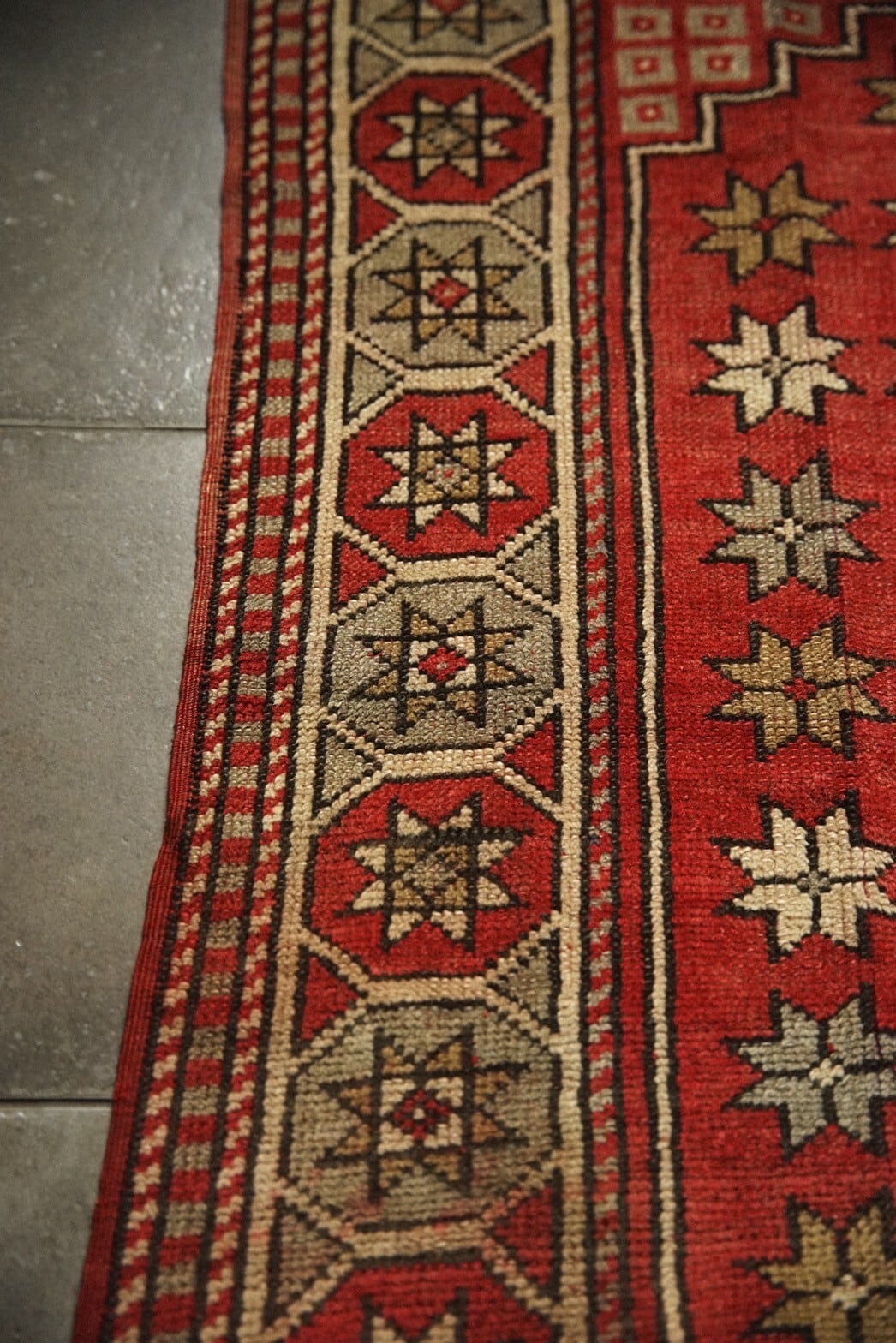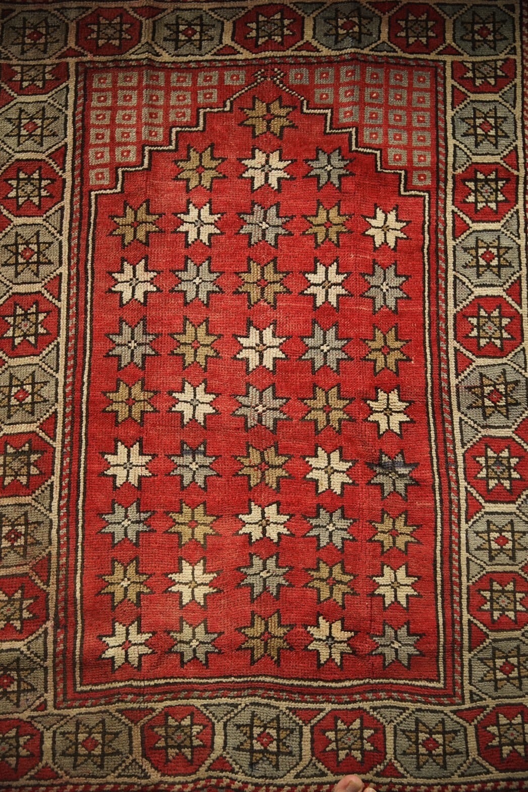 赤系ベースのポップな色合いのターキッシュラグ。ラグの中央にはミフラーブが描かれており、その中にもボーダー部分にもたくさんの八芒星が輝きます。