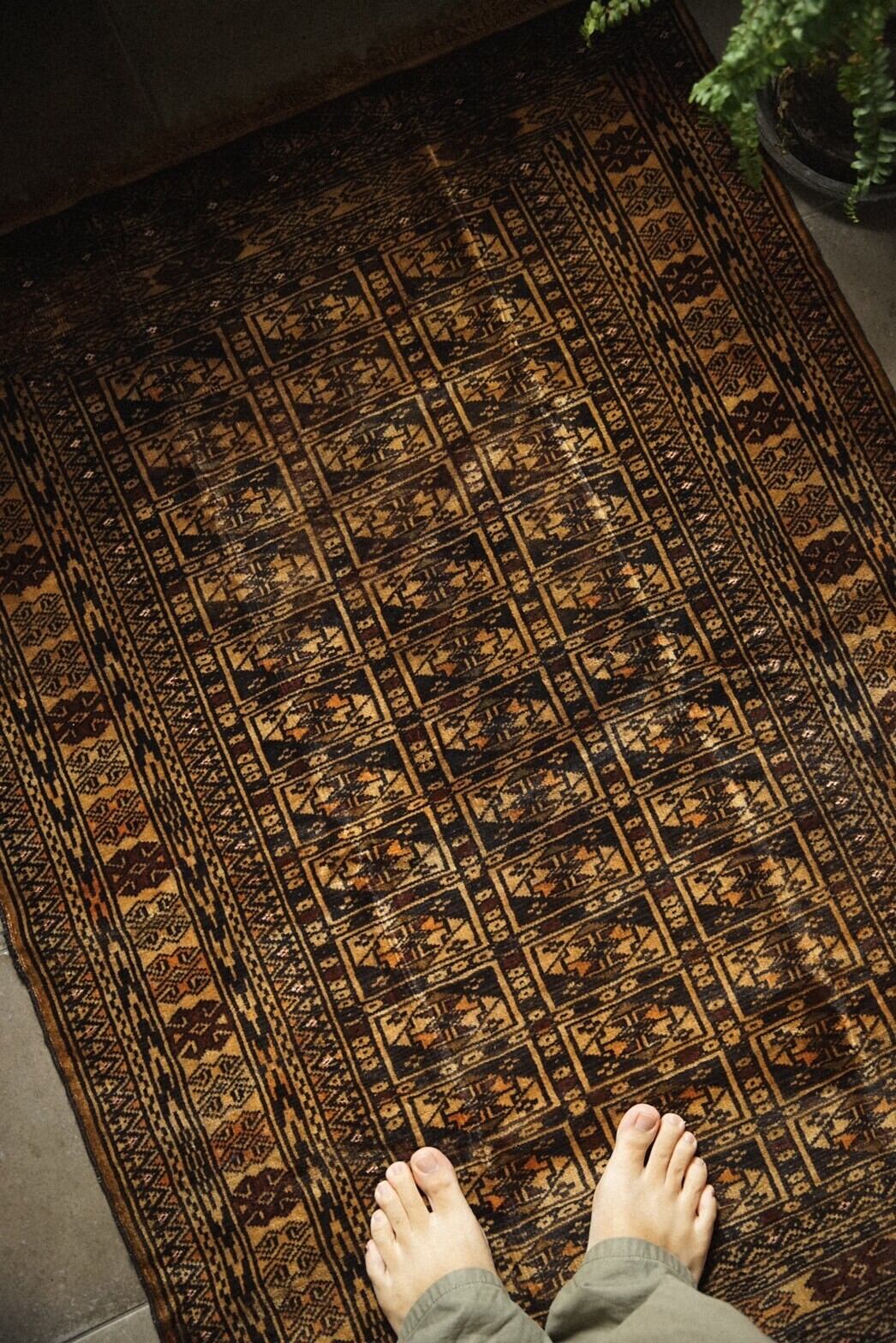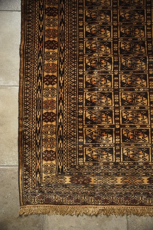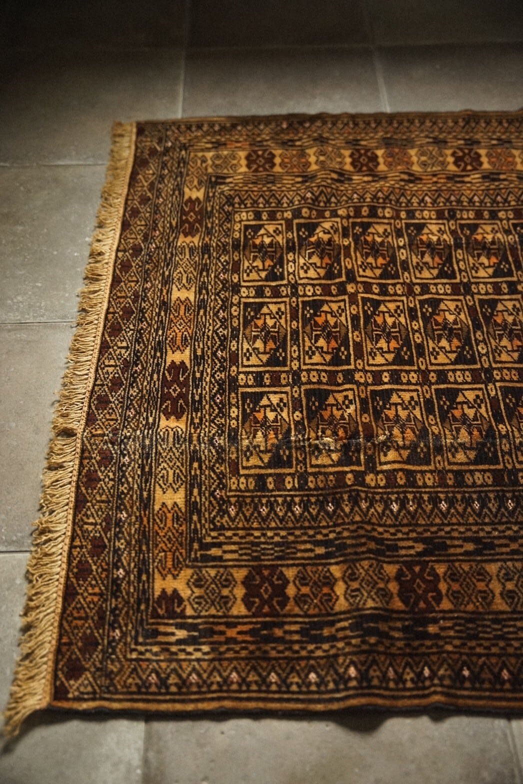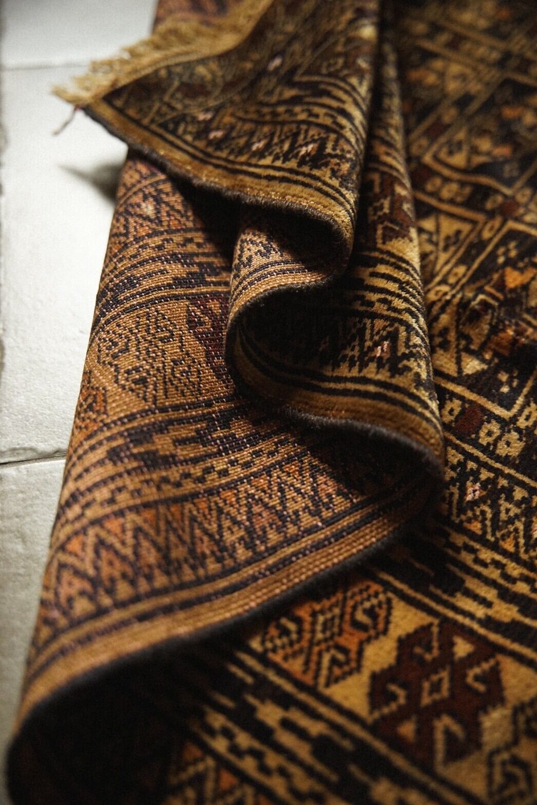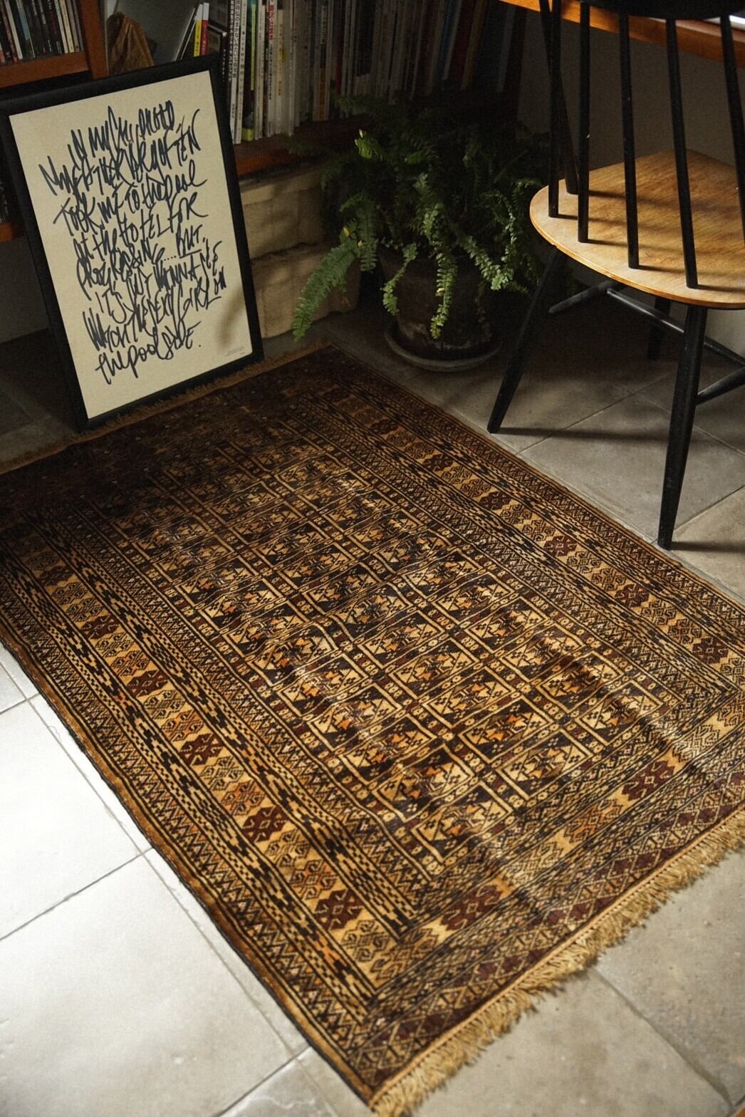 1960年代に織られたトルクメン族によるMauriデザインのラグ。キャメル色ベースにボルドー、オレンジ、ネイビーなどの渋めの色構成。