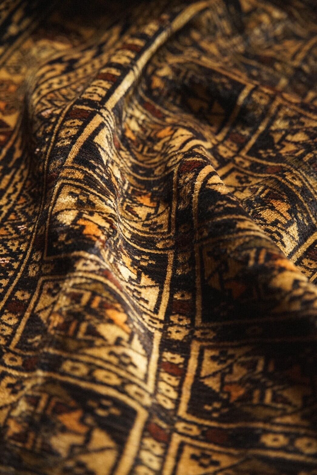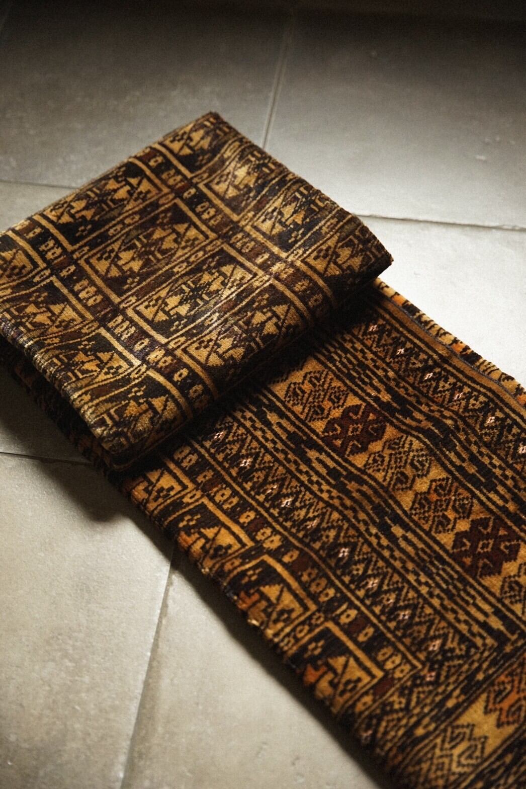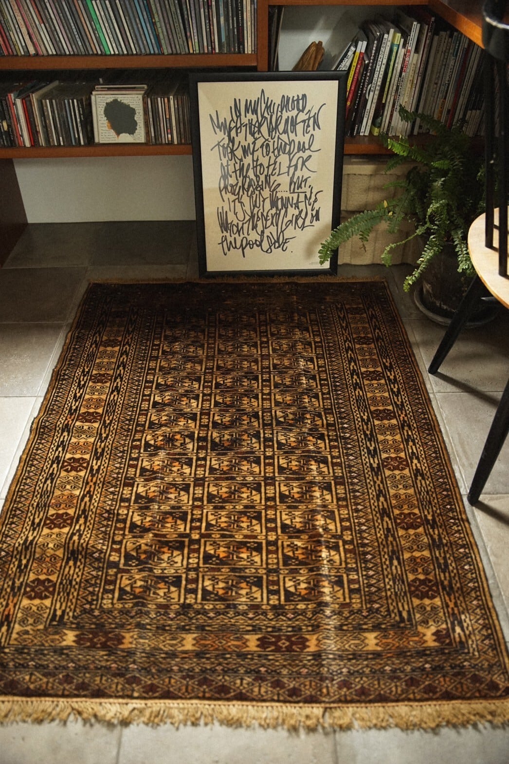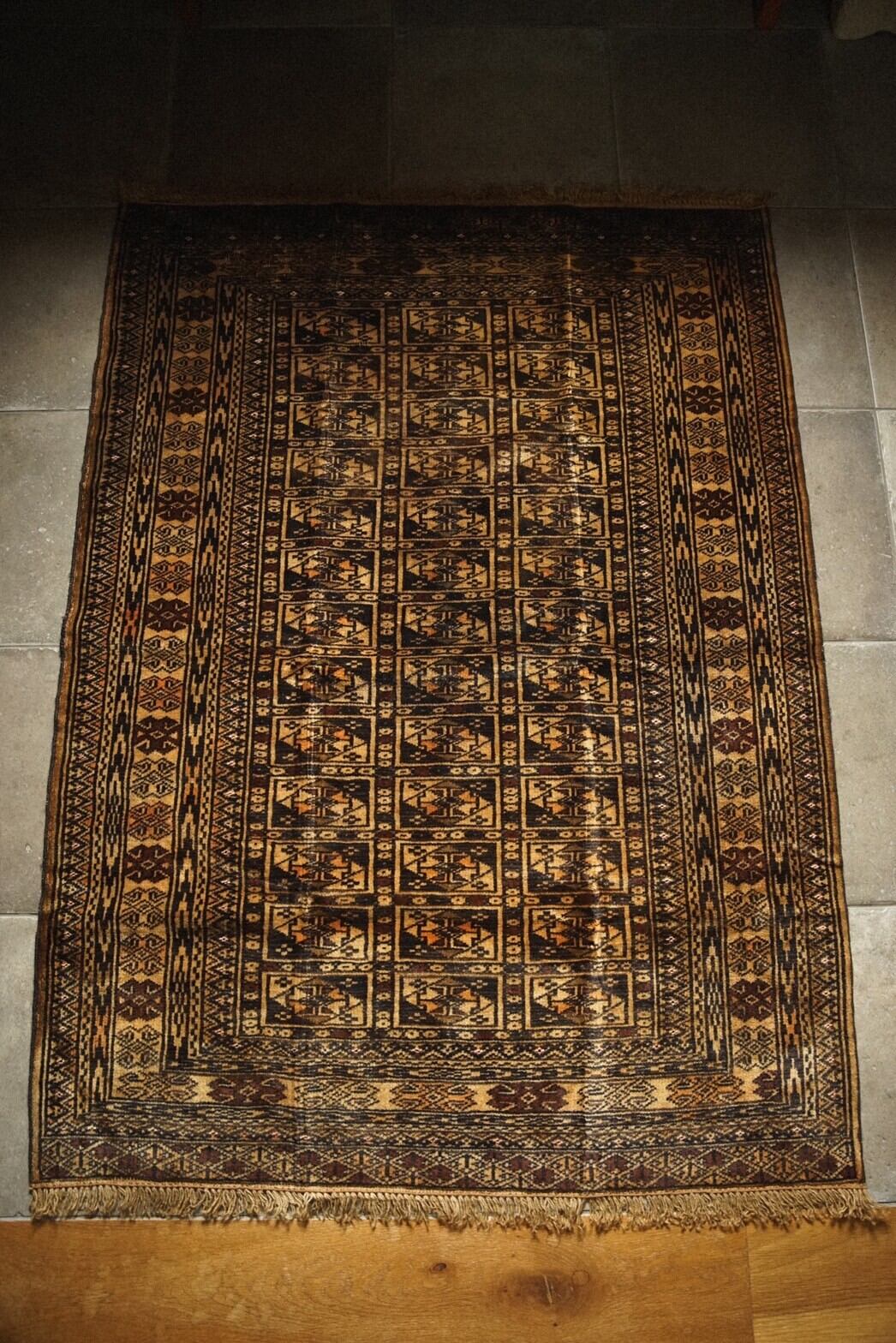 1960年代に織られたトルクメン族によるMauriデザインのラグ。キャメル色ベースにボルドー、オレンジ、ネイビーなどの渋めの色構成。