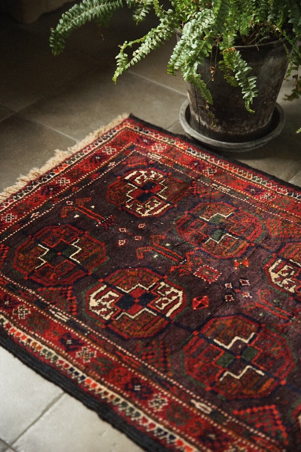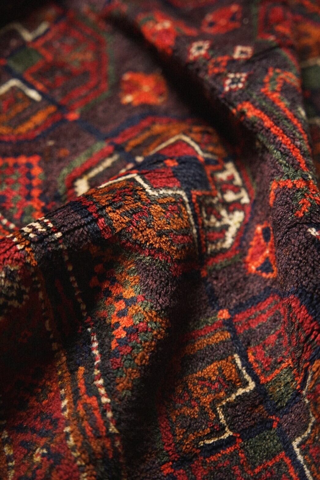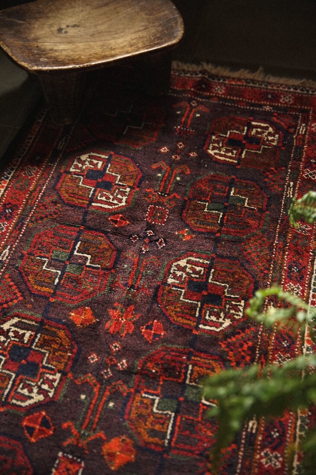madad khani デザインのバルーチラグ。ボルドーベースにレッド、グリーン、テラコッタ、アイボリーなどの深い色味が素敵な一枚。