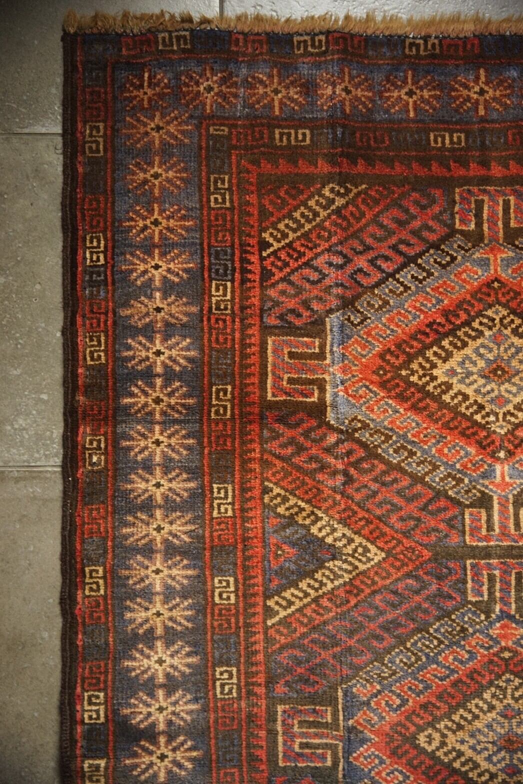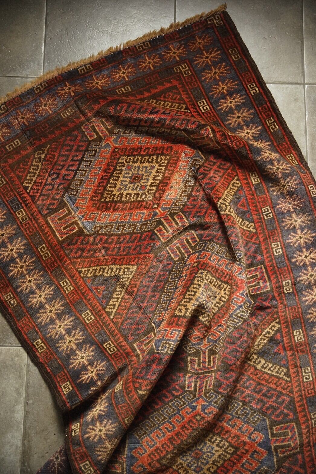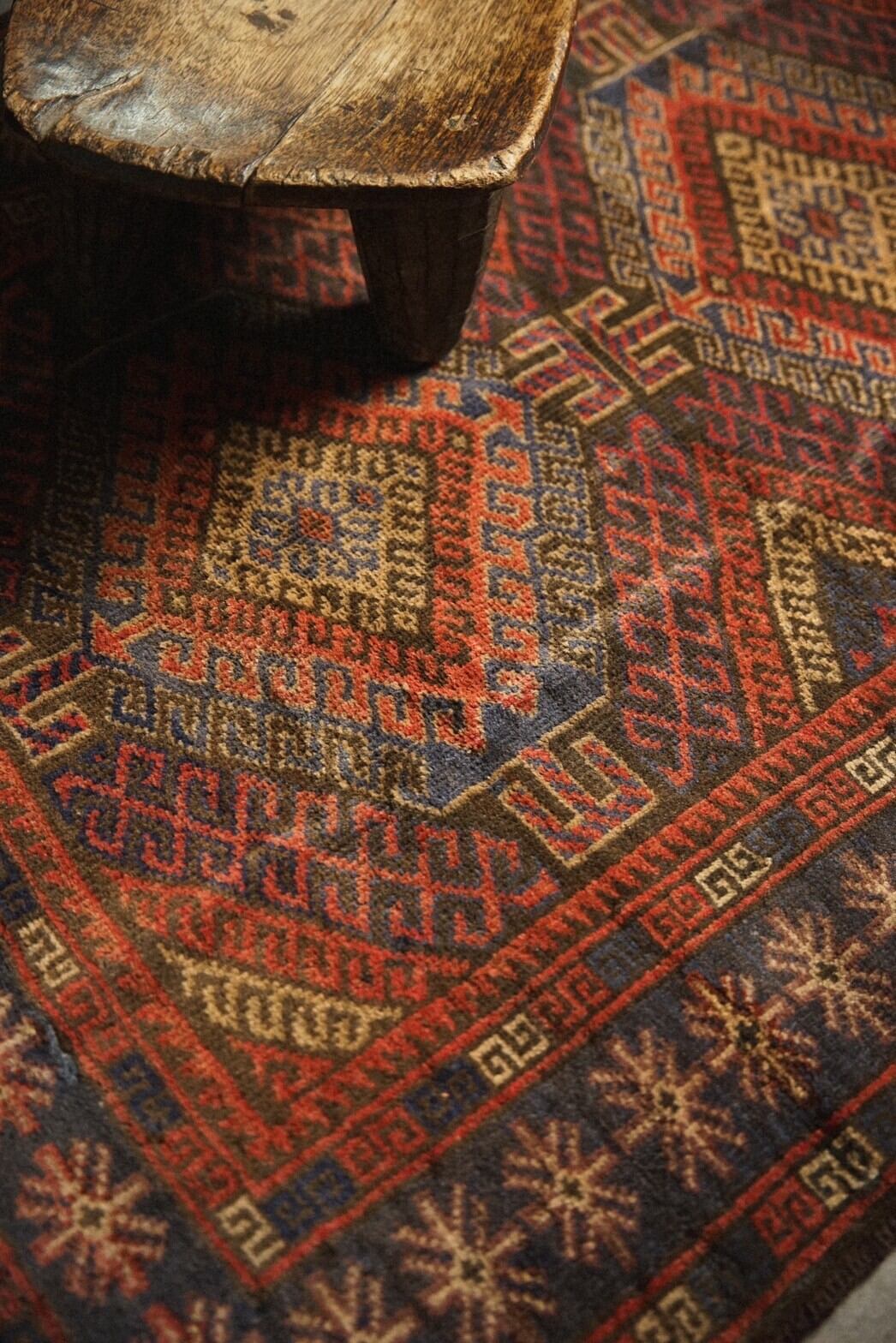 1960年代に織られたアフガニスタン産のマシュワニファミリーによるバルーチラグ。