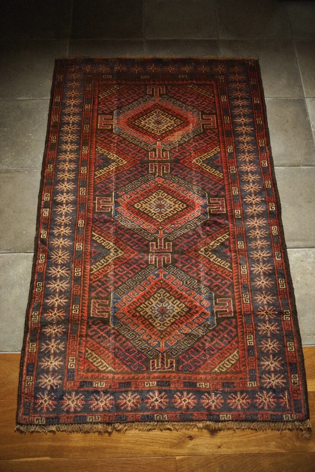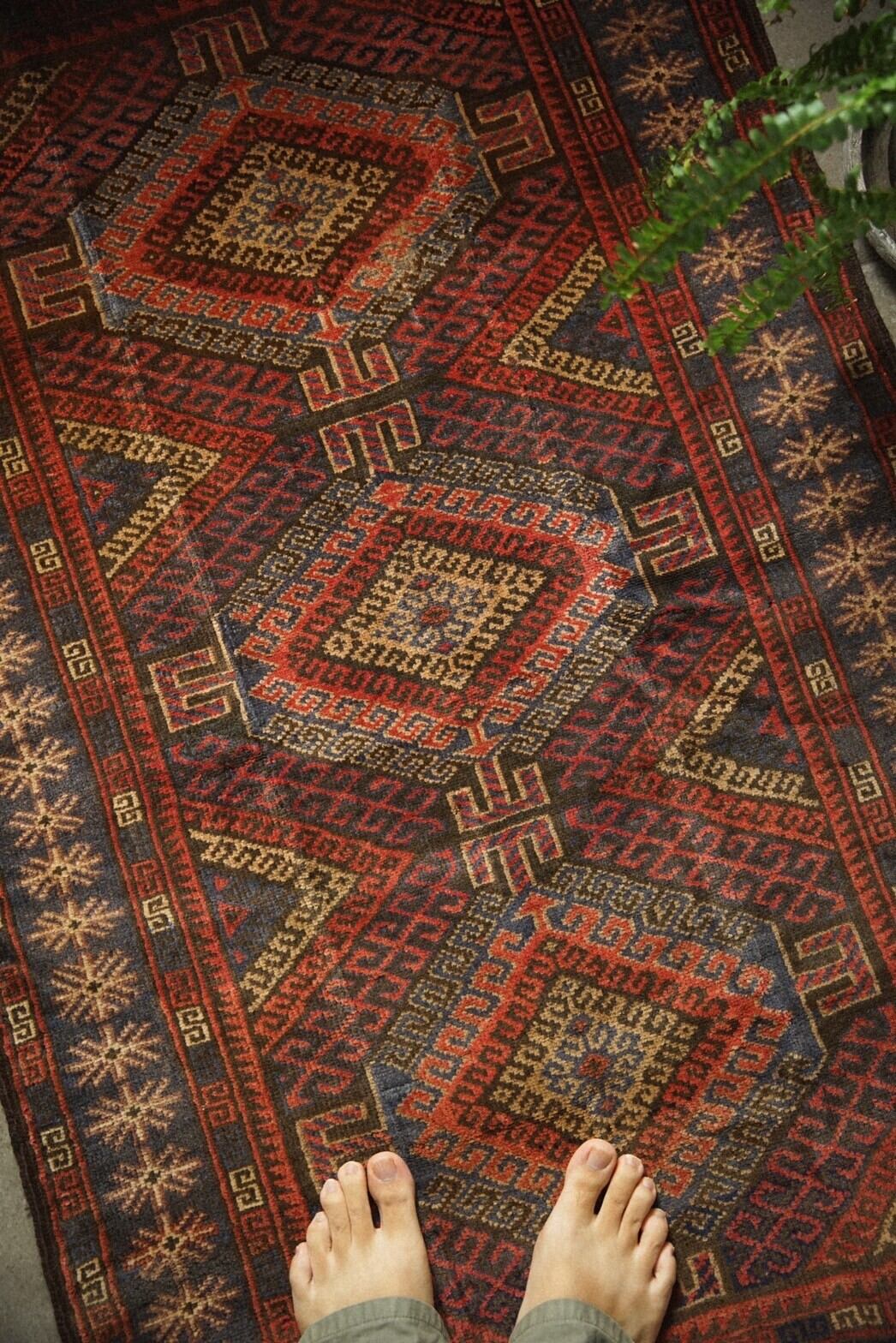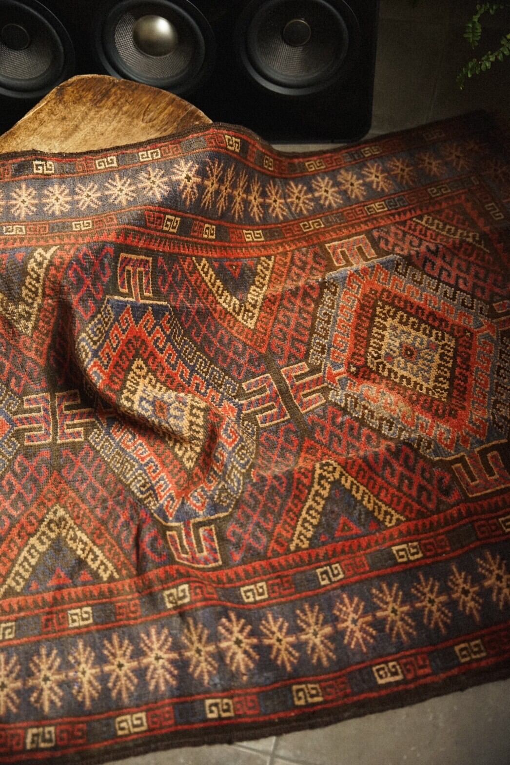 1960年代に織られたアフガニスタン産のマシュワニファミリーによるバルーチラグ。