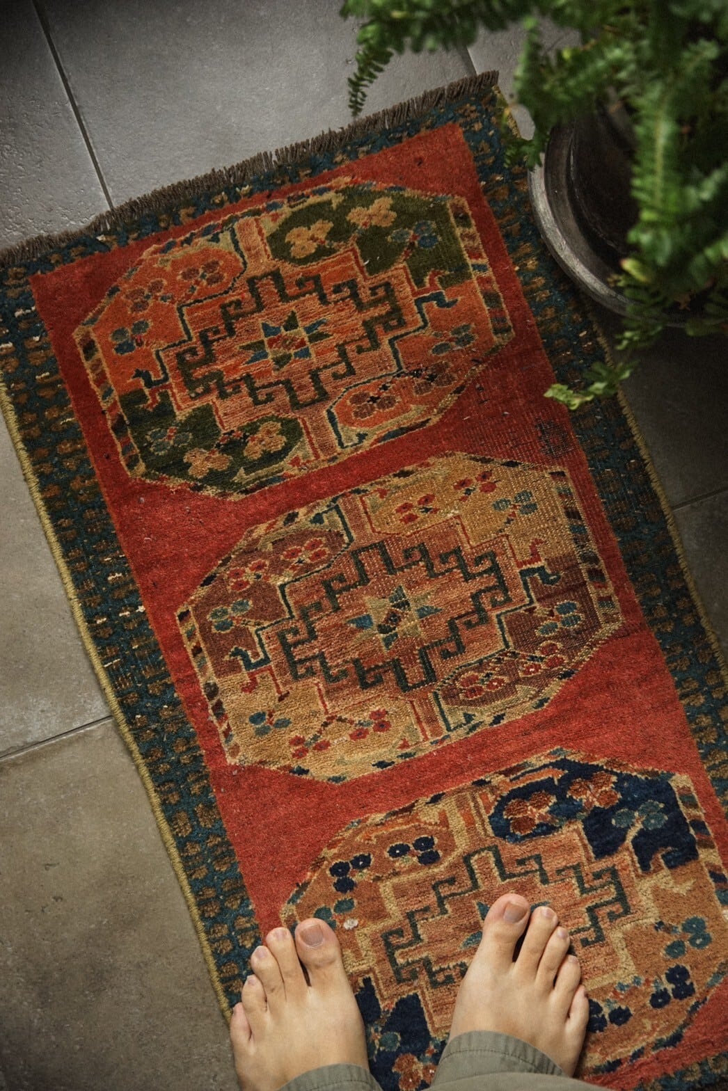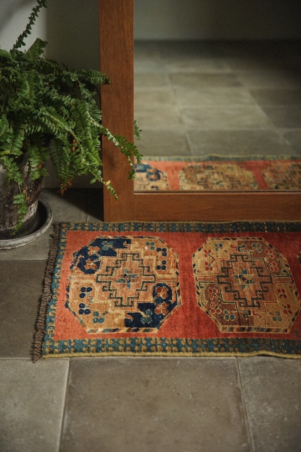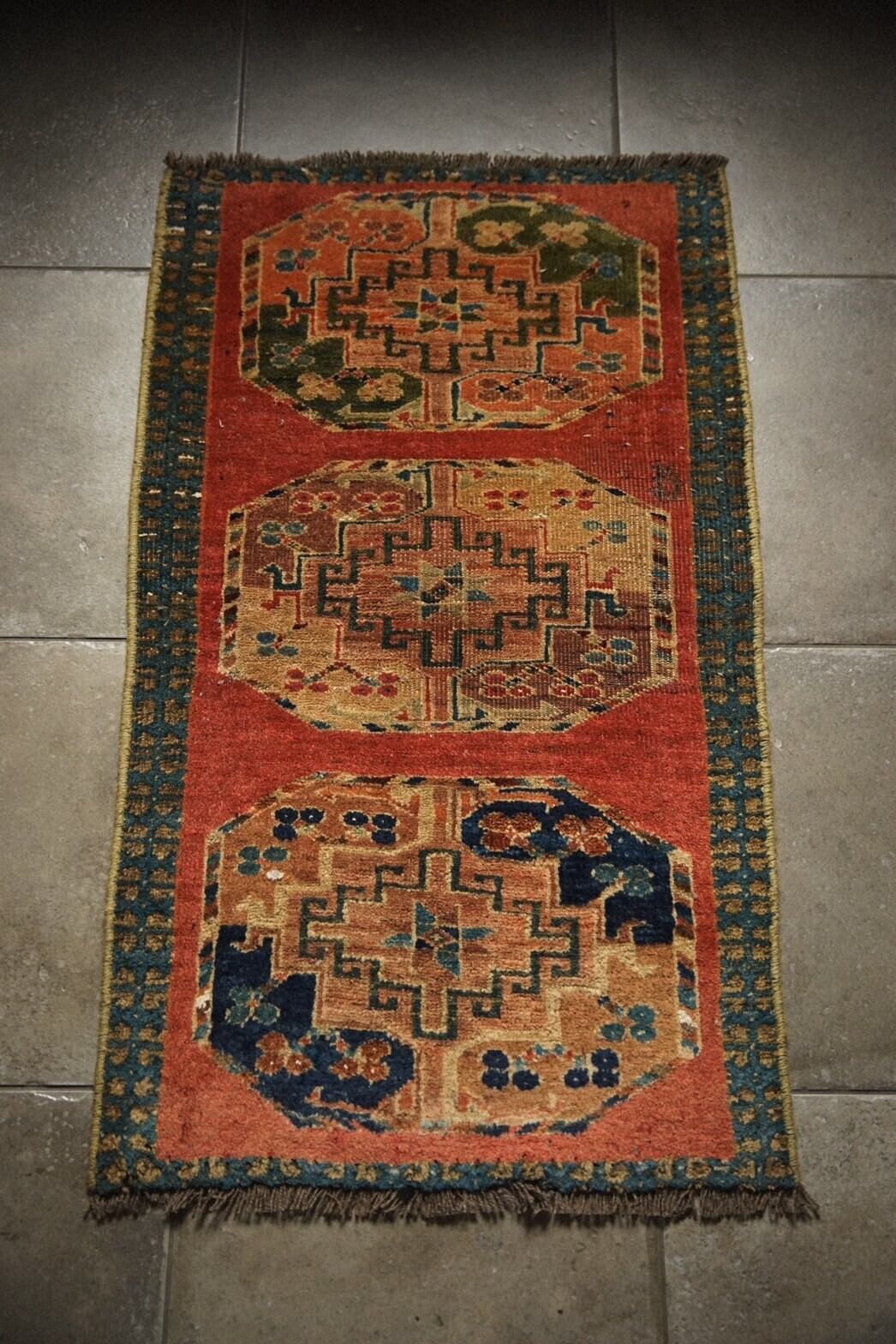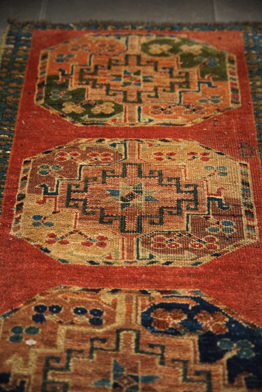 朱赤のフィールドに3つ並んだギュルは一つずつ少し色味が違っており、それぞれカーキや小豆色、インディゴなど渋めの配色がとても素敵です。
