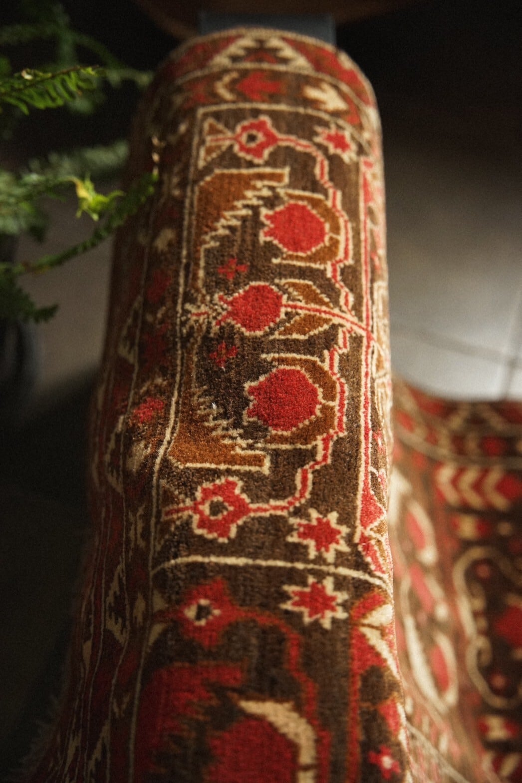 ブラウン、レッド、アイボリーのシンプルな配色が細やかなデザインの美しさを引き立てています。