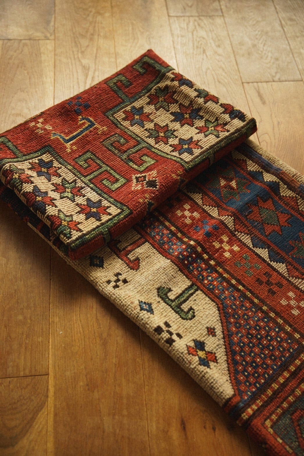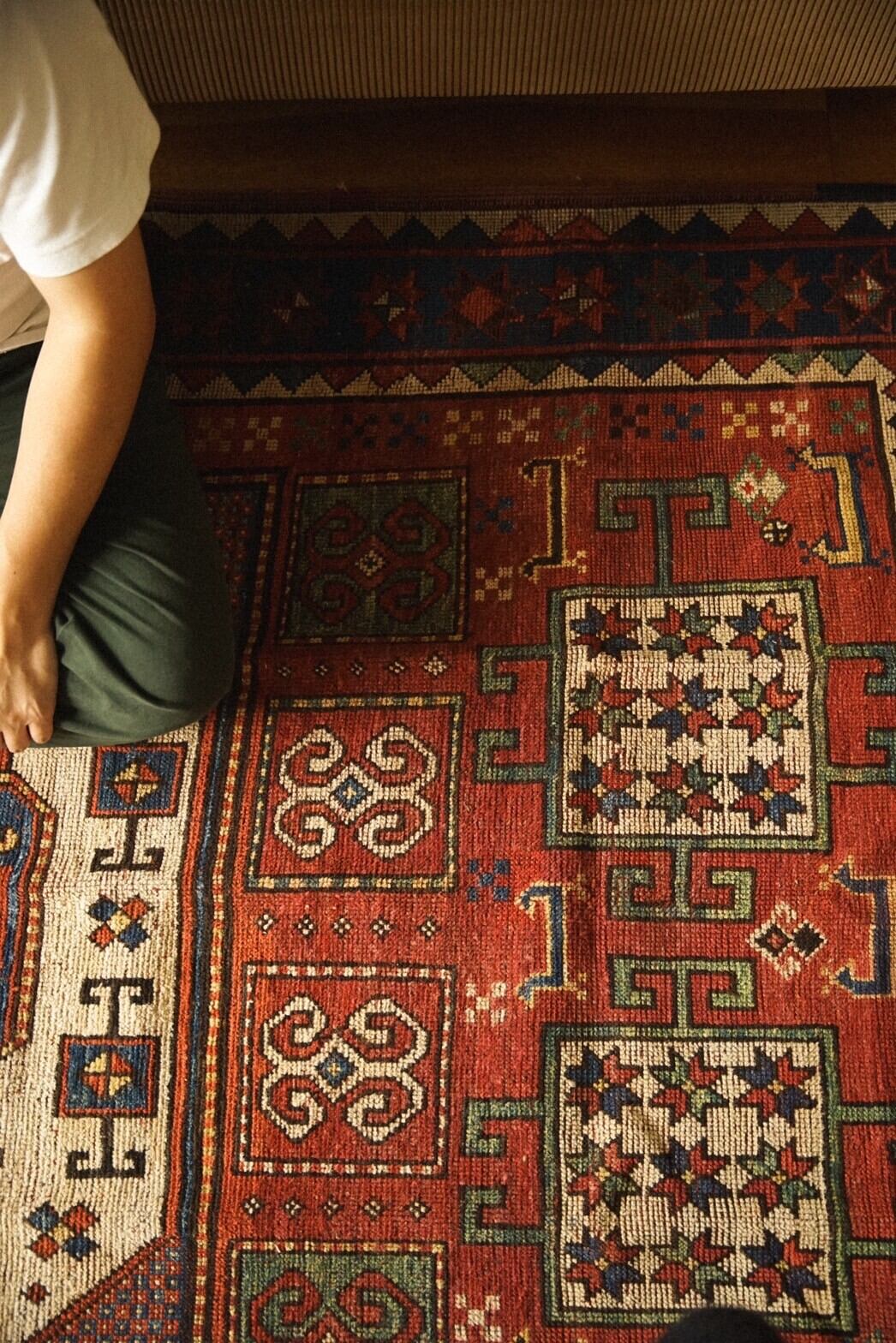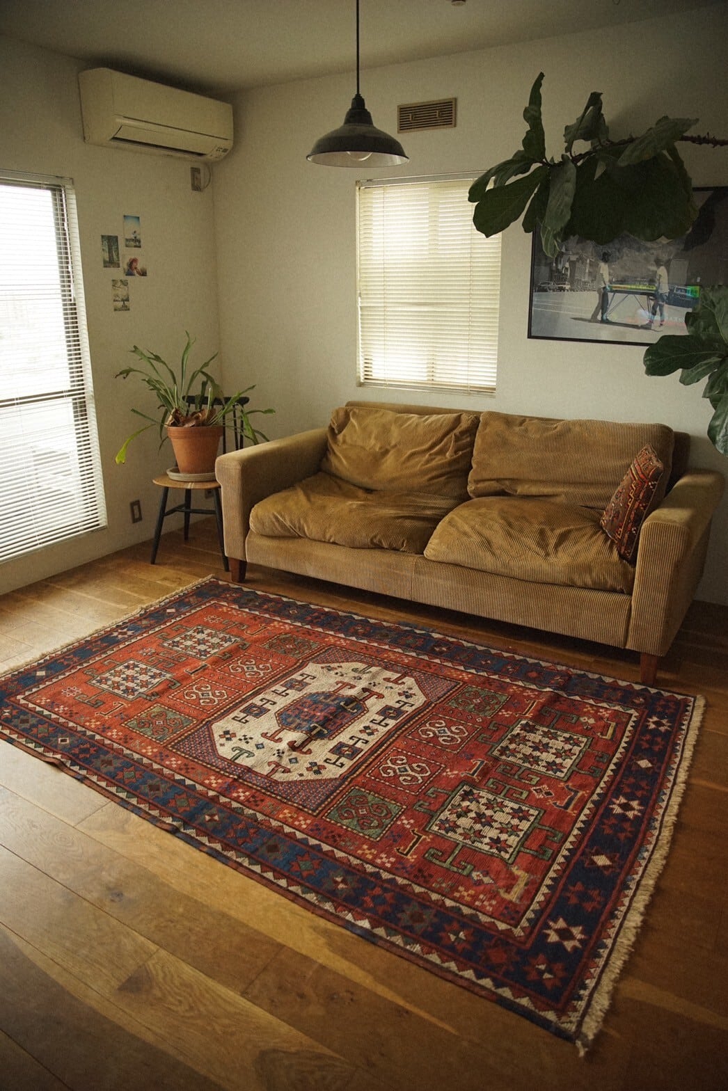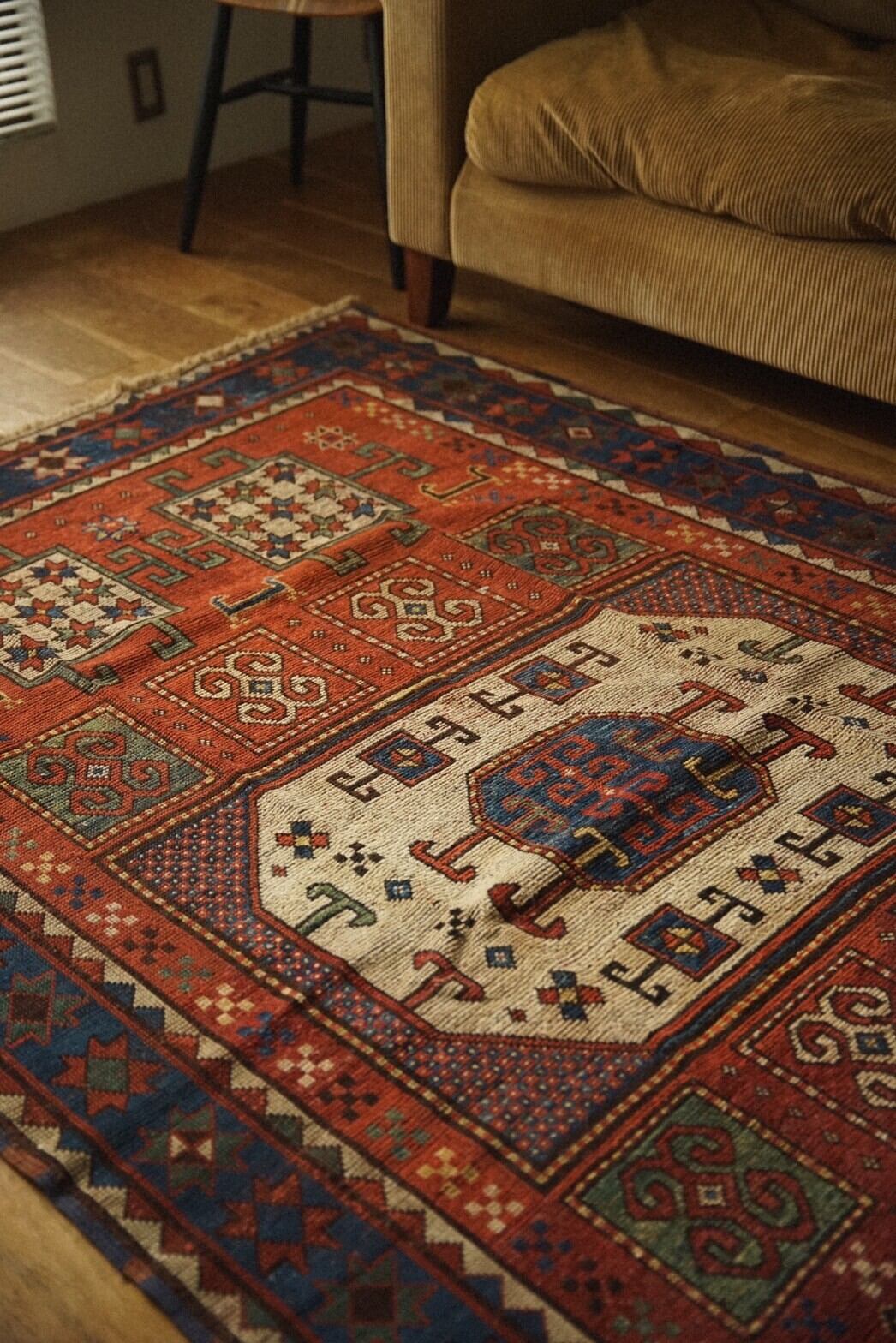 1890年代に織られたアゼルバイジャン産のアンティークコーカサスラグ。他民族が交じり合う地域で織られたコーカサスラグは色んな文化がMIXされたアート性の高いユニークなデザインが多く、欧米ではたくさんのコレクターがいる人気のトライバルラグです。オレンジに近い朱赤のフィールドの中には色鮮やかに描かれた力強い幾何学紋様のデザイン。八角星や雄羊の角、そして4つ足の動物も見られます。130年以上前に織られたものですが、状態もとても良くパイルも綺麗に残っています。そして何よりもコーカサスラグは大胆なデザインに見えますが、どんなインテリアにも合わせやすい懐の広さがあります。まさに魔法の絨毯のようにこのラグの上で寝転がるだけで、異国を旅してきた記憶と時間が蘇ってきそうです。素晴らしいアンティークラグをお探しの方、コーカサスラグがお好きな方、このラグに一目惚れした方、そして永くご愛用頂ける方にお譲りしたい一枚です。