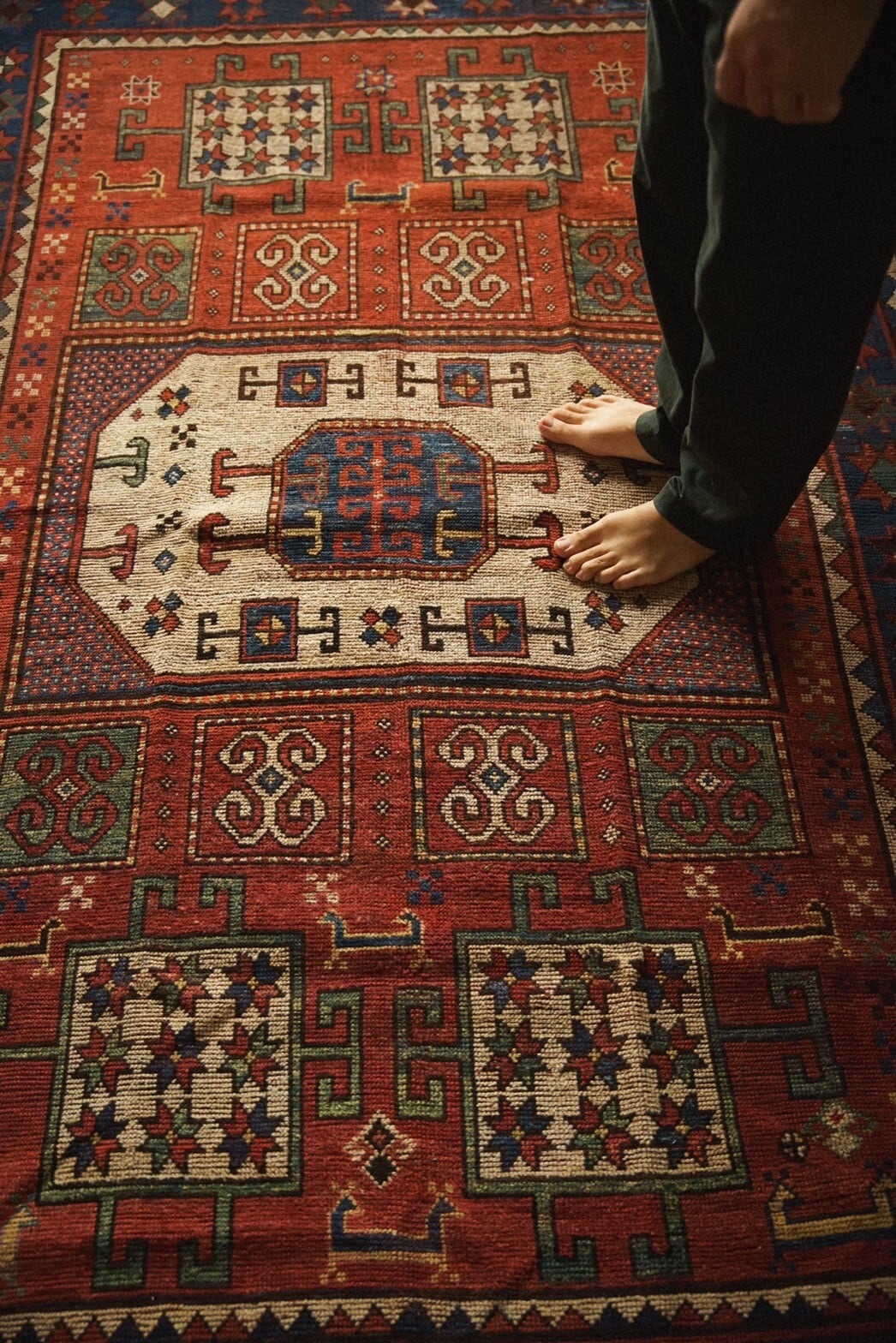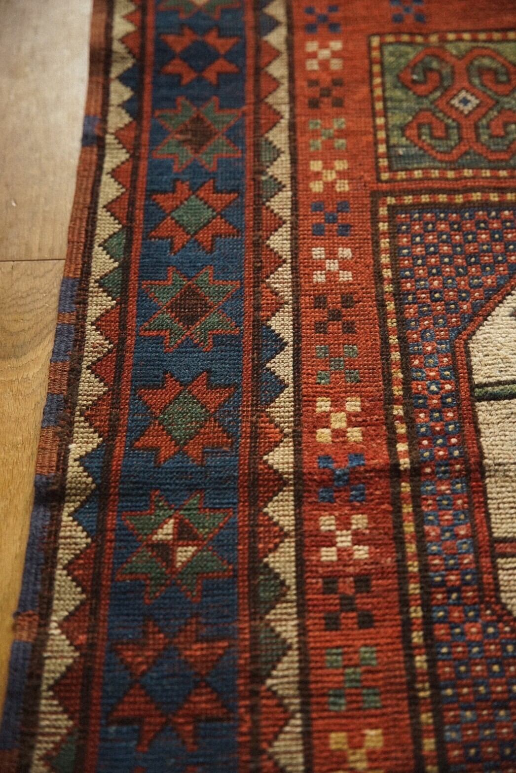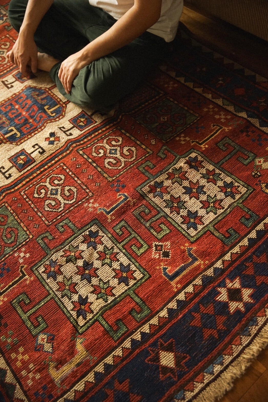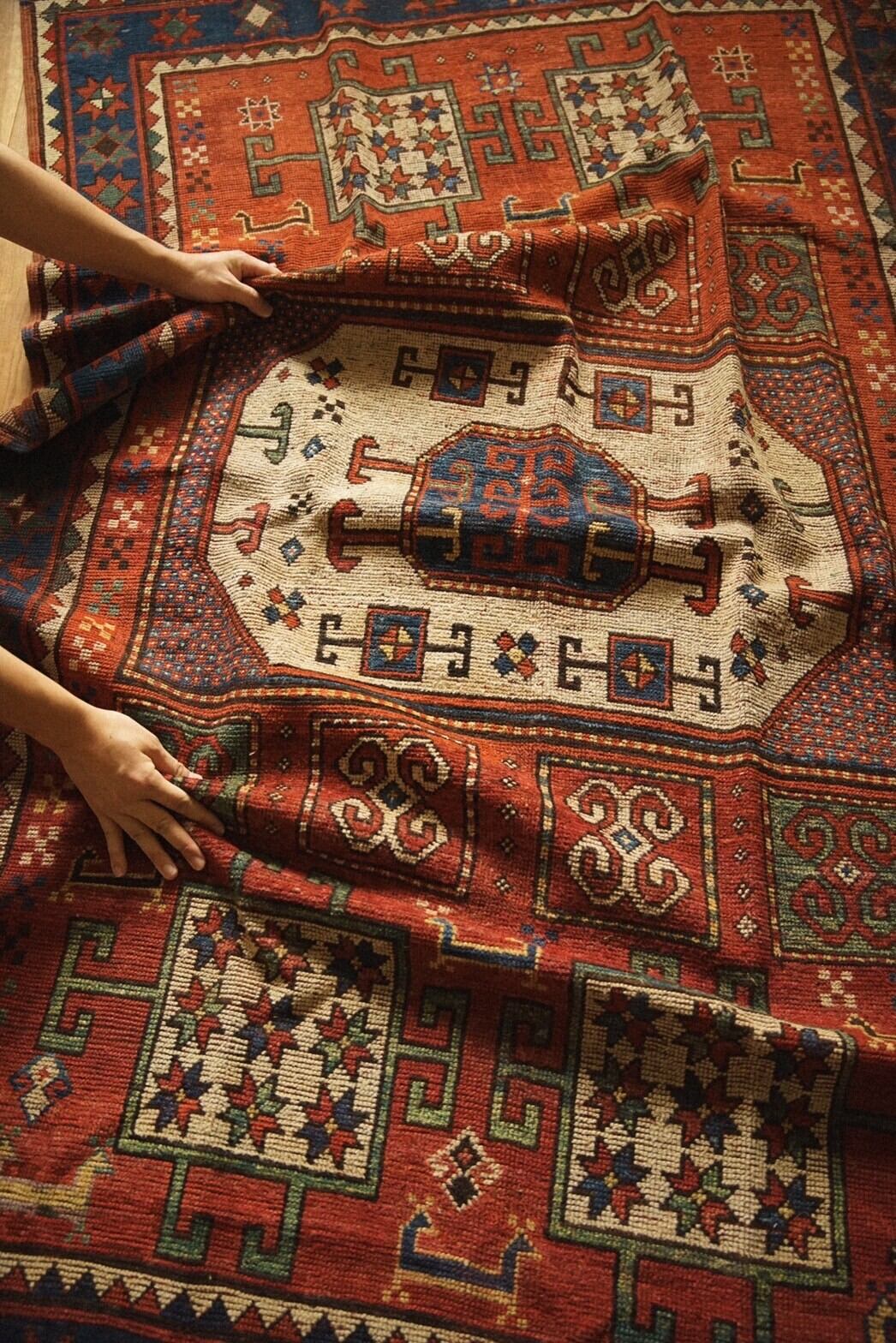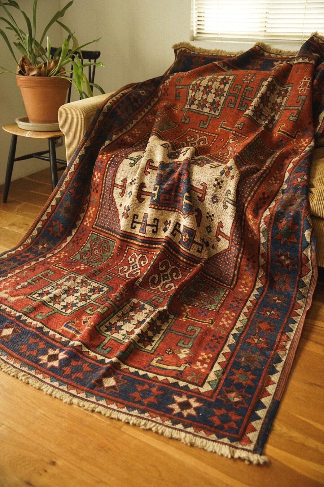 1890年代に織られたアゼルバイジャン産のアンティークコーカサスラグ。他民族が交じり合う地域で織られたコーカサスラグは色んな文化がMIXされたアート性の高いユニークなデザインが多く、欧米ではたくさんのコレクターがいる人気のトライバルラグです。オレンジに近い朱赤のフィールドの中には色鮮やかに描かれた力強い幾何学紋様のデザイン。八角星や雄羊の角、そして4つ足の動物も見られます。130年以上前に織られたものですが、状態もとても良くパイルも綺麗に残っています。そして何よりもコーカサスラグは大胆なデザインに見えますが、どんなインテリアにも合わせやすい懐の広さがあります。まさに魔法の絨毯のようにこのラグの上で寝転がるだけで、異国を旅してきた記憶と時間が蘇ってきそうです。素晴らしいアンティークラグをお探しの方、コーカサスラグがお好きな方、このラグに一目惚れした方、そして永くご愛用頂ける方にお譲りしたい一枚です。