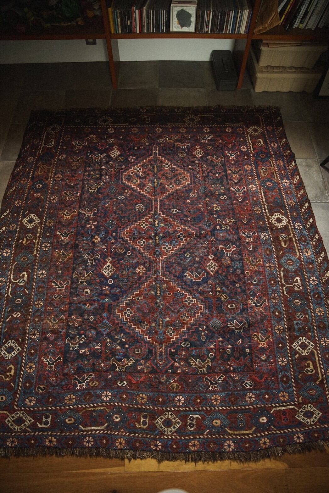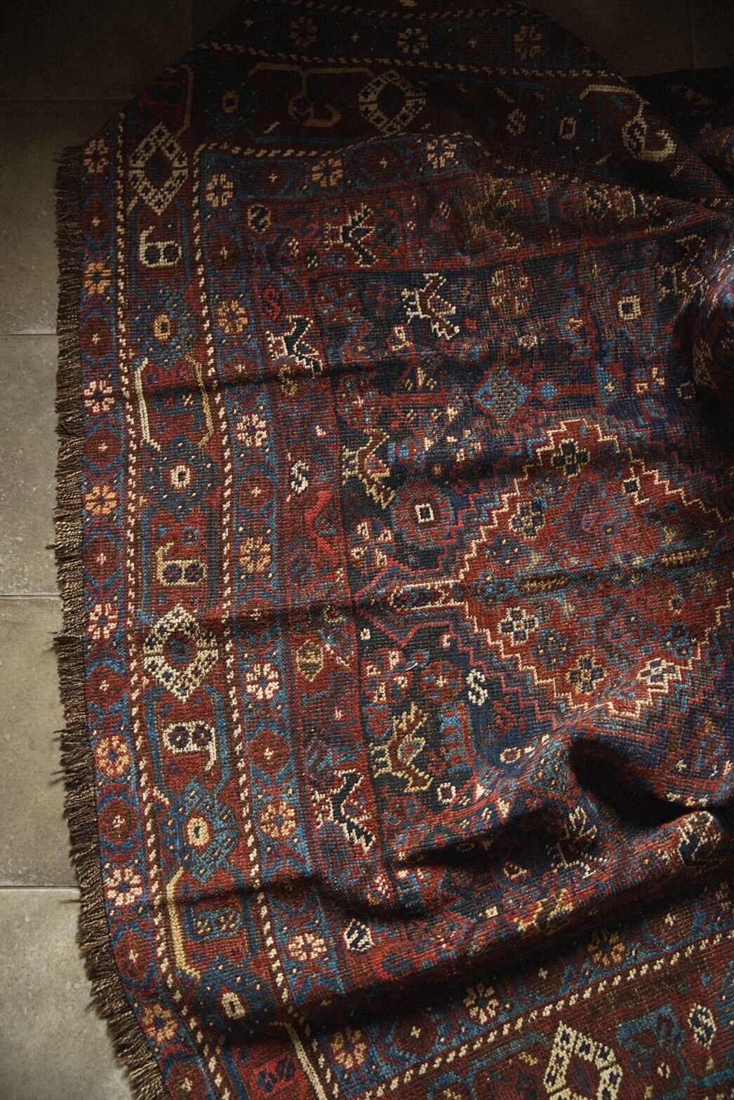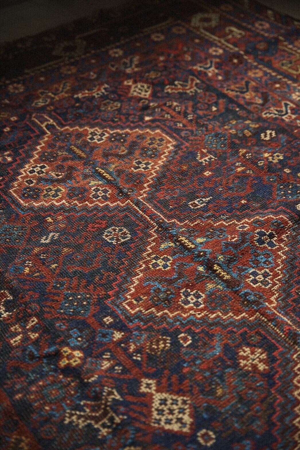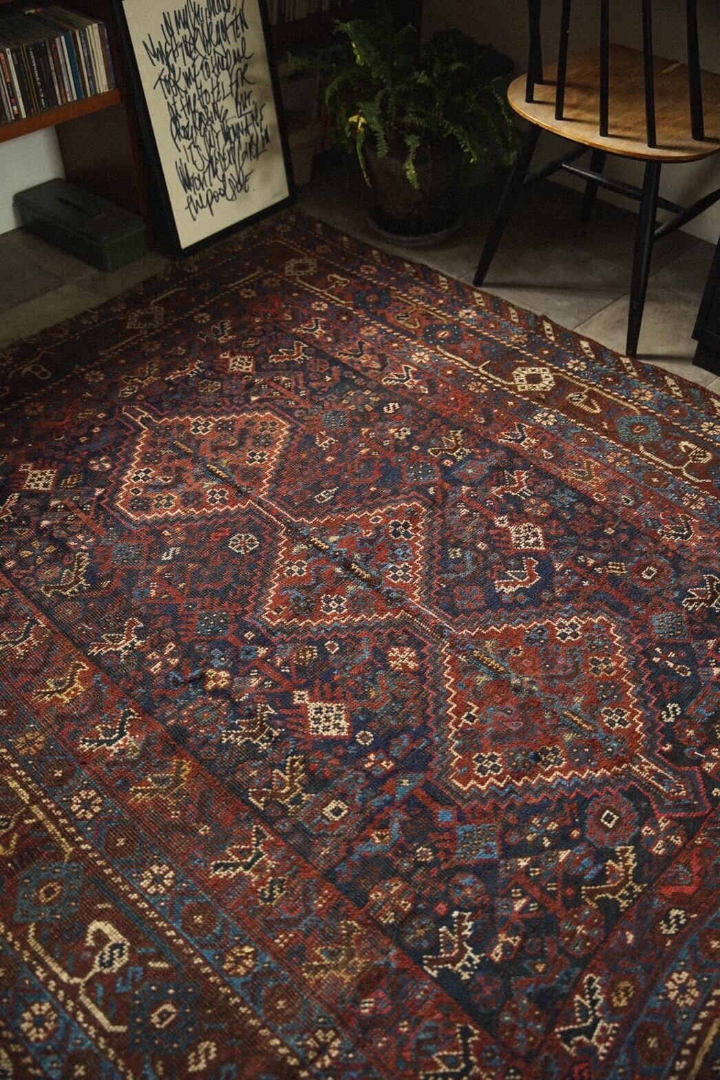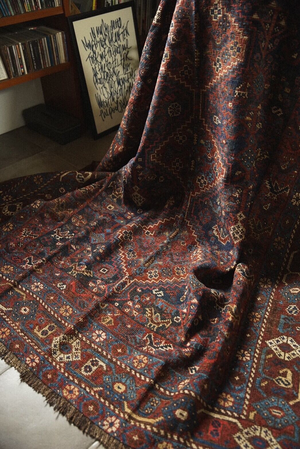 イラン南部に住むハムセ連合によるムルグ(鶏)文様がたくさん描かれた伝統的なデザインのラグ。