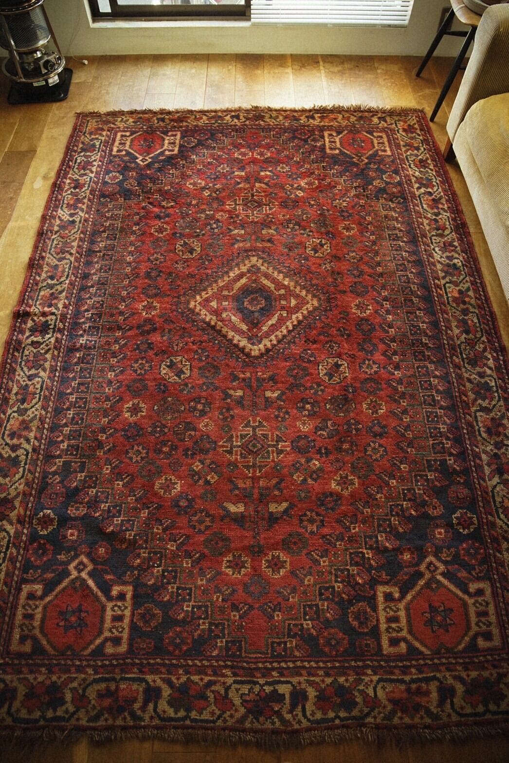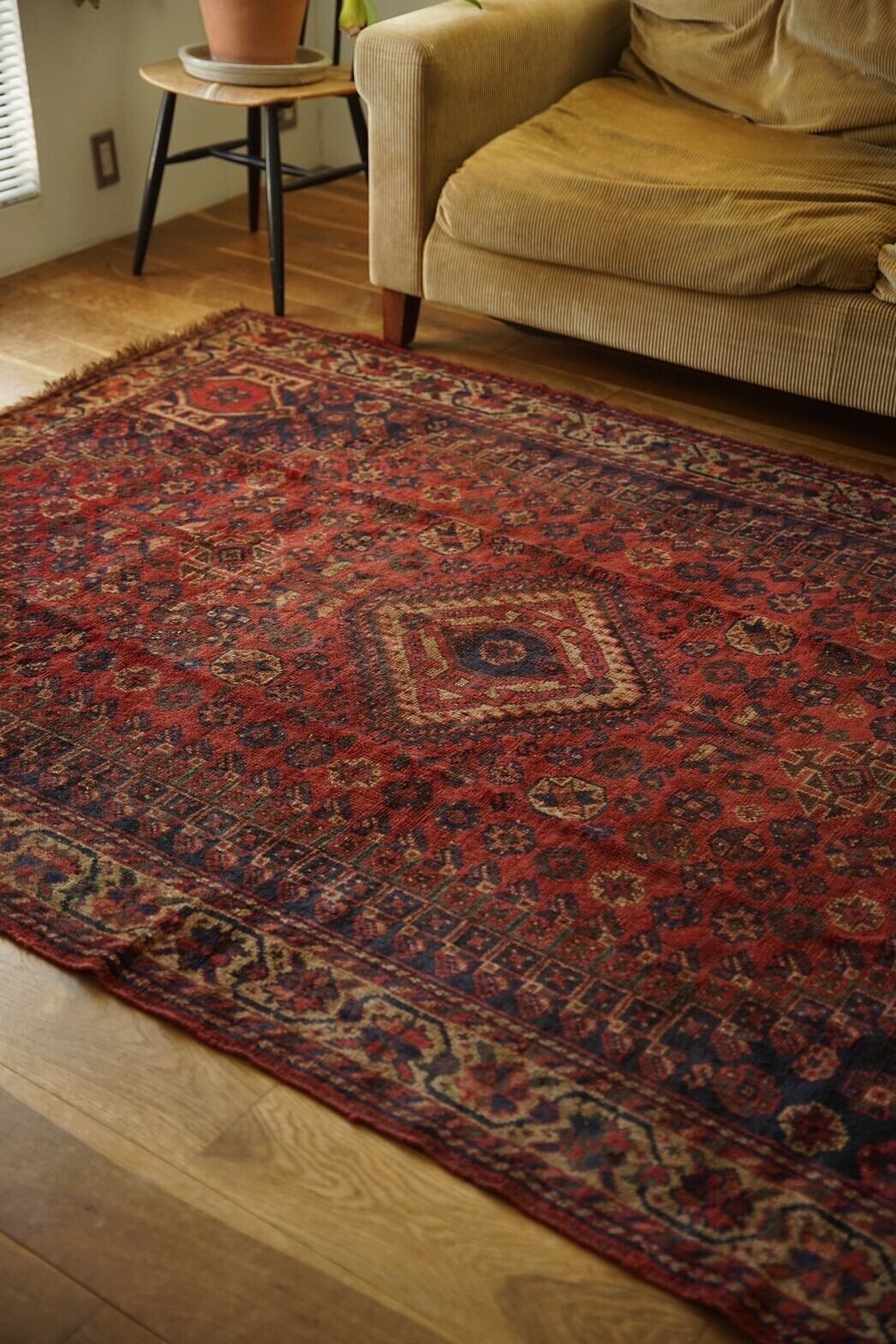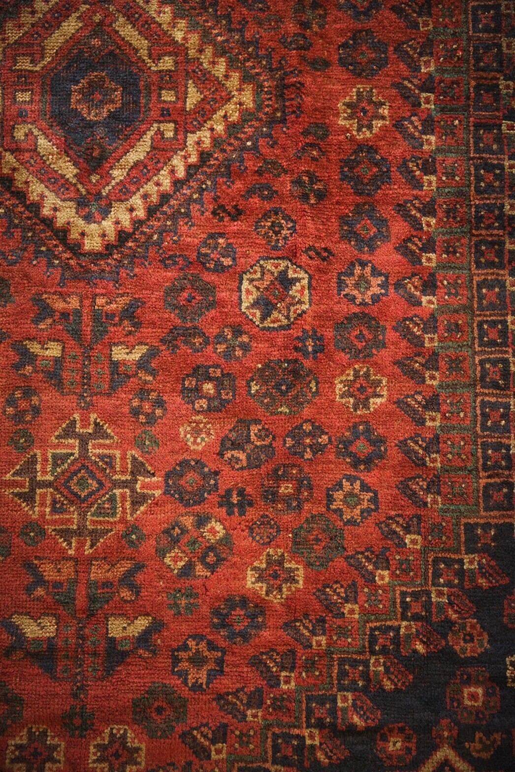 1960年代に織られた大判のカシュガイラグ。茜色のフィールドに織り込まれた沢山の文様が美しく、生き生きと描かれています。