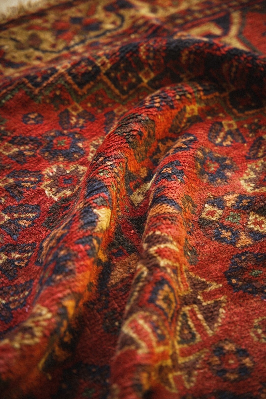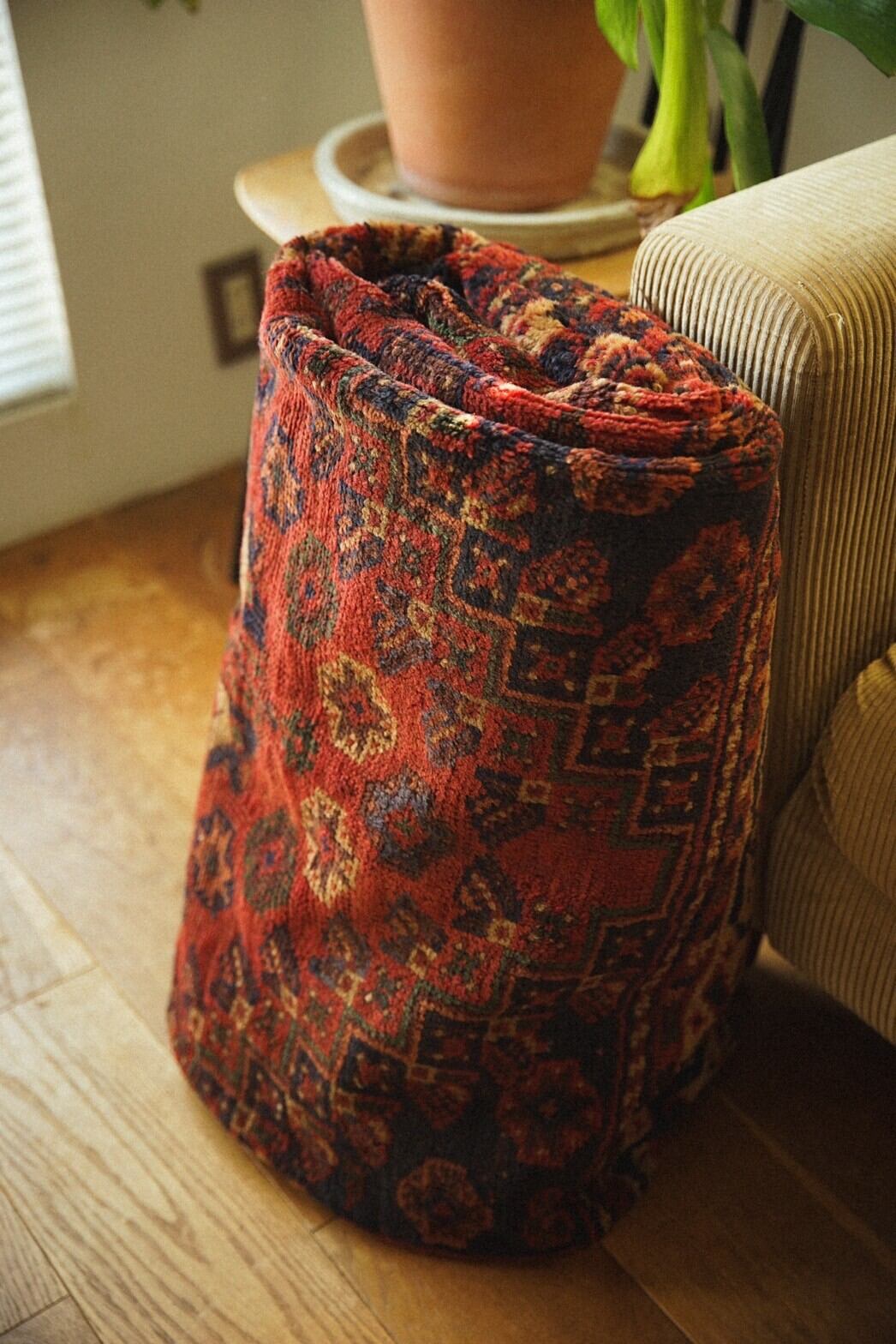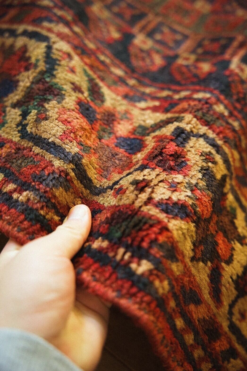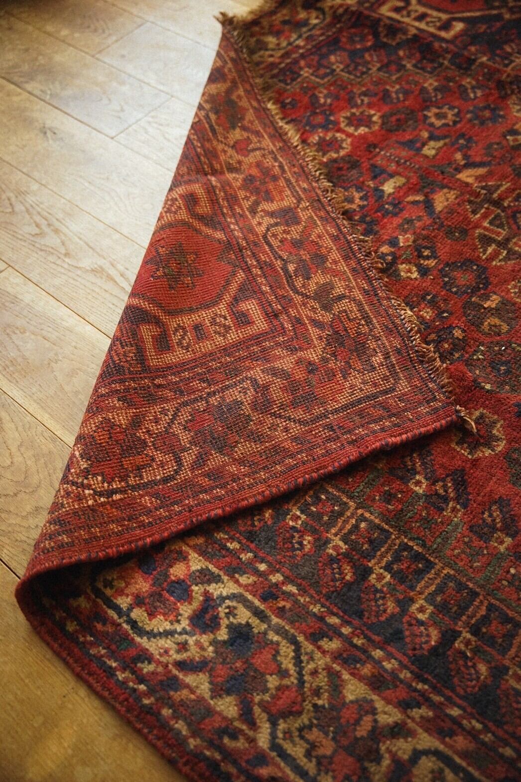 1960年代に織られた大判のカシュガイラグ。茜色のフィールドに織り込まれた沢山の文様が美しく、生き生きと描かれています。