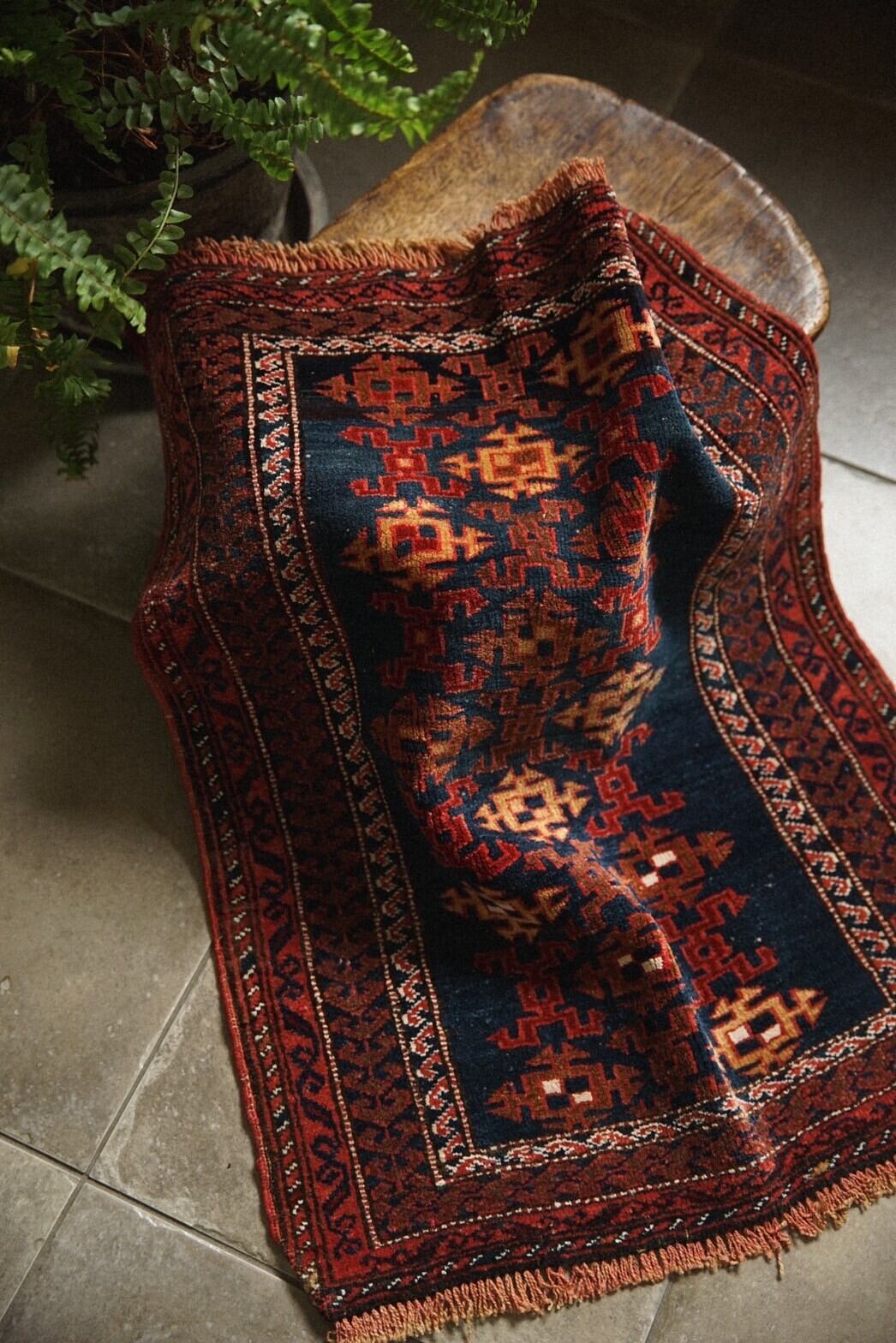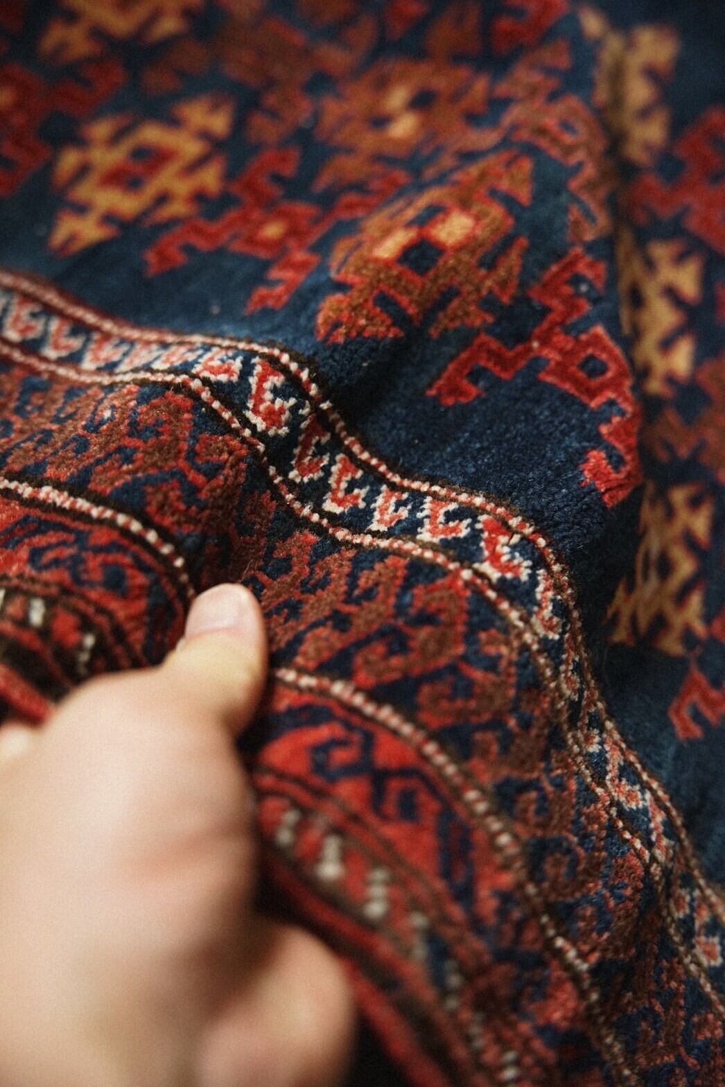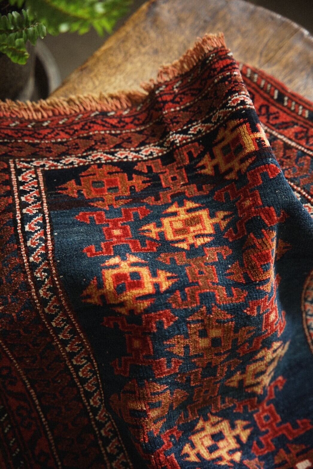 1960年代にトルクメン族によって織られたラグです。ギュル紋様が並ぶデザインで、フィールドのインディゴはアブラッシュと呼ばれるグラデーションが見られます。