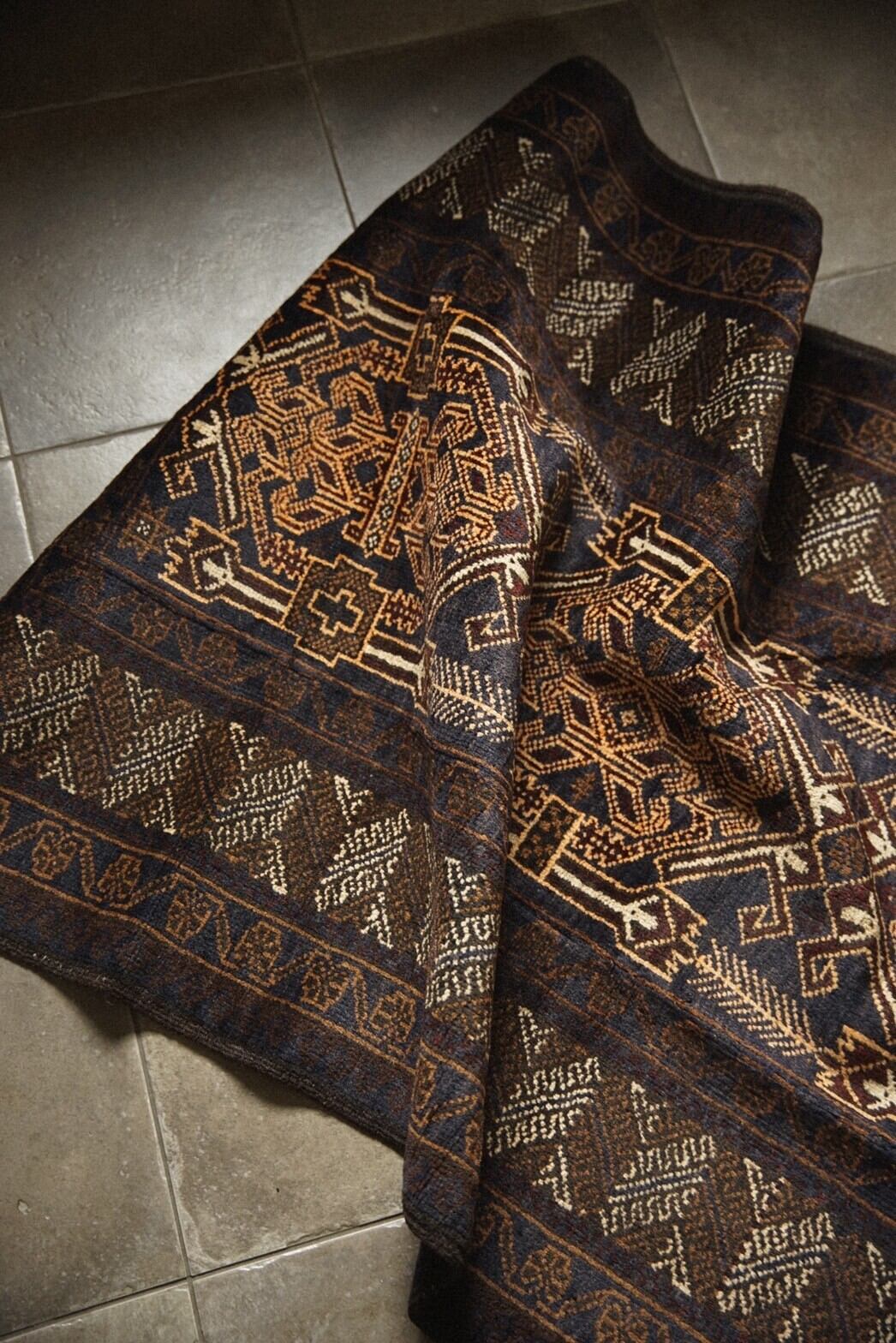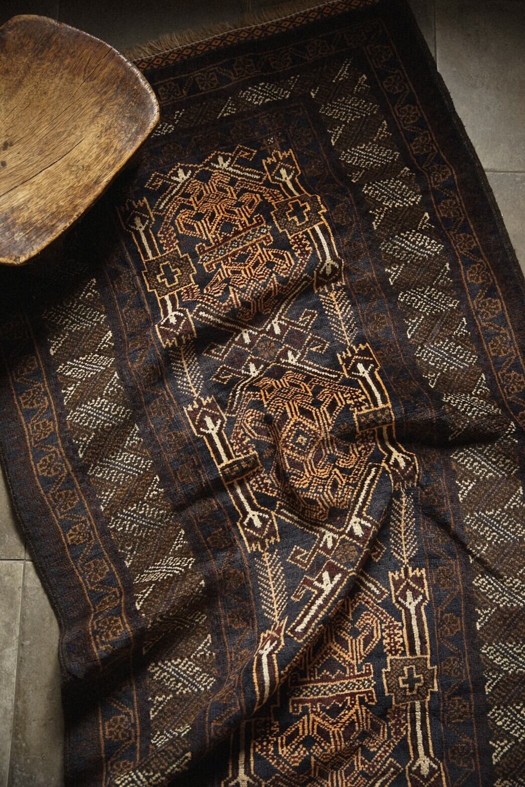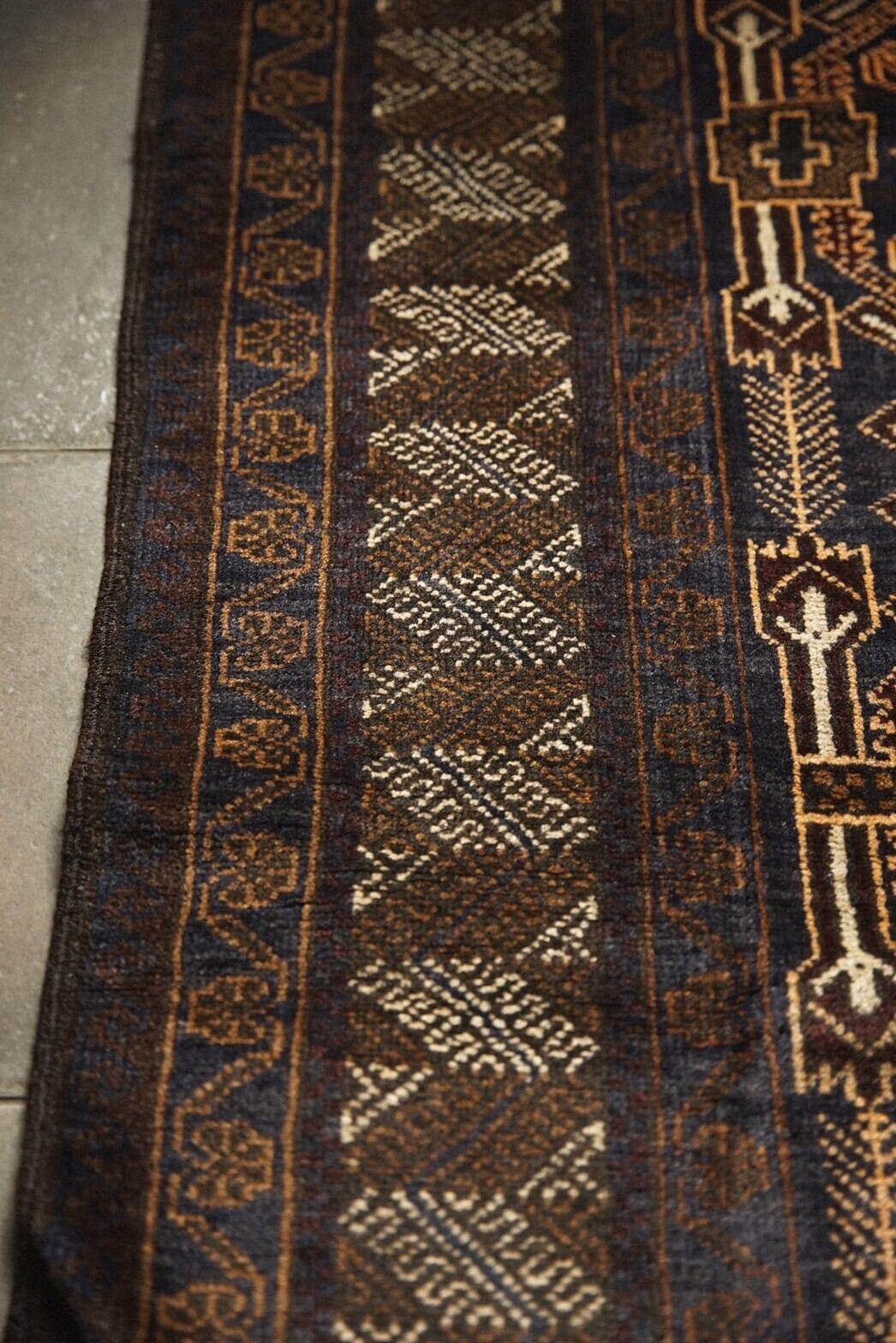 1970年代に織られたアフガニスタン産のバルーチラグ。ダークネイビー、ブラウン、ベージュ、アイボリーなど渋い色味が魅力的な一枚。