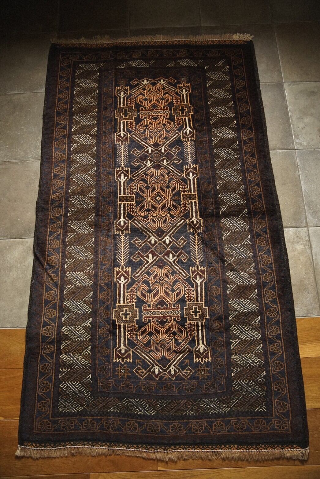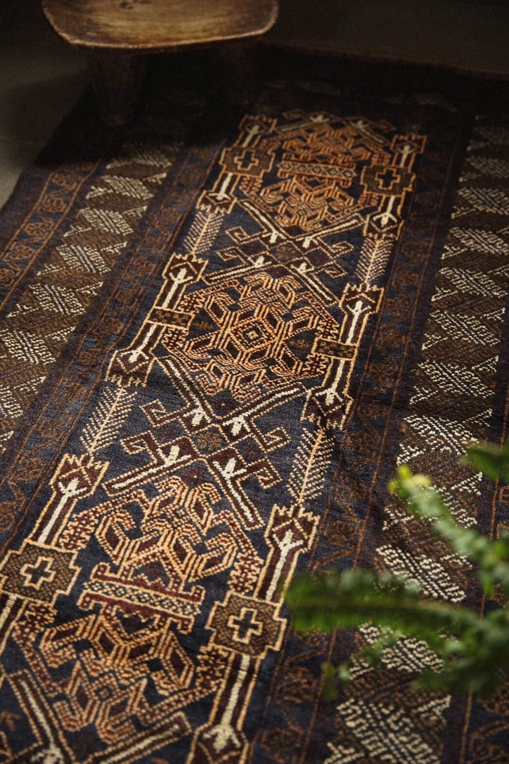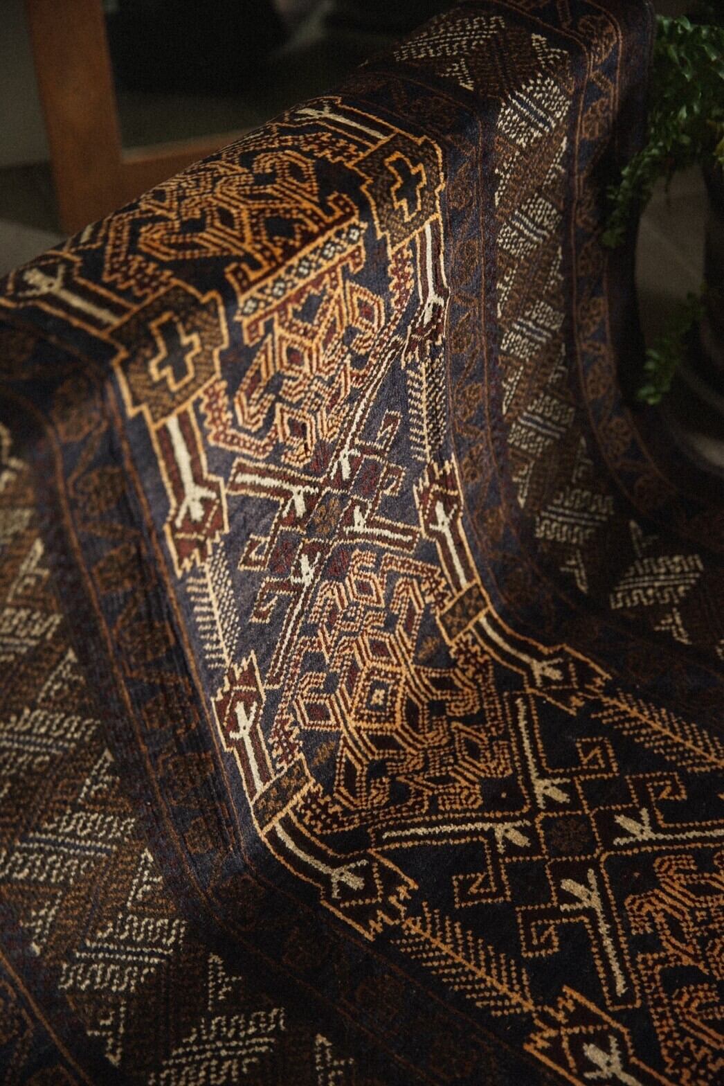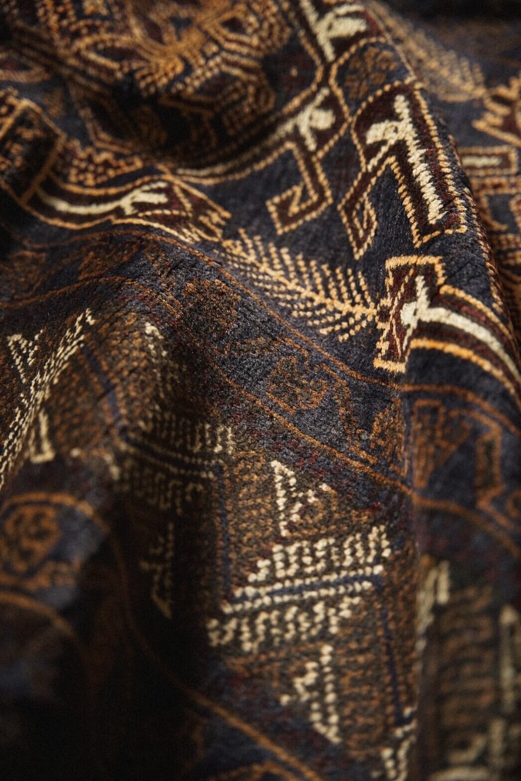 1970年代に織られたアフガニスタン産のバルーチラグ。ダークネイビー、ブラウン、ベージュ、アイボリーなど渋い色味が魅力的な一枚。