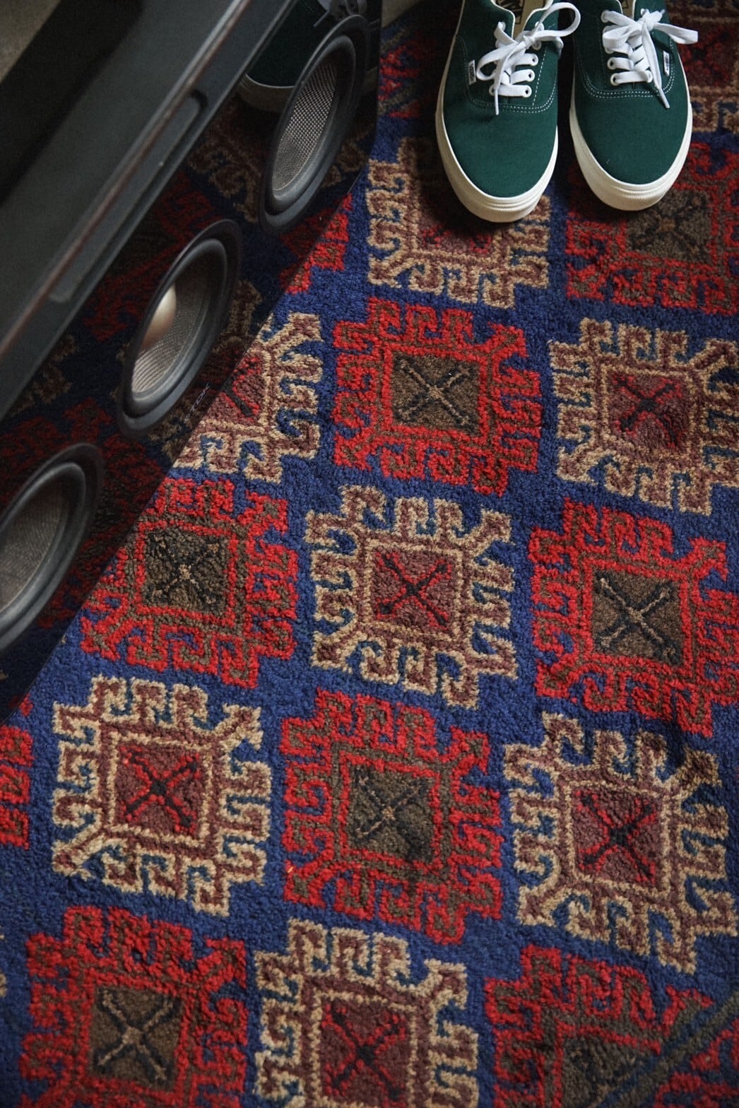 ラグ全体にはフックドメダリオンが並んだデザイン。