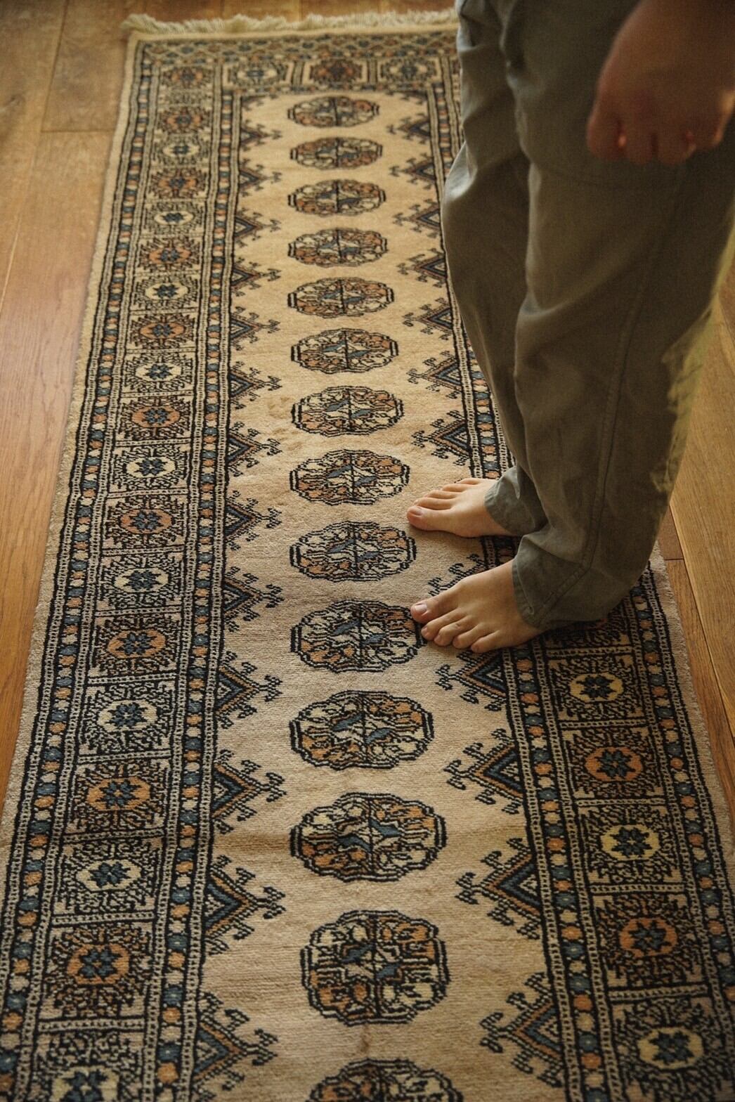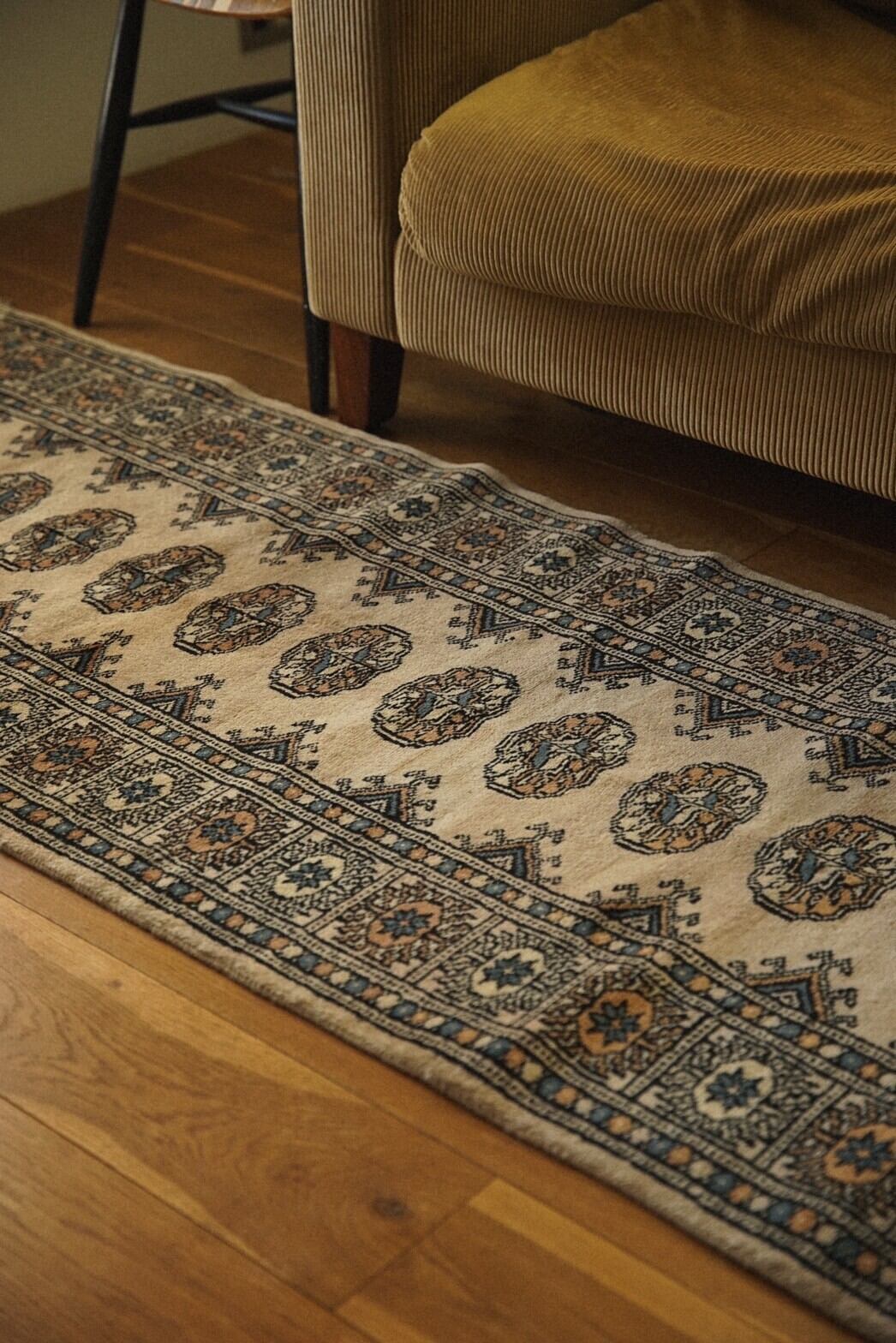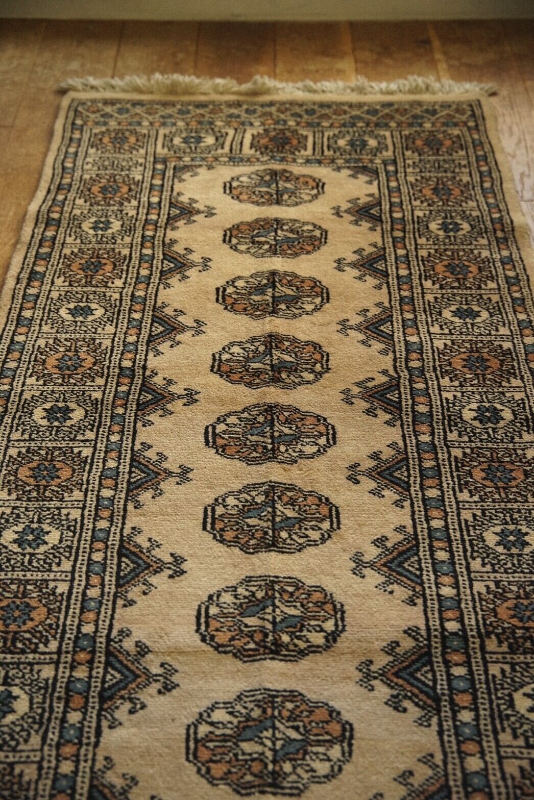経年20年程のパキスタン産のランナーラグ。アイボリーをベースカラーにアプリコット、ブルーの優しい色味がとても可愛らしい一枚。