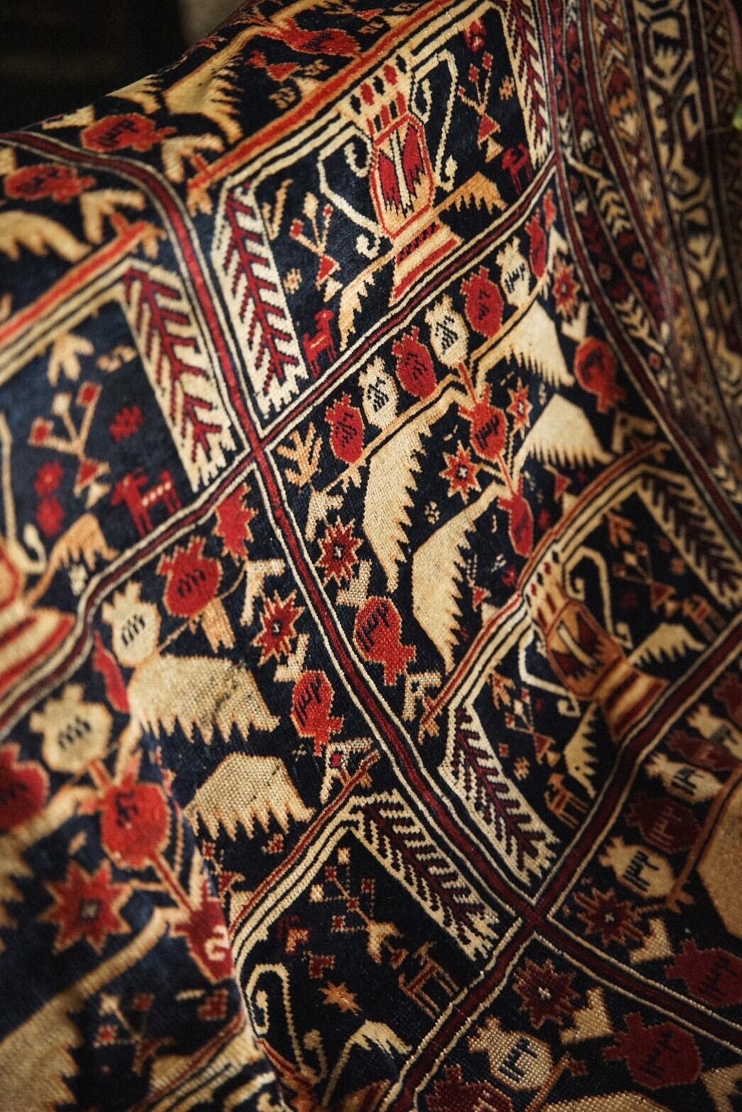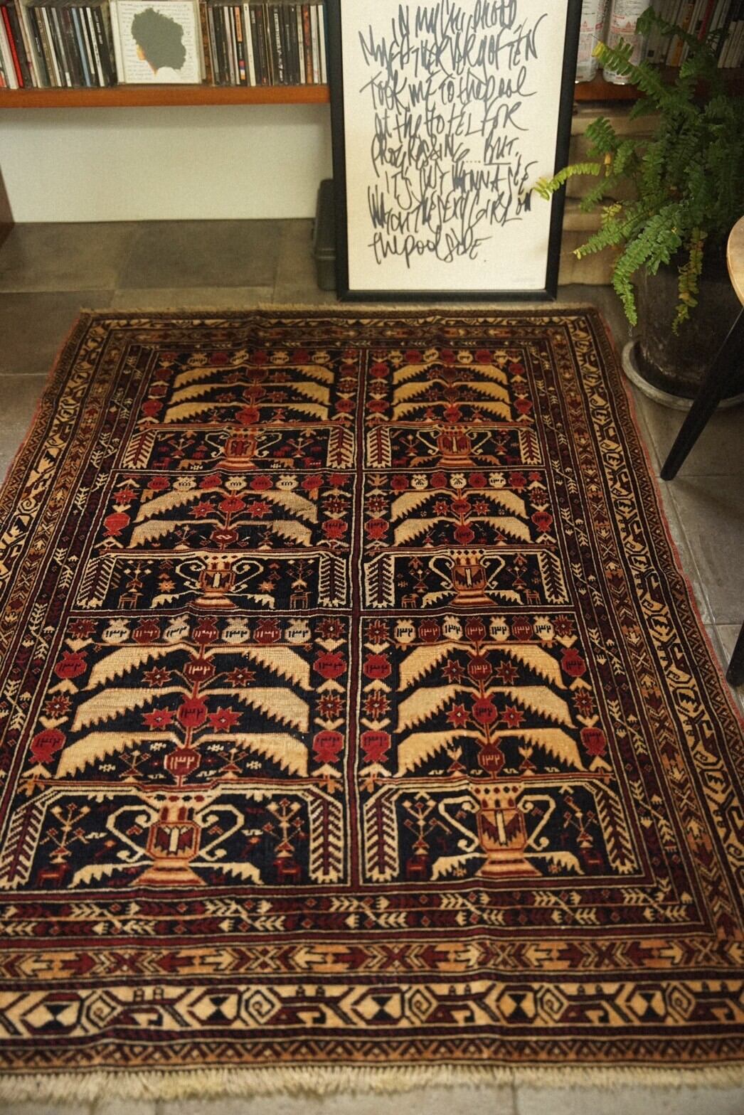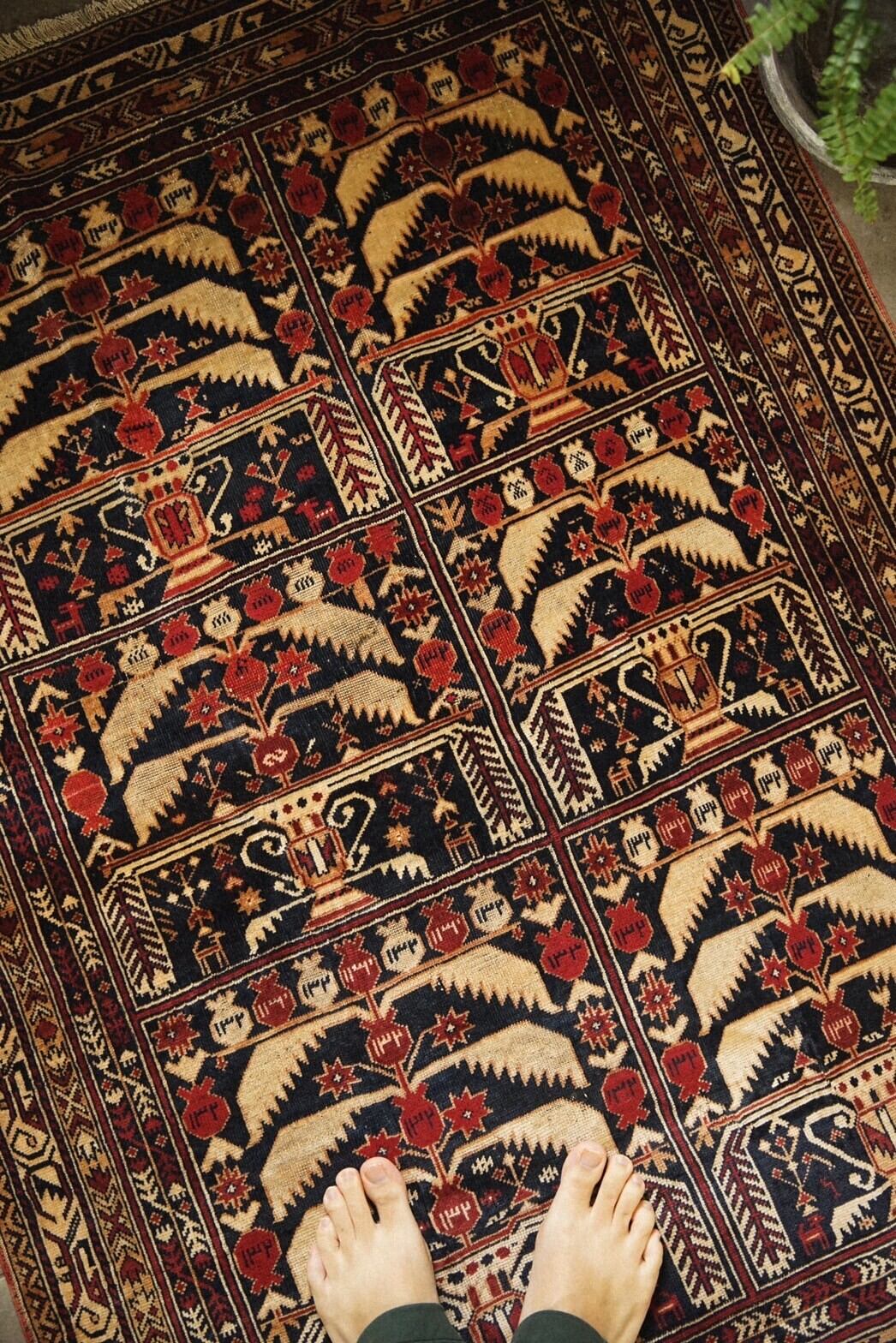 たくさんの実をつけるザクロは子孫繁栄、木の下にいる可愛いヤギや羊は遊牧民にとって大切な家族なので一家の幸せを願って織られたラグだと思われます。