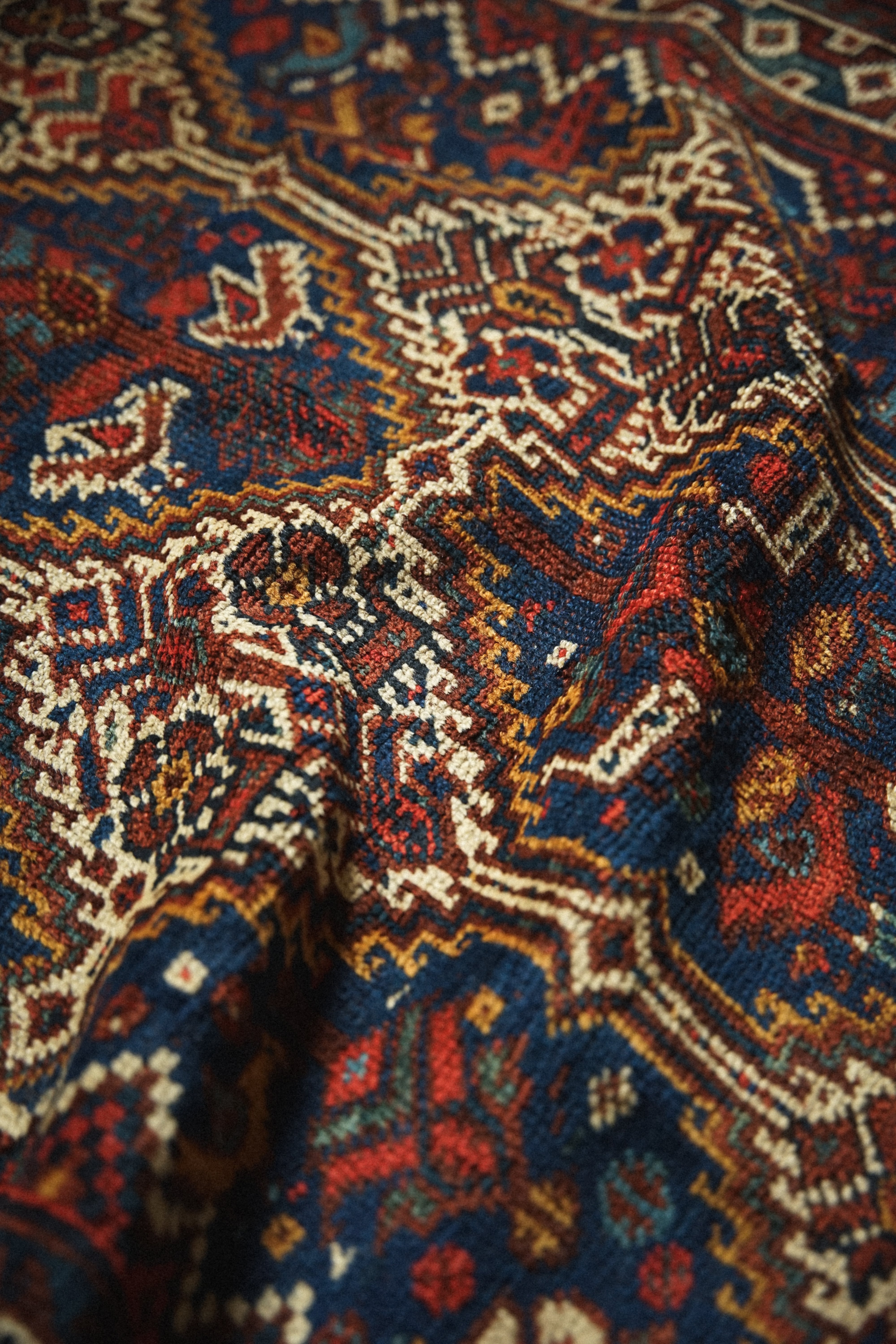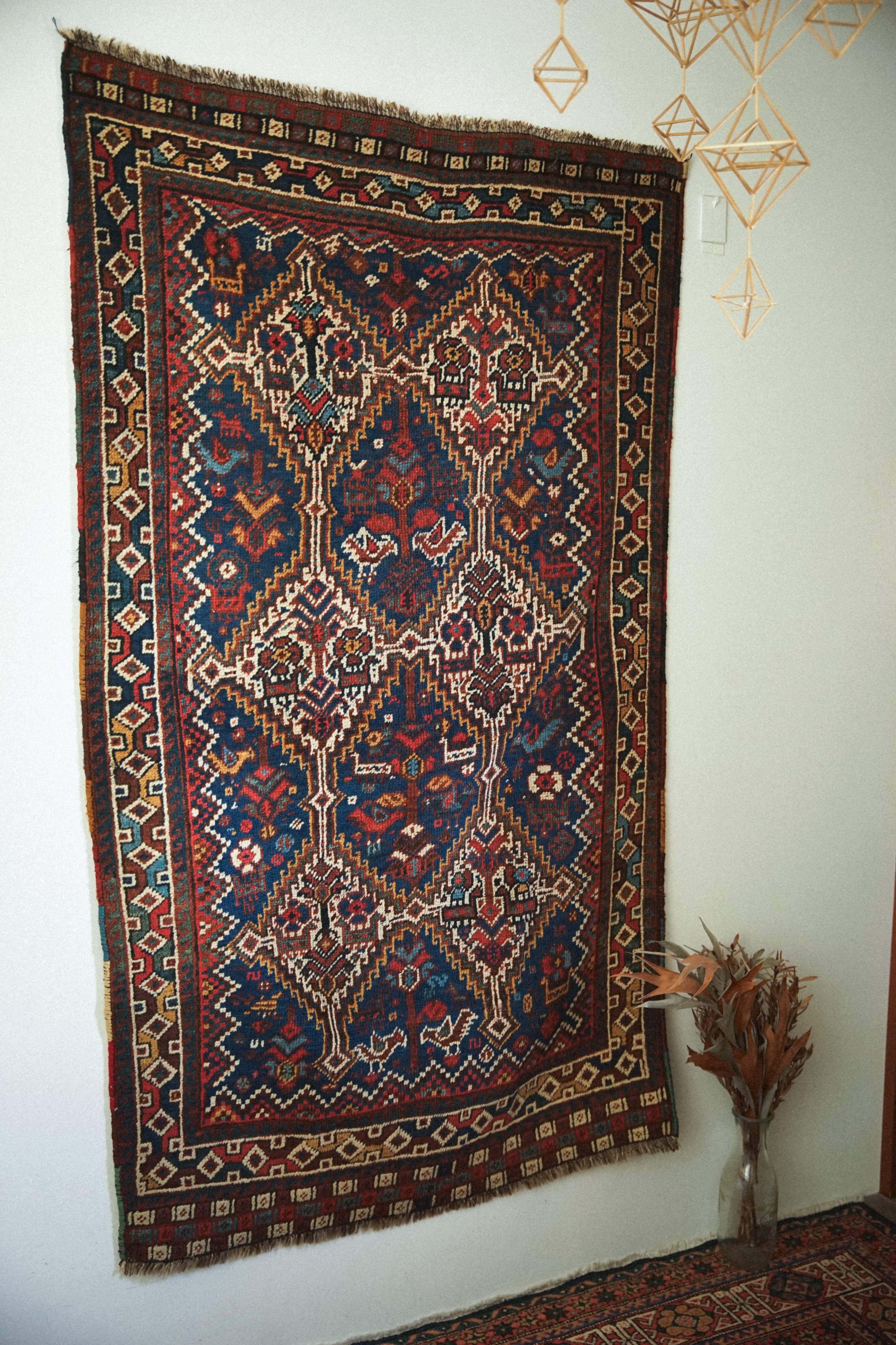 3連メダリオンが2列並び、フィールドは深みのあるインディゴに生命の樹や花、鳥、動物など部族の伝統的なモチーフがたくさん織り込まれています。