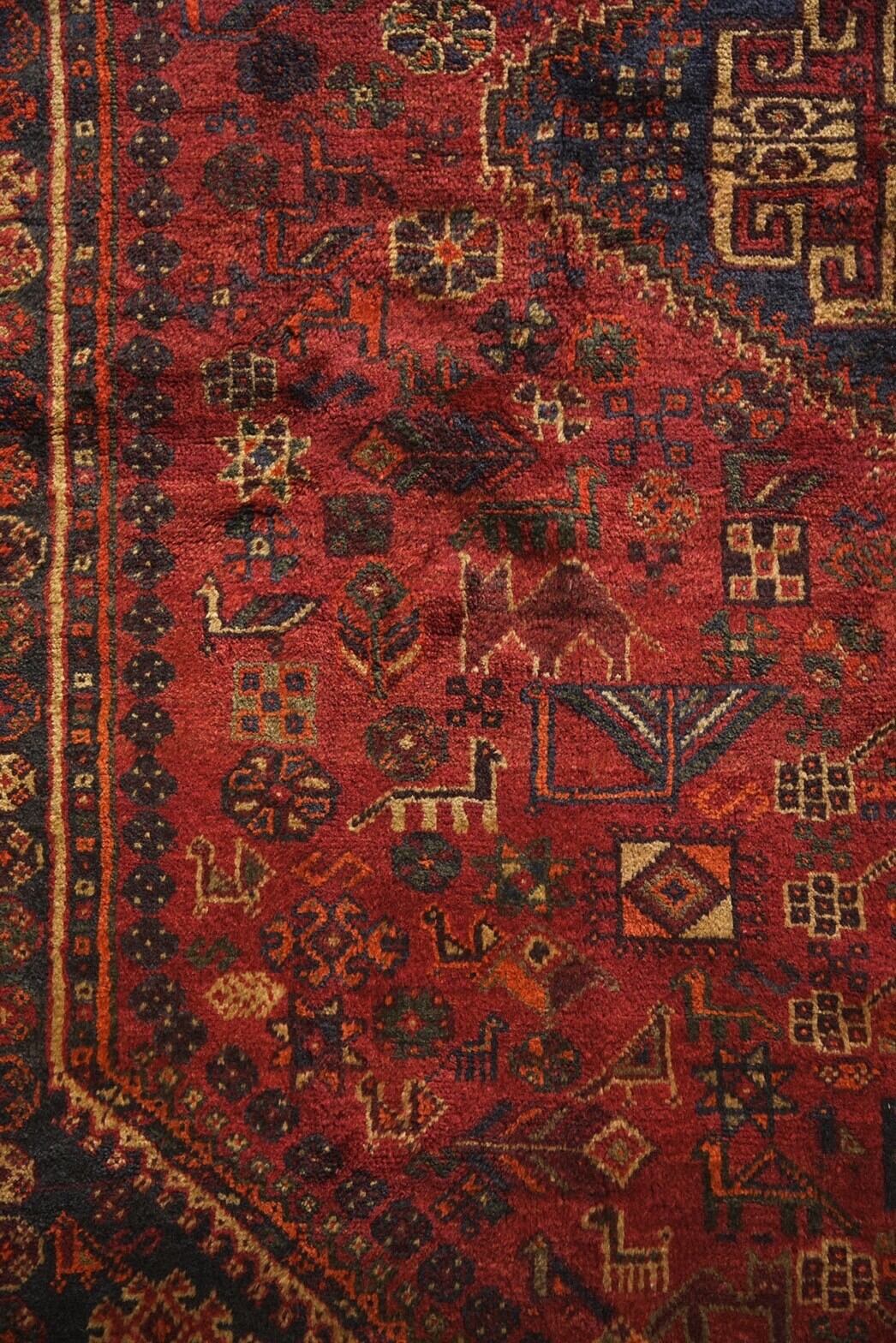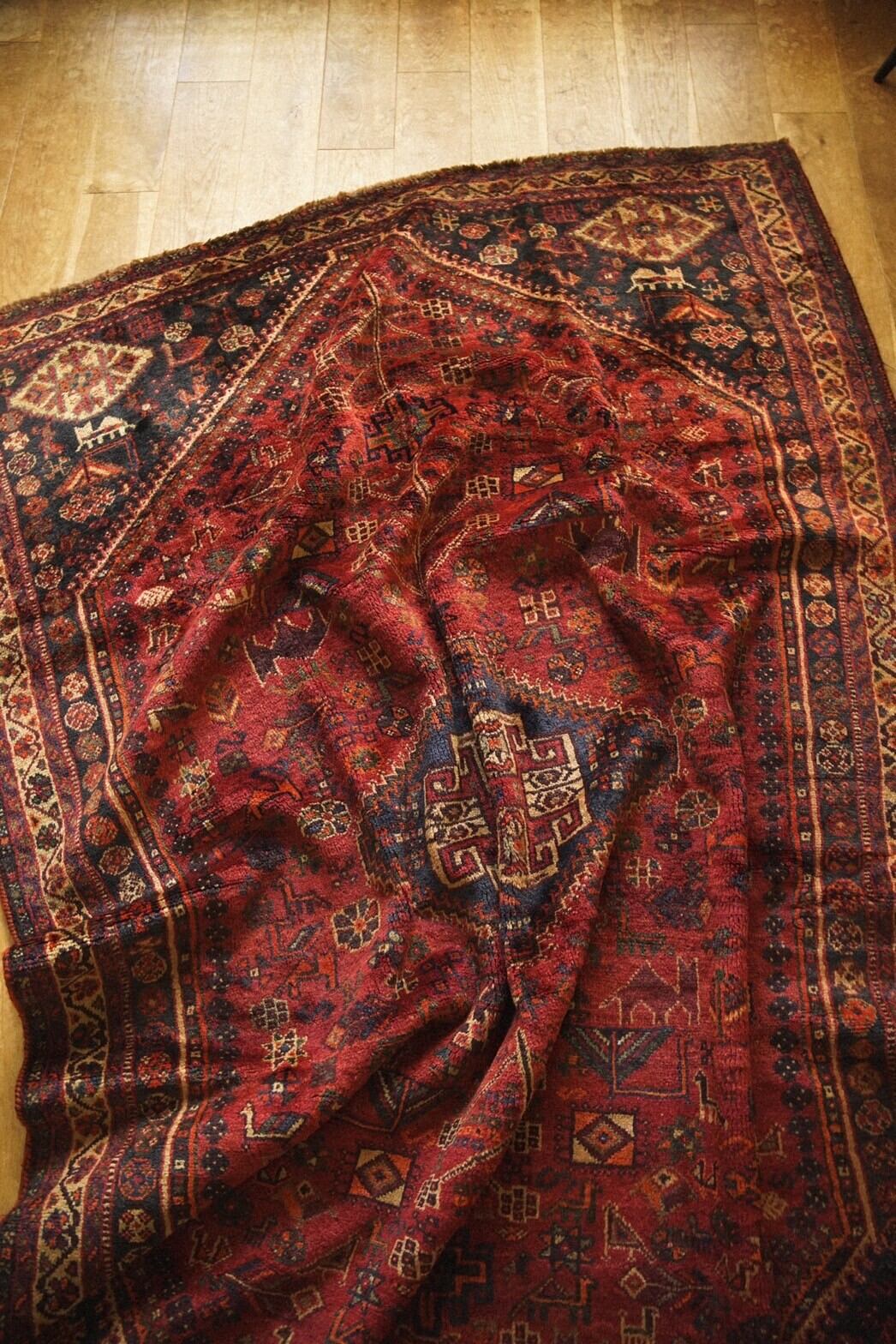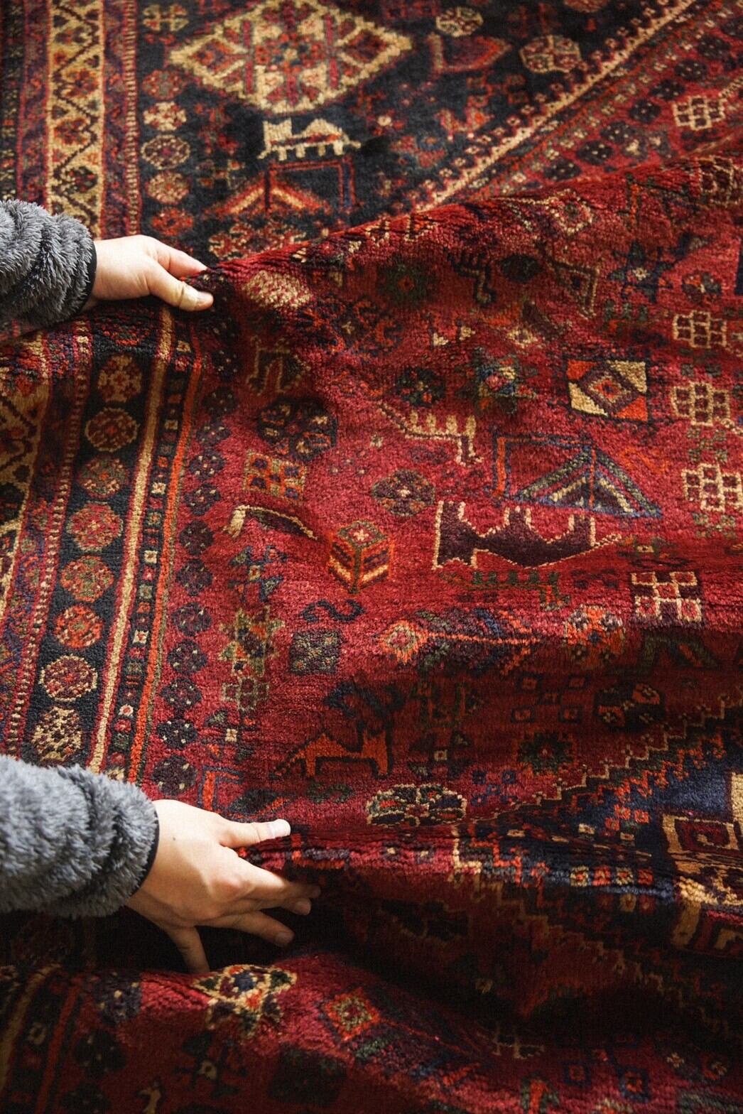 落ち着いた赤系の色味をベースに草花や木、鳥や動物など眩いばかりに散りばめられたカシュガイ族の伝統的なモチーフが並ぶ華やかな一枚。