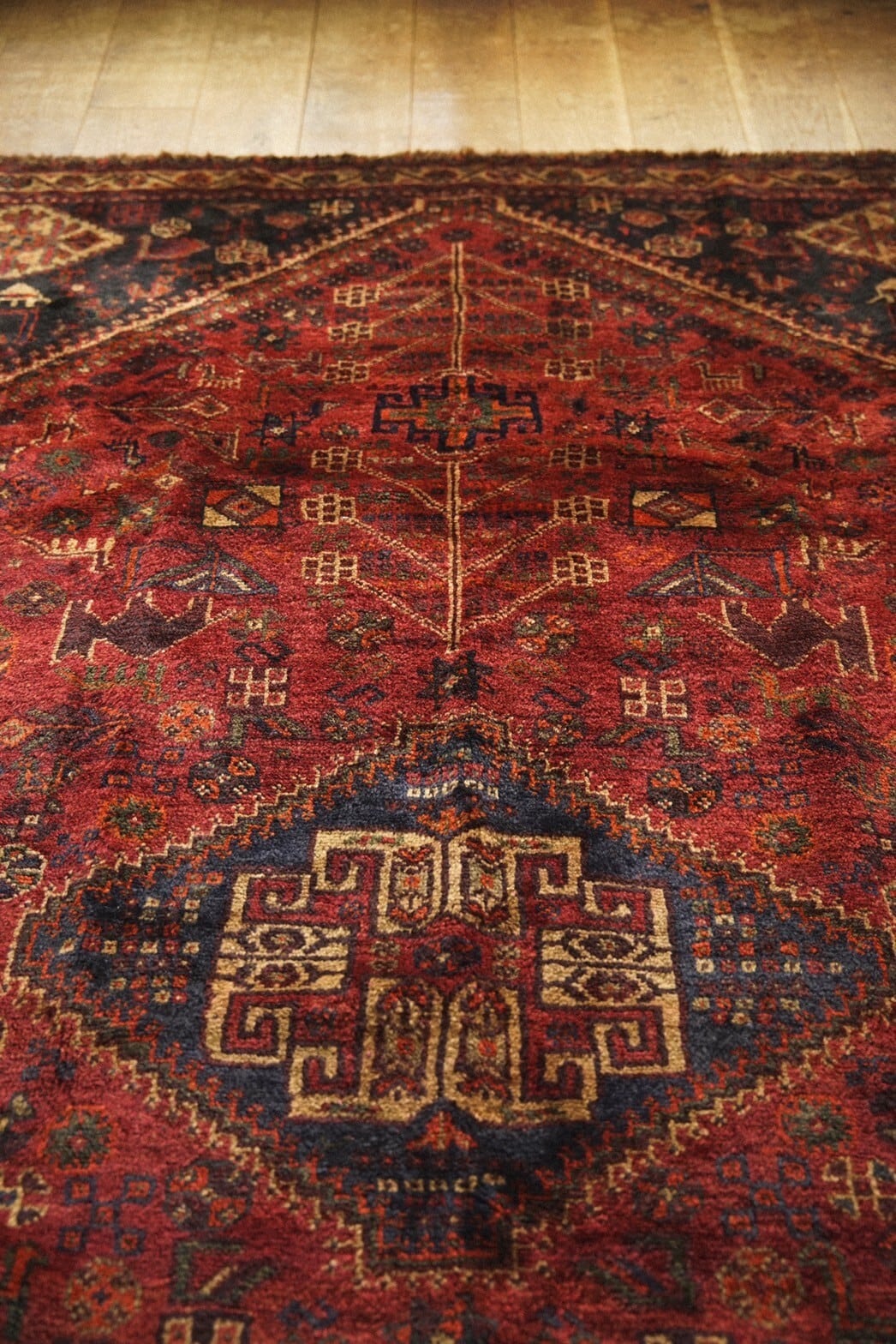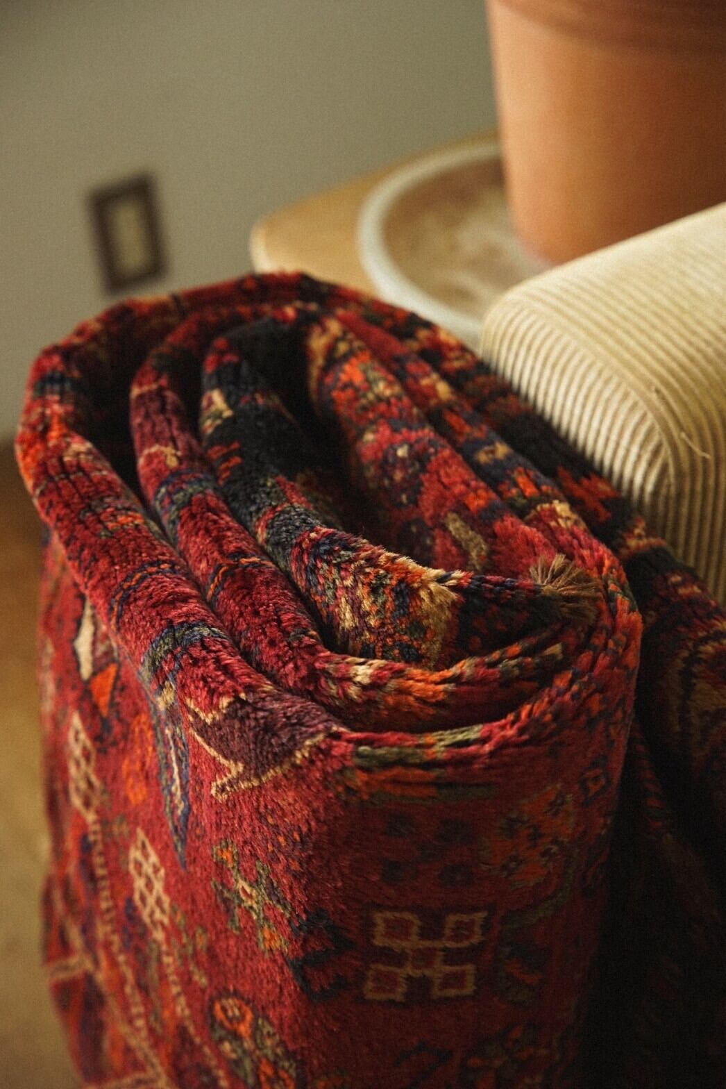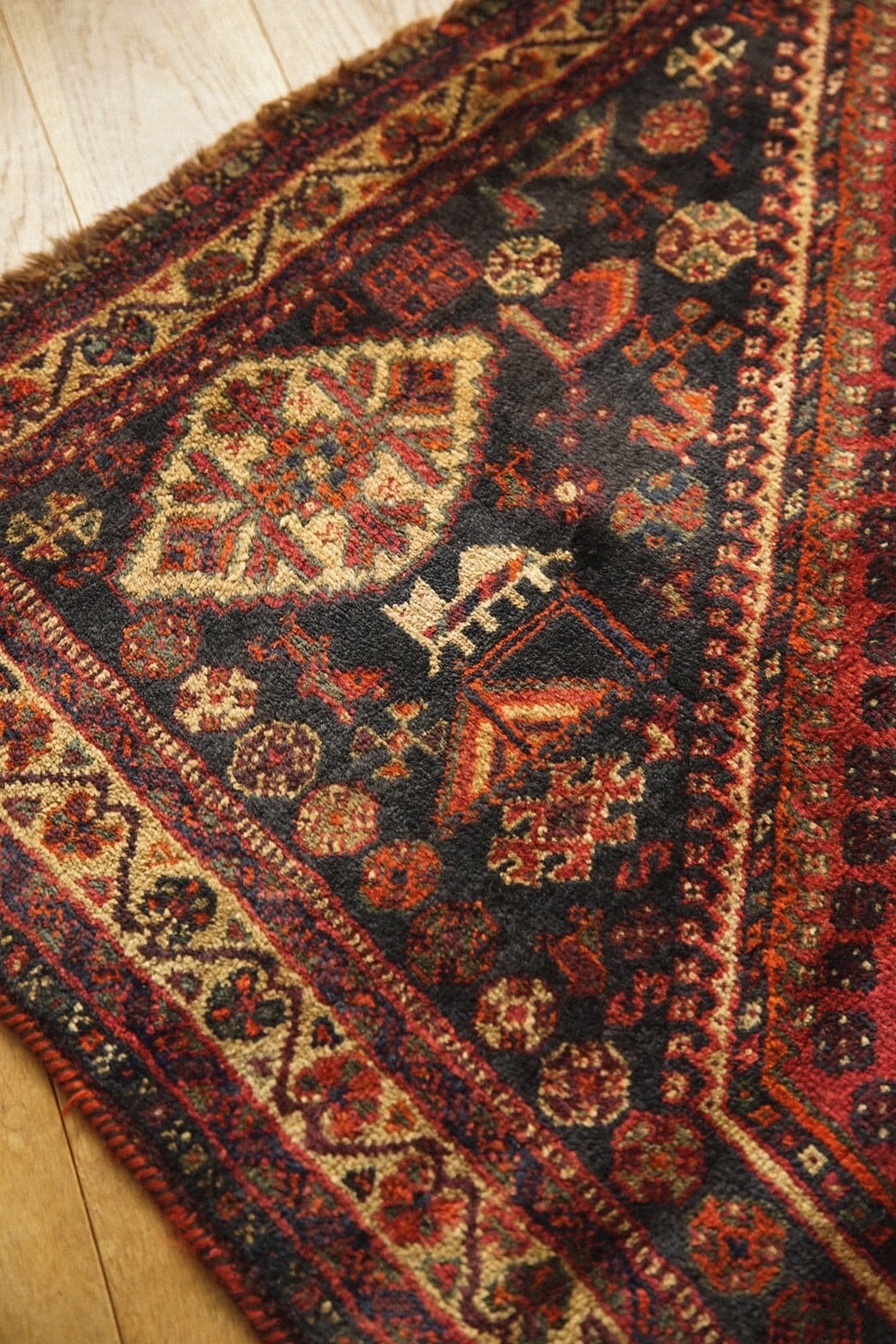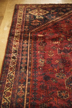 落ち着いた赤系の色味をベースに草花や木、鳥や動物など眩いばかりに散りばめられたカシュガイ族の伝統的なモチーフが並ぶ華やかな一枚。