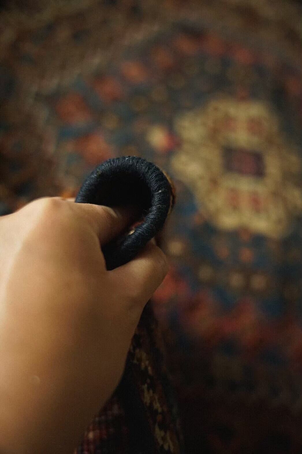ブラウンとネイビーベースの落ち着いた色合いが珍しい渋めのラグ。