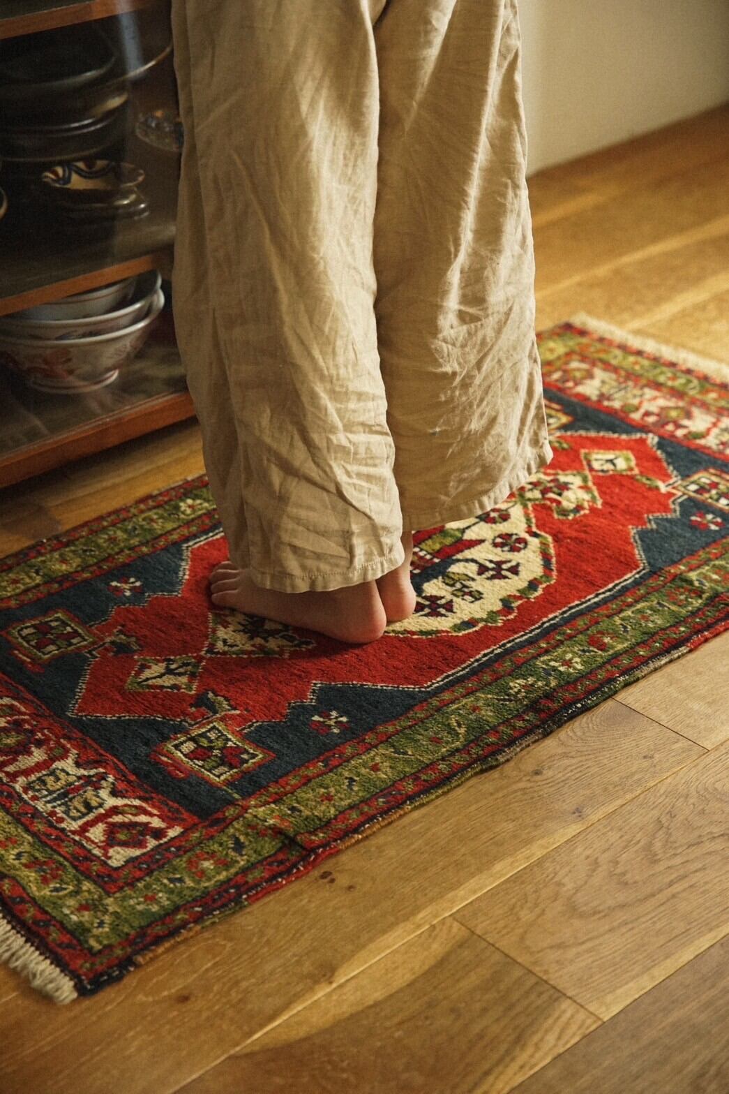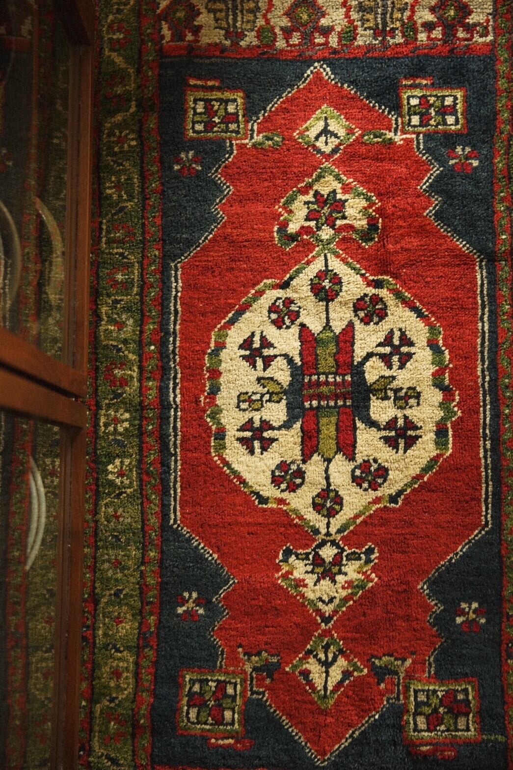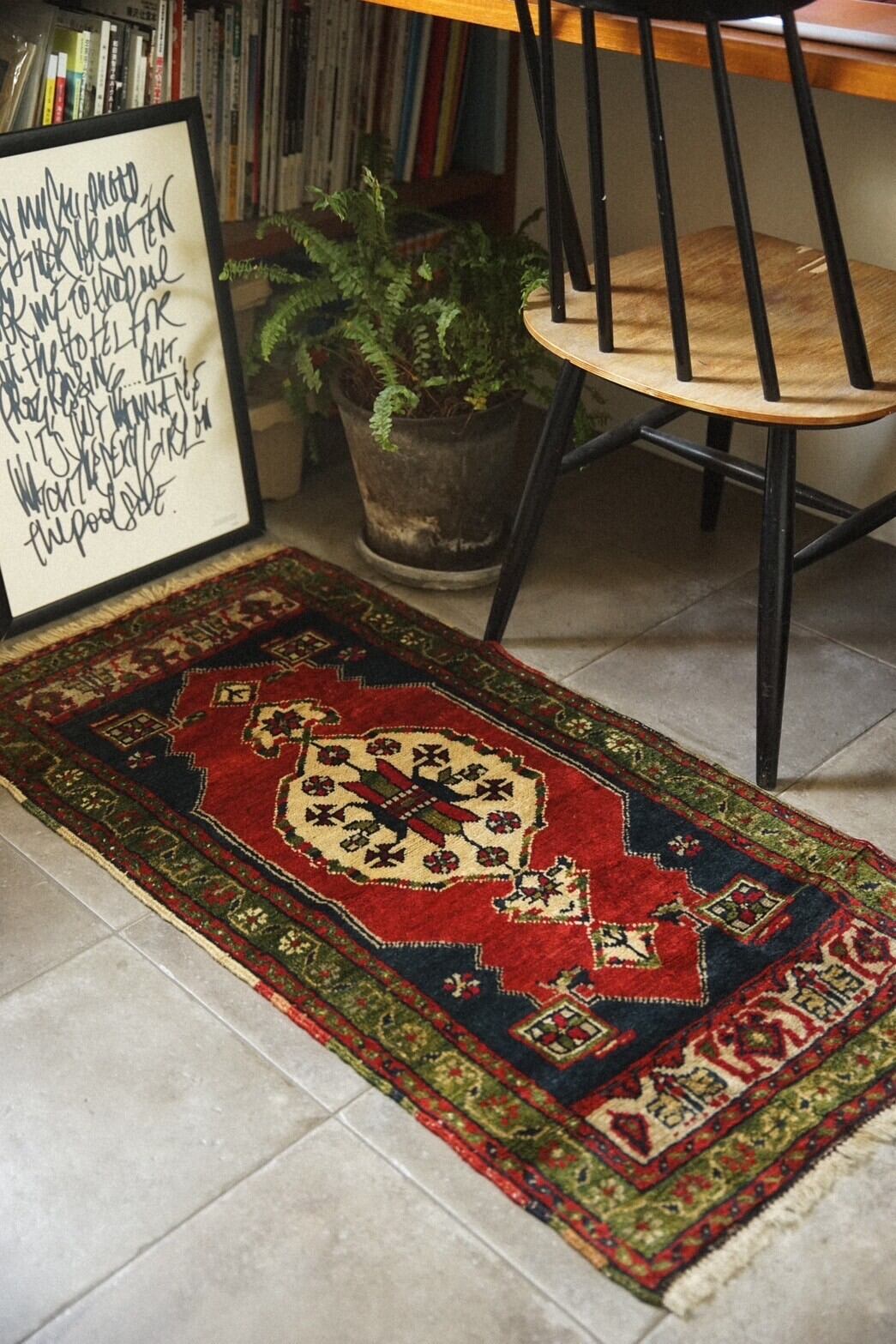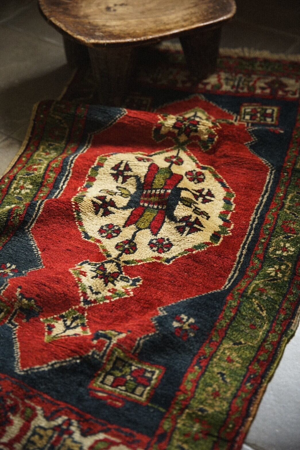 トルコのアナトリア地方で織られたヤストゥク(枕)と呼ばれる袋状のものの裏面を外して1枚のラグに仕立ててもらいました。