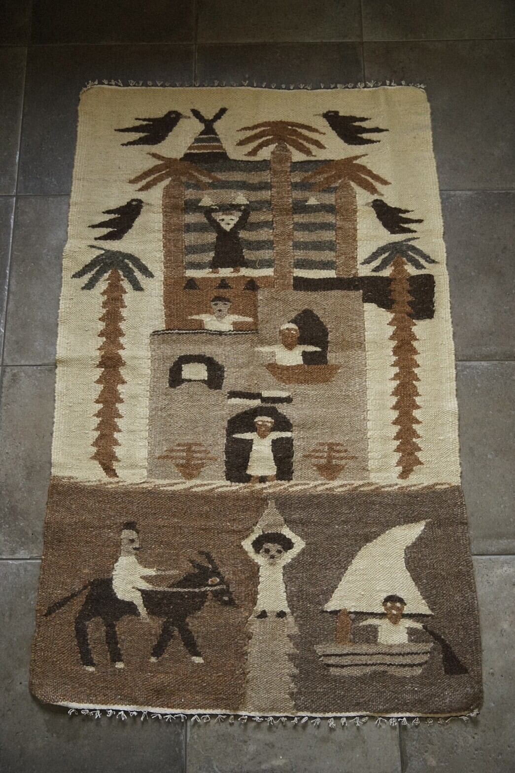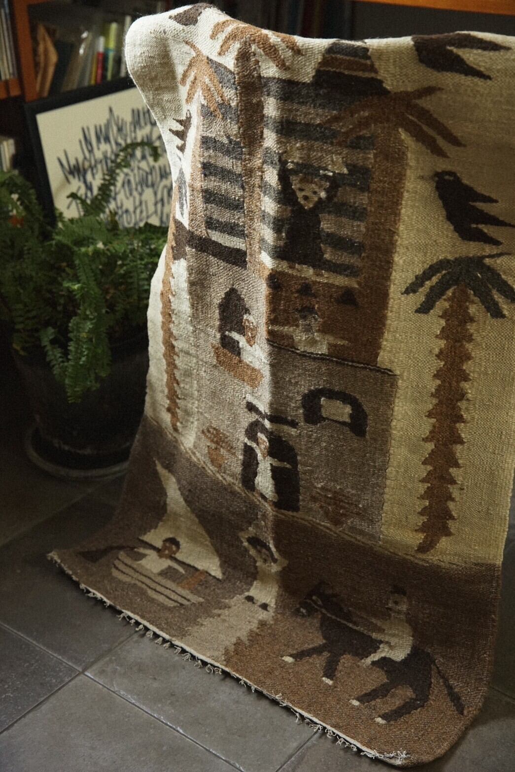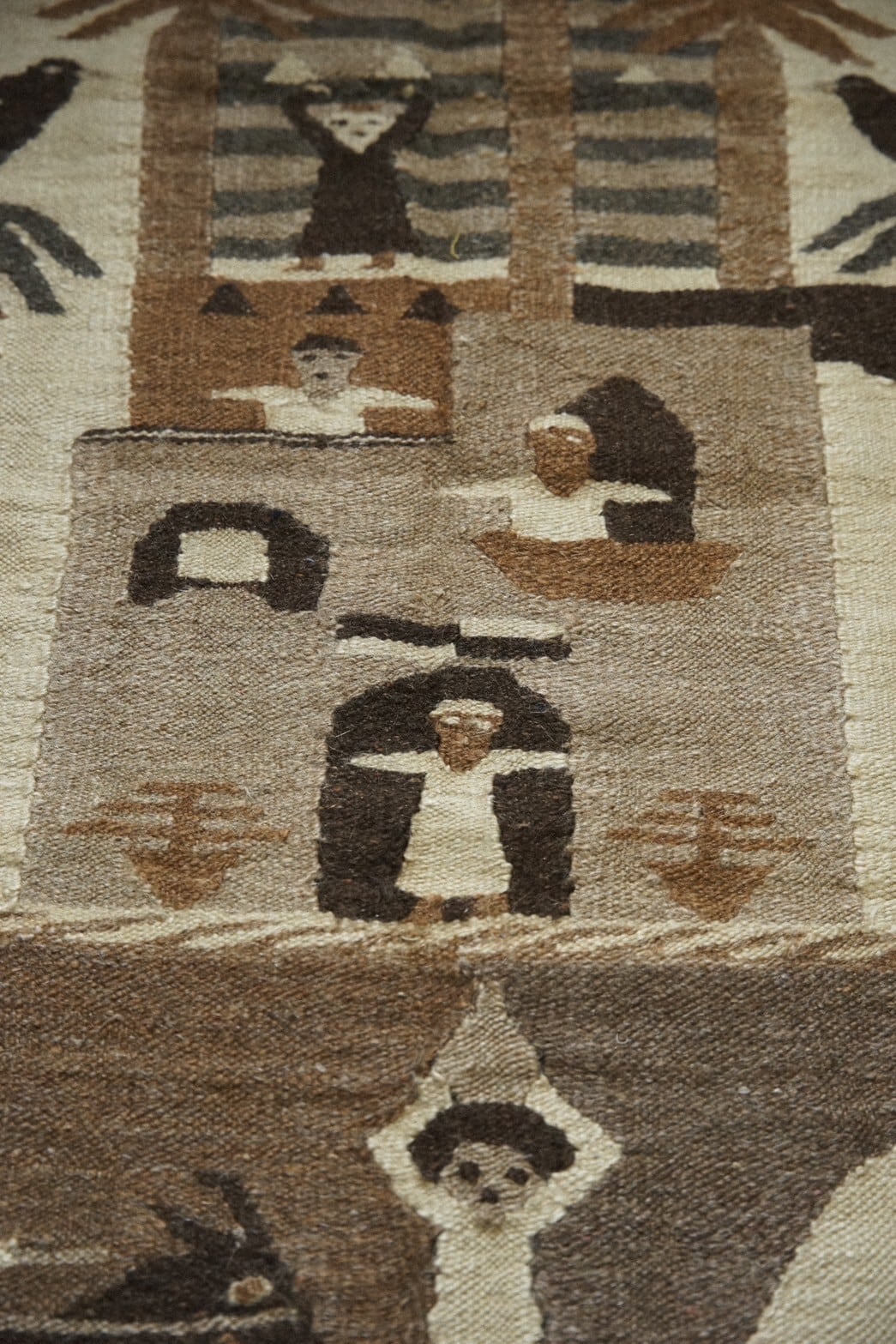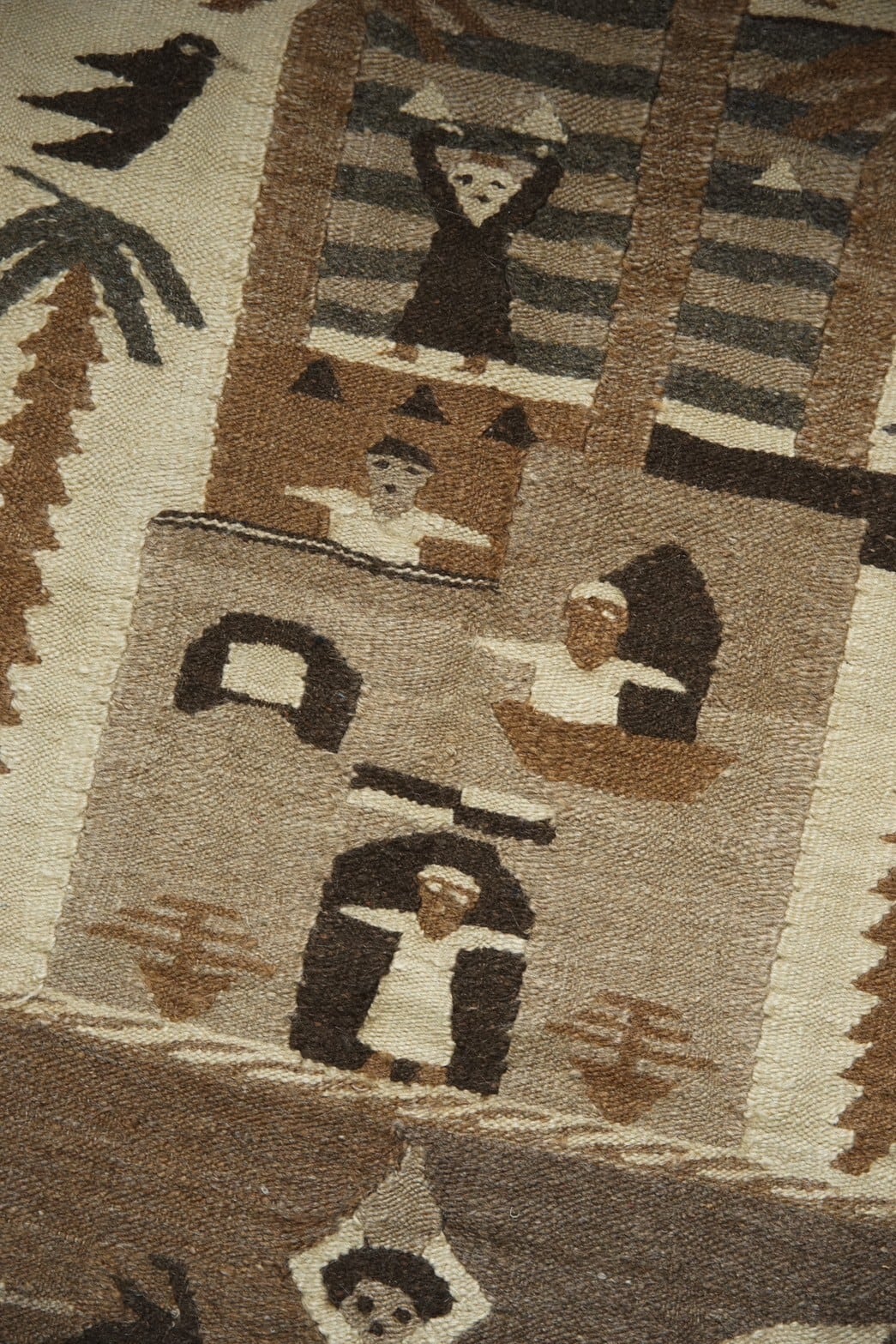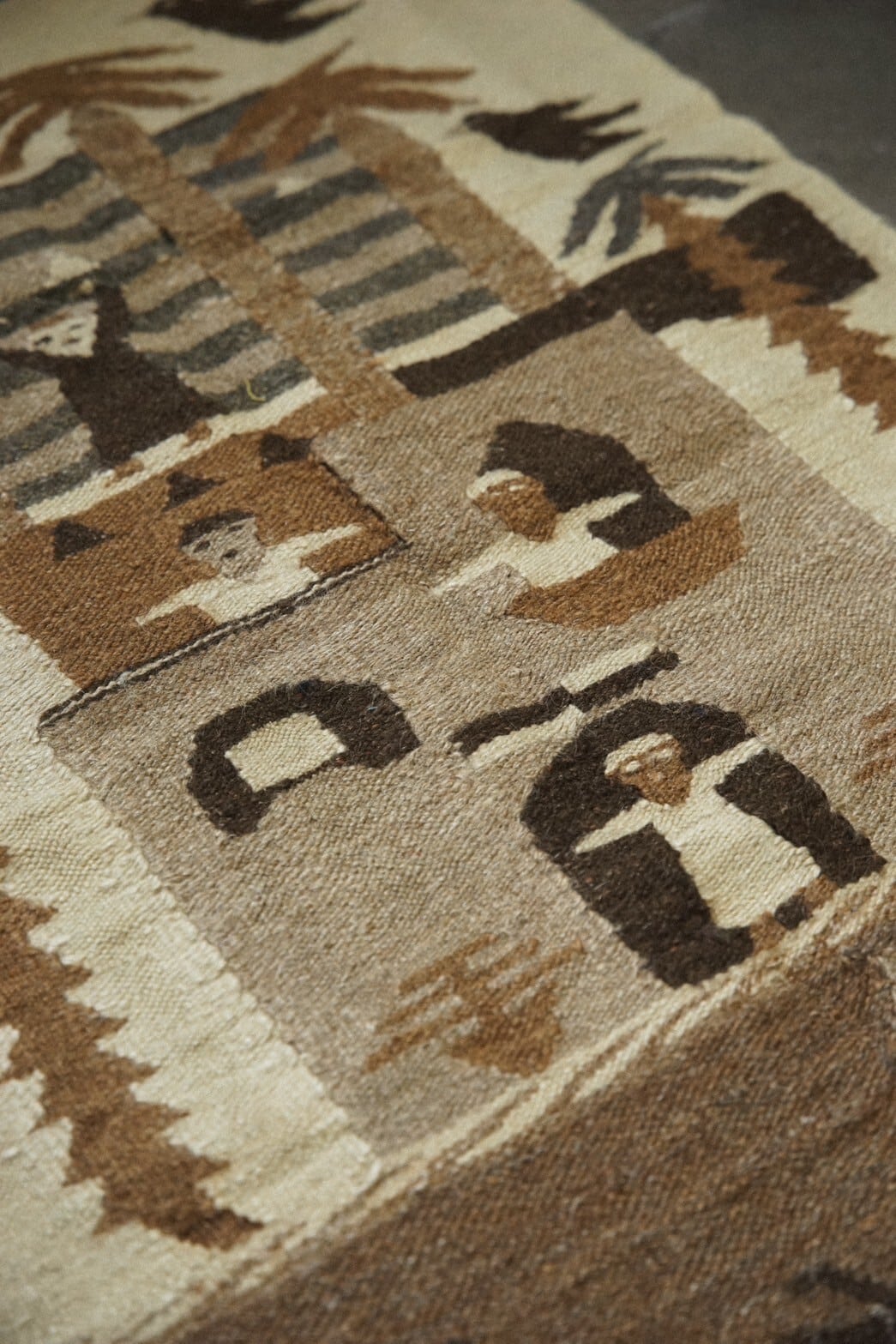 人々の生活風景を絵画のように描かれたピクトリアルデザインのキリム。