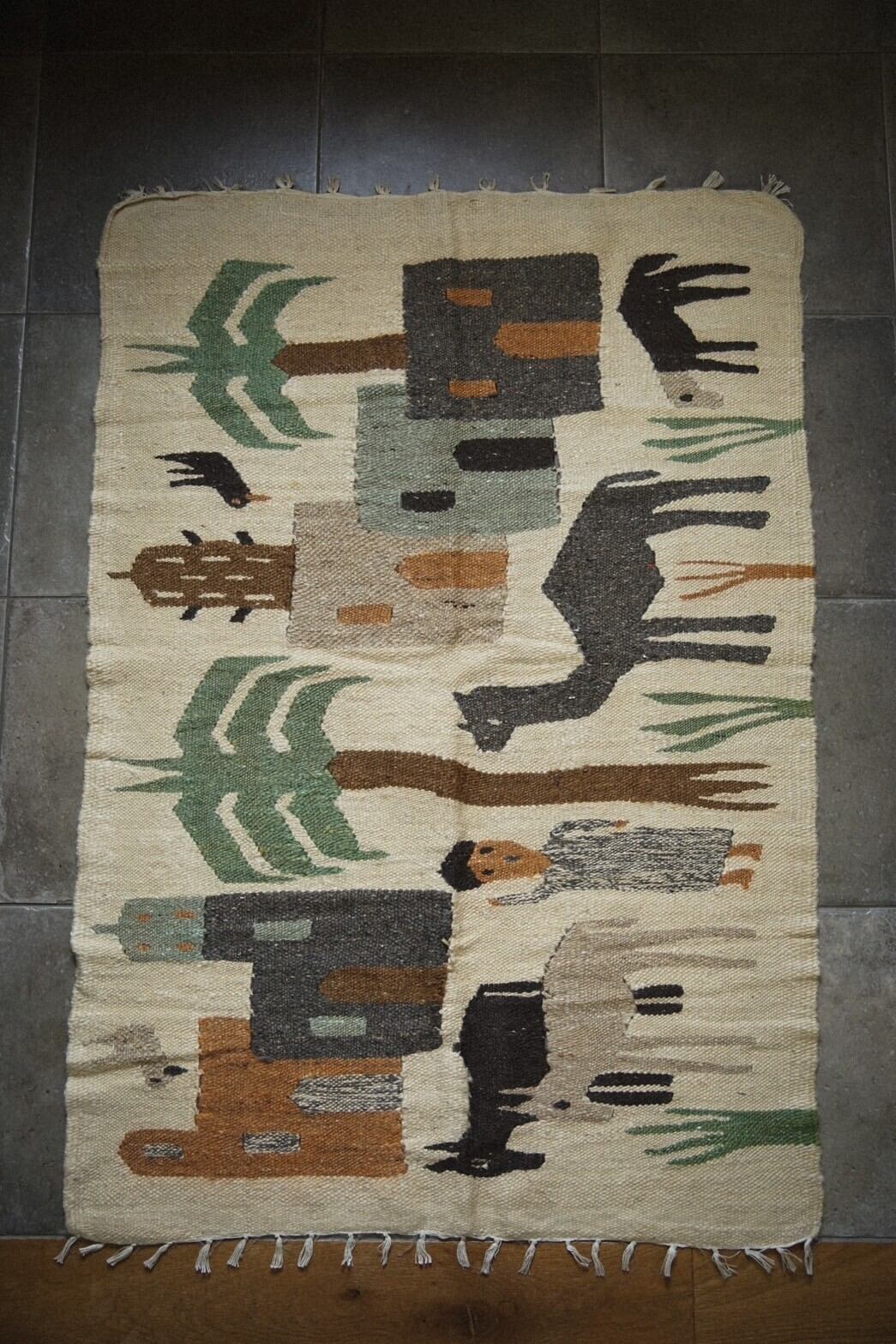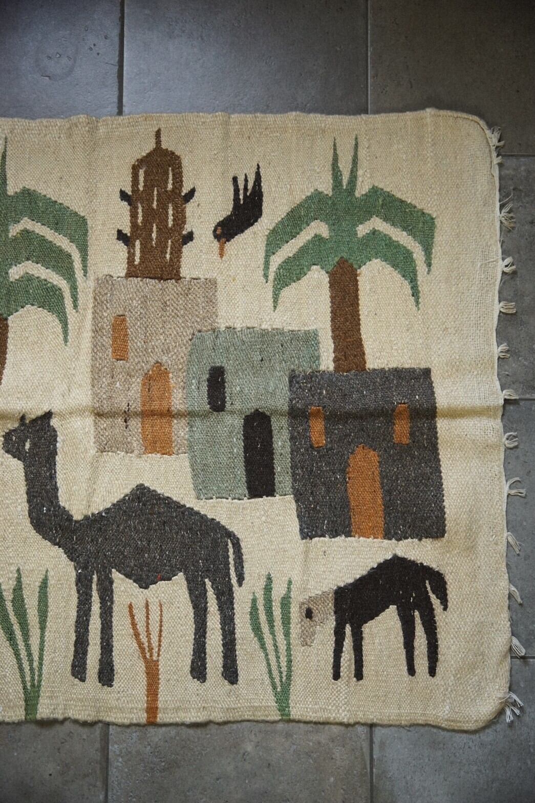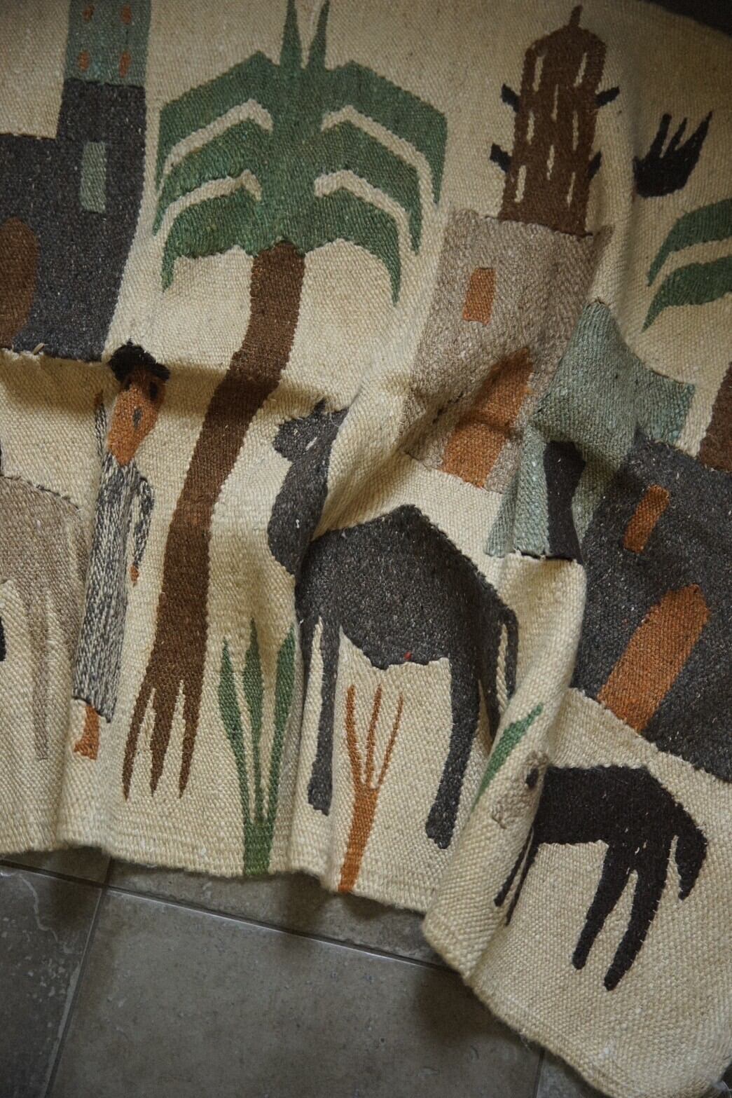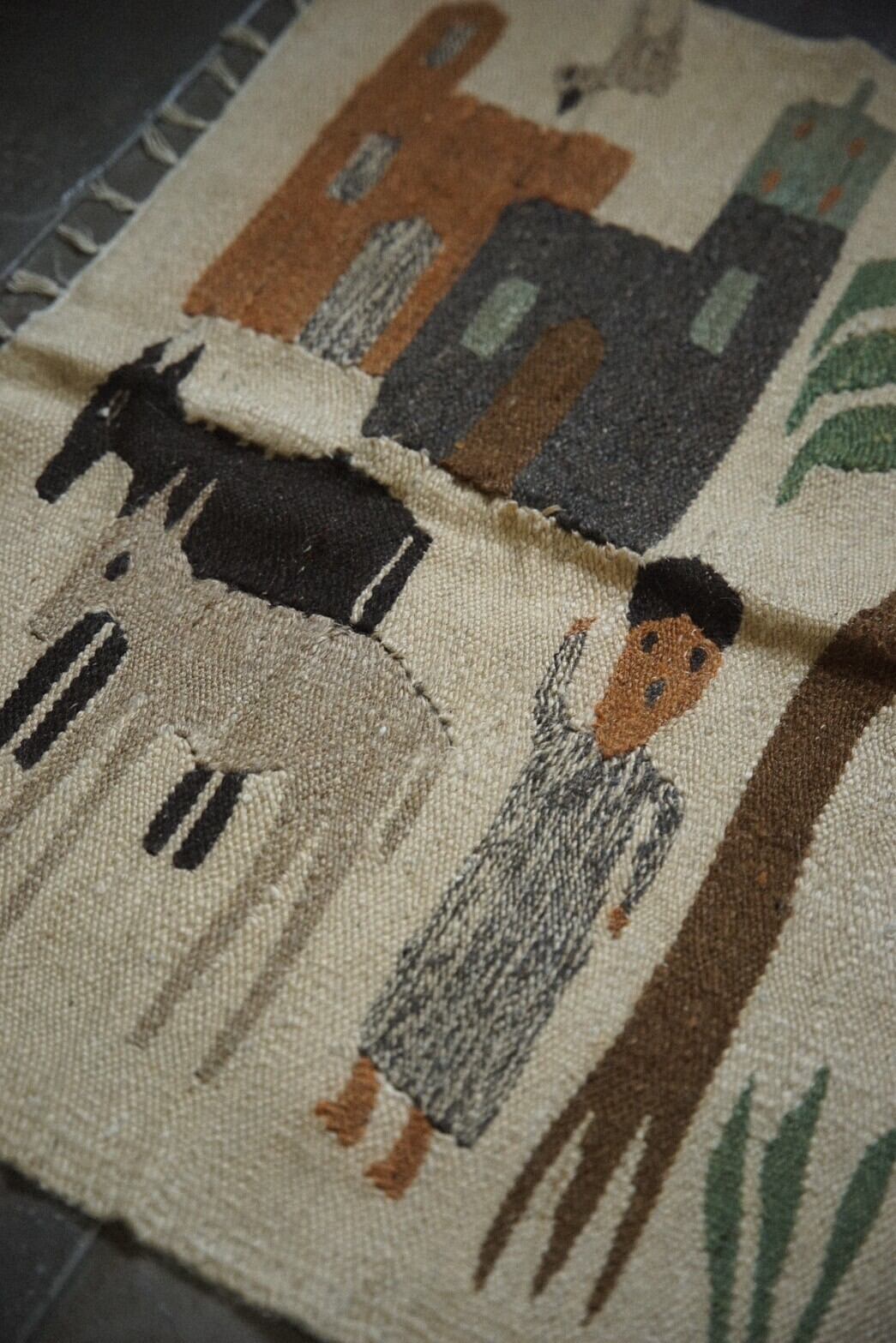 人々の生活風景を絵画のように描かれたピクトリアルデザインのキリム。