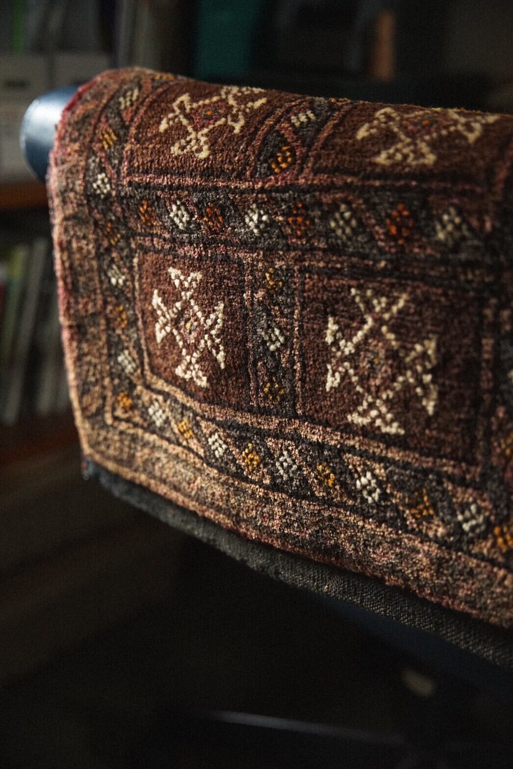 経年により味わい深い色味に変化したレッドとブラウンを中心とした渋めの配色がとても魅力的な一枚。