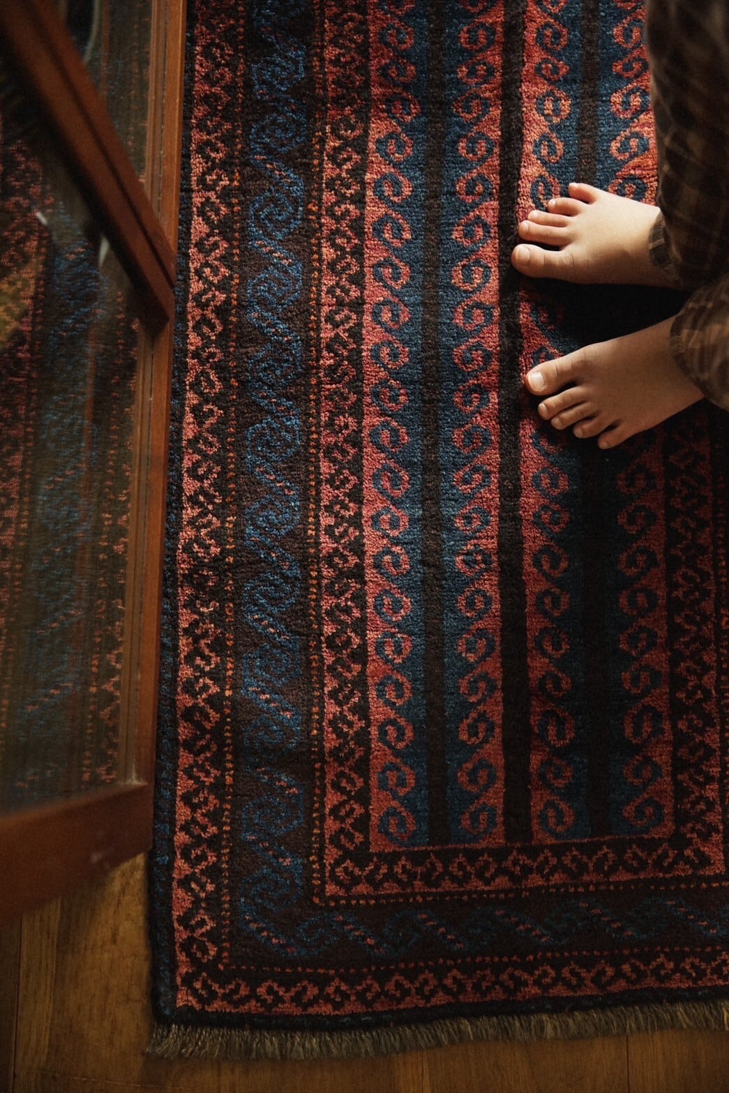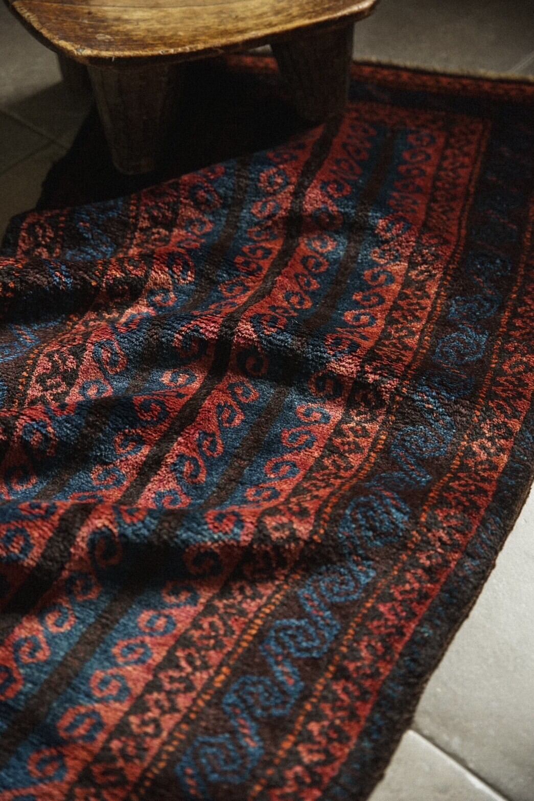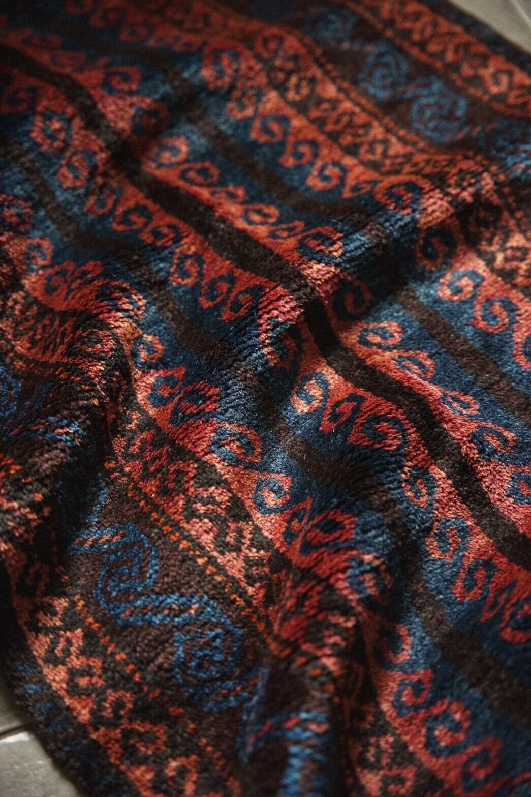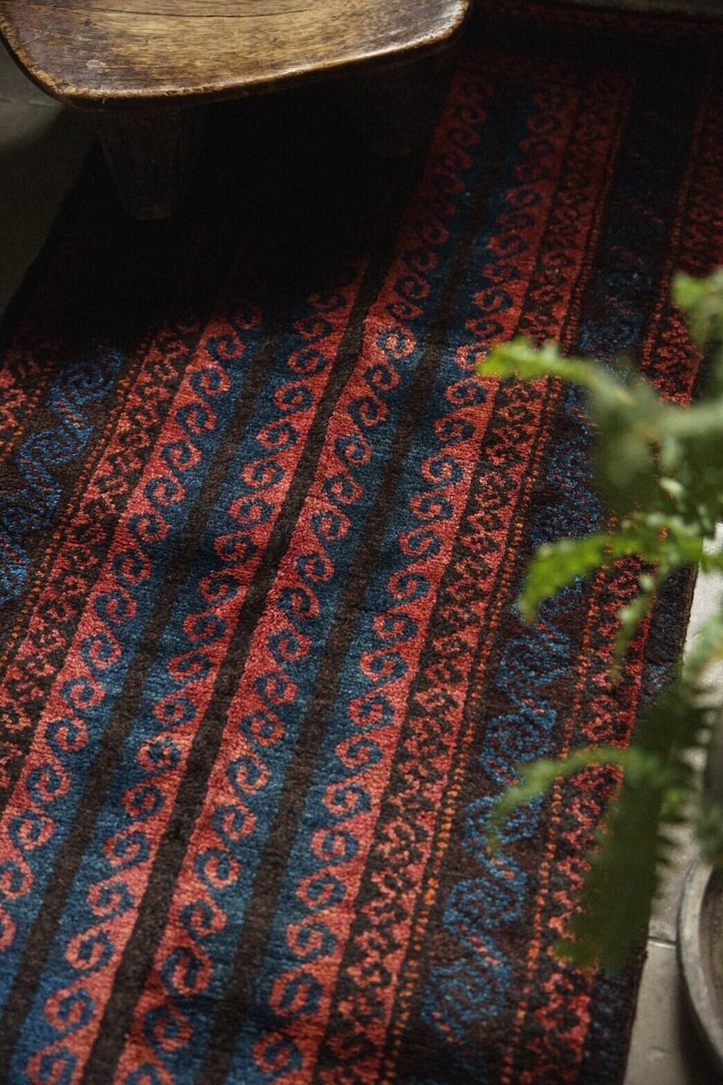 艶のあるウールが美しく、レッド、インディゴ、ブラック、ブラウンなどの色構成。フィールドにはチェーンの連続紋様や雄羊の角が描かれているデザイン。