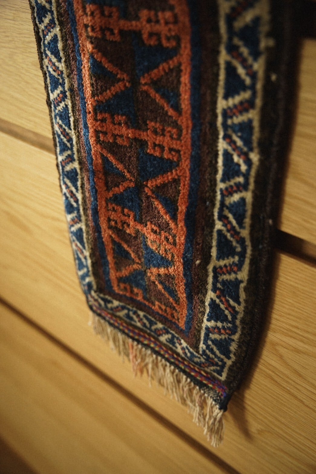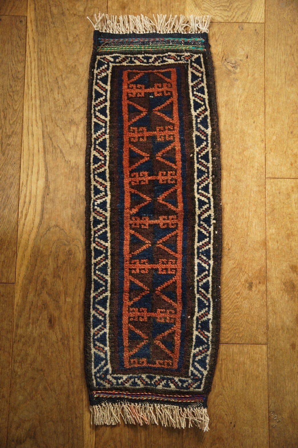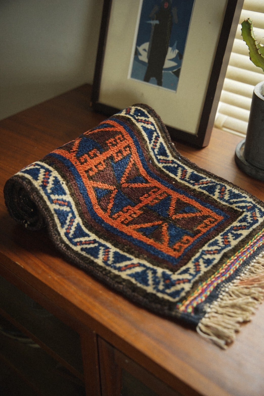 少しくすんだ渋めの色構成にオレンジが映える色構成。チナールにも似た三角形の連続紋様が並ぶデザインのバルーチラグ。