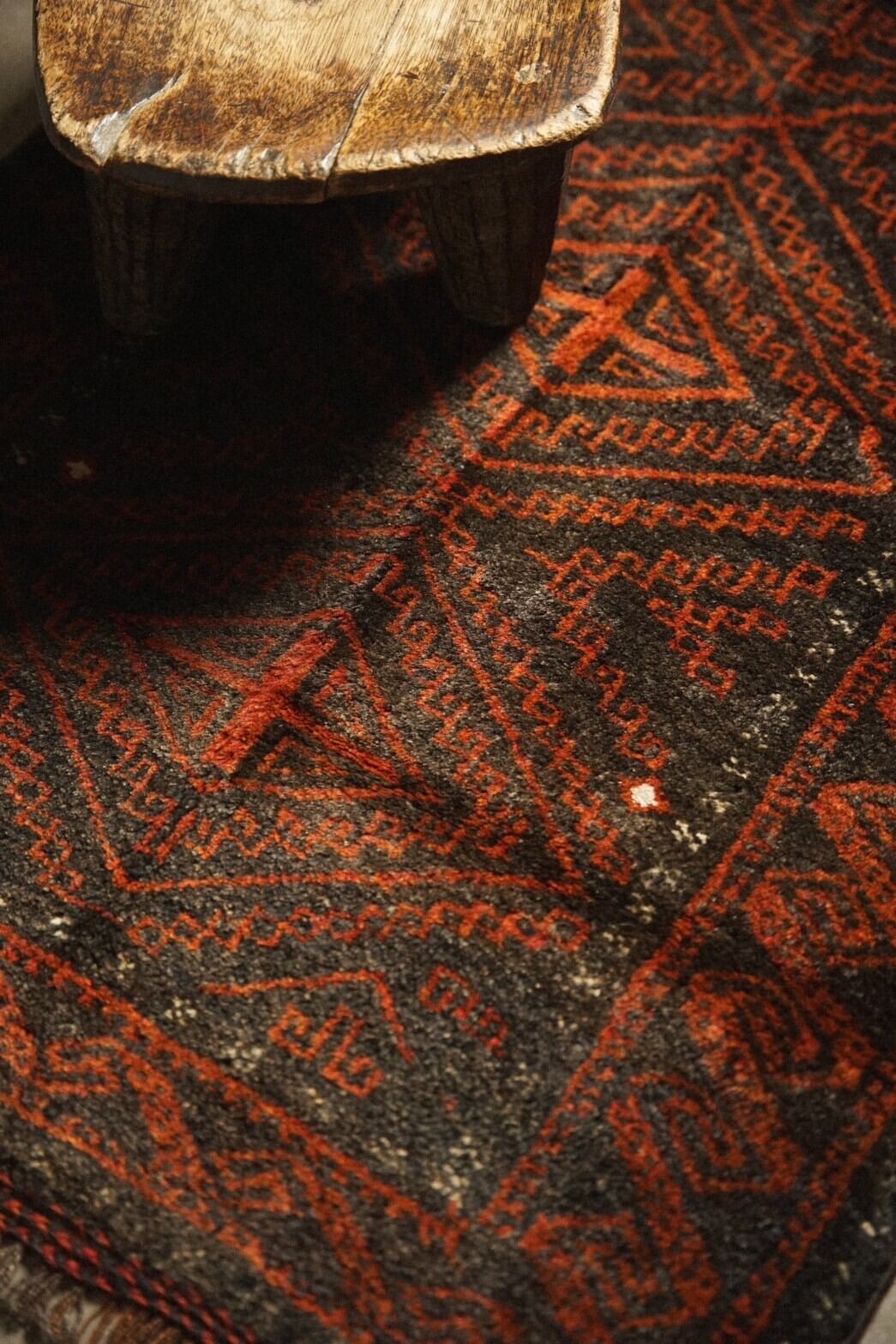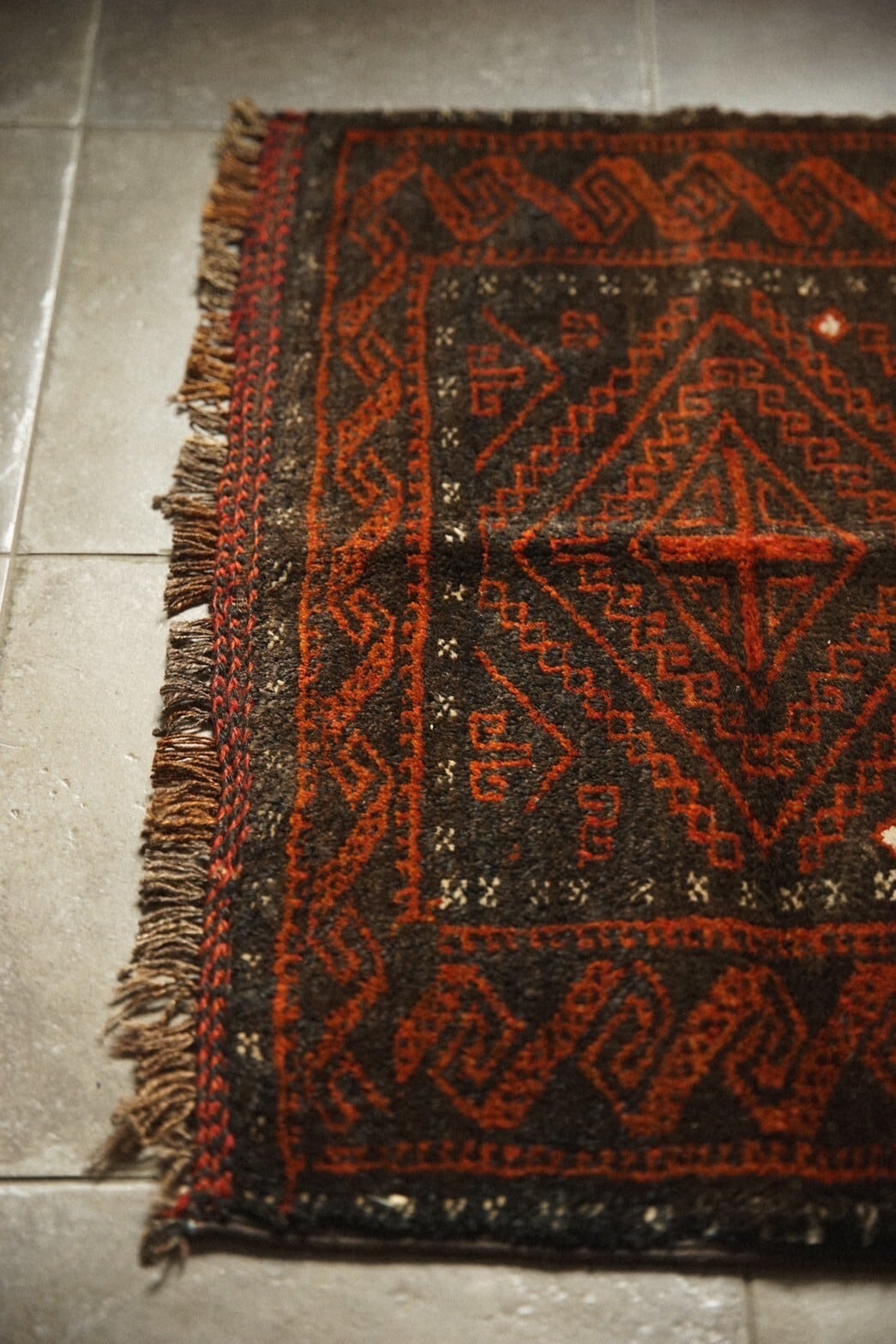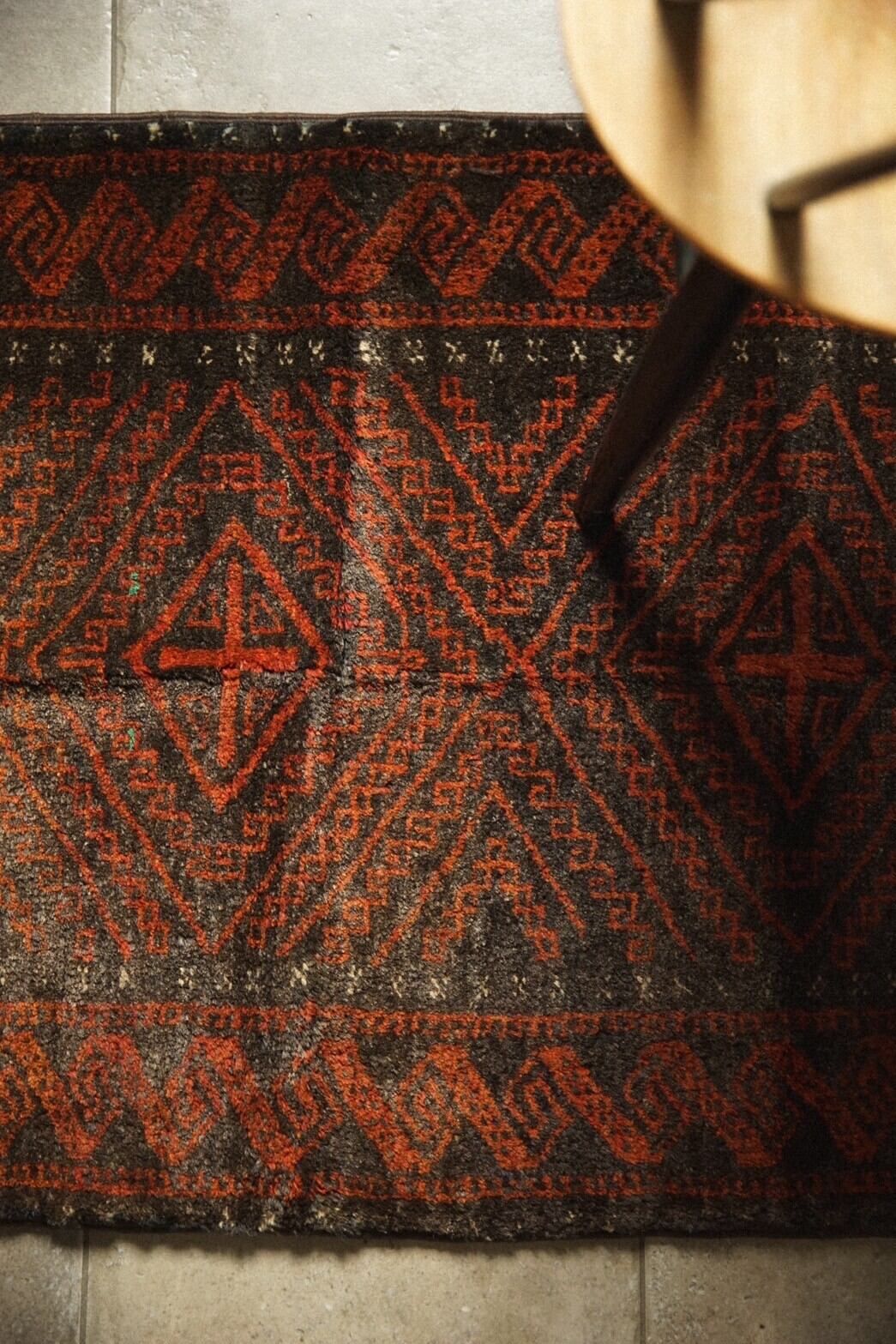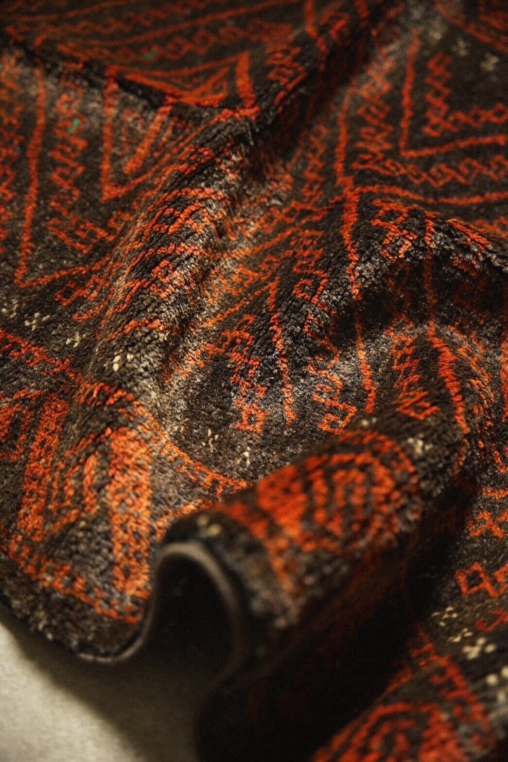 テラコッタオレンジ、ブラウン、ブラック、アイボリーのシンプルな色構成に力強いデザイン。元々バーリシトとして作られたものなので状態も良く、艶のあるパイルも綺麗に残っています。バルーチらしい渋めの色味がたまらないかっこよさです。