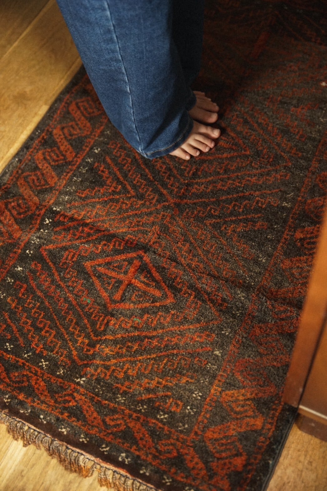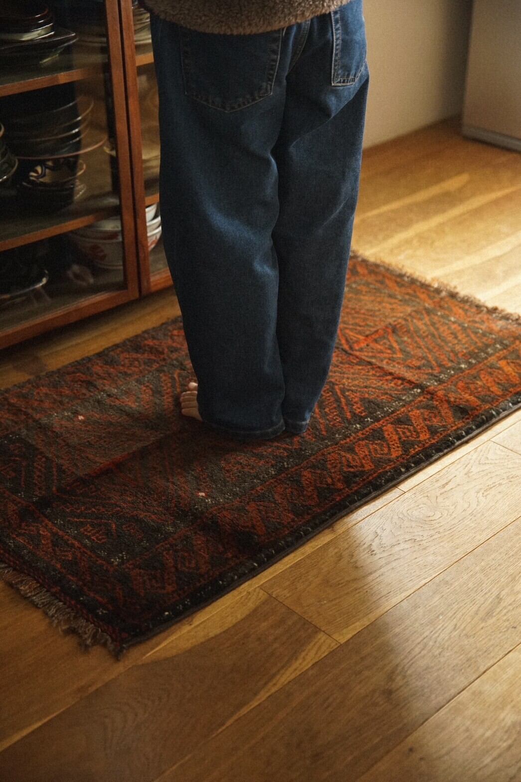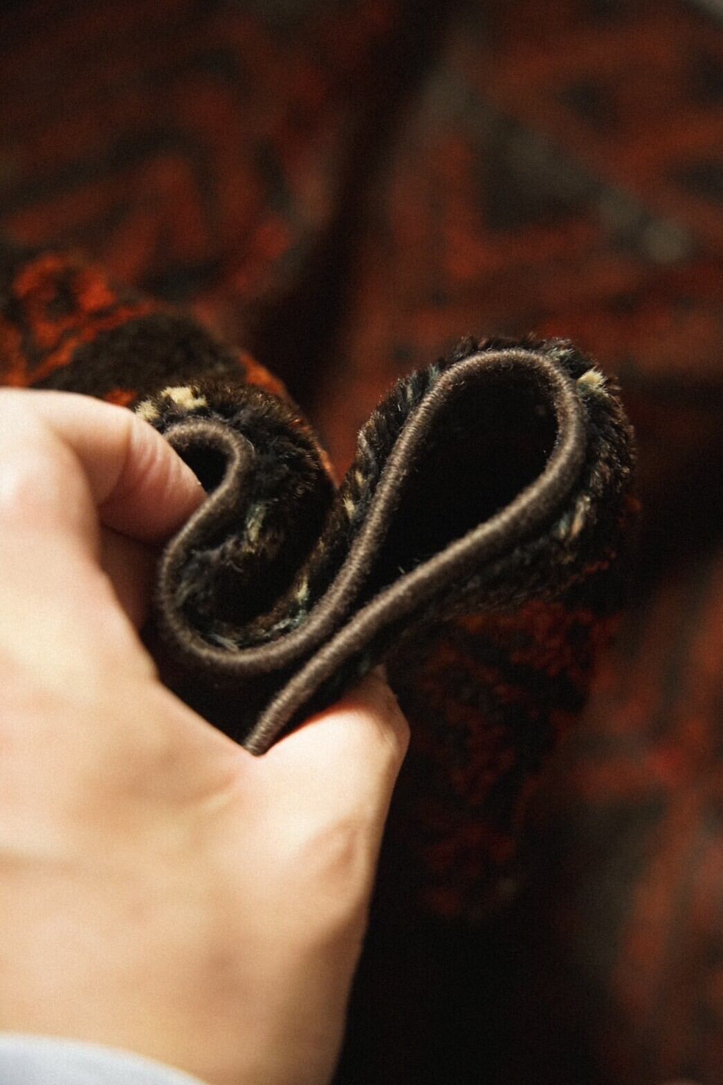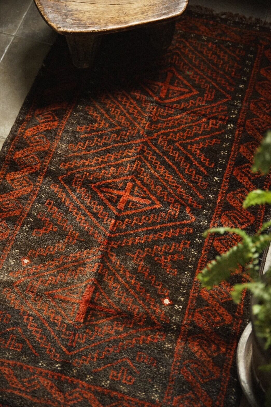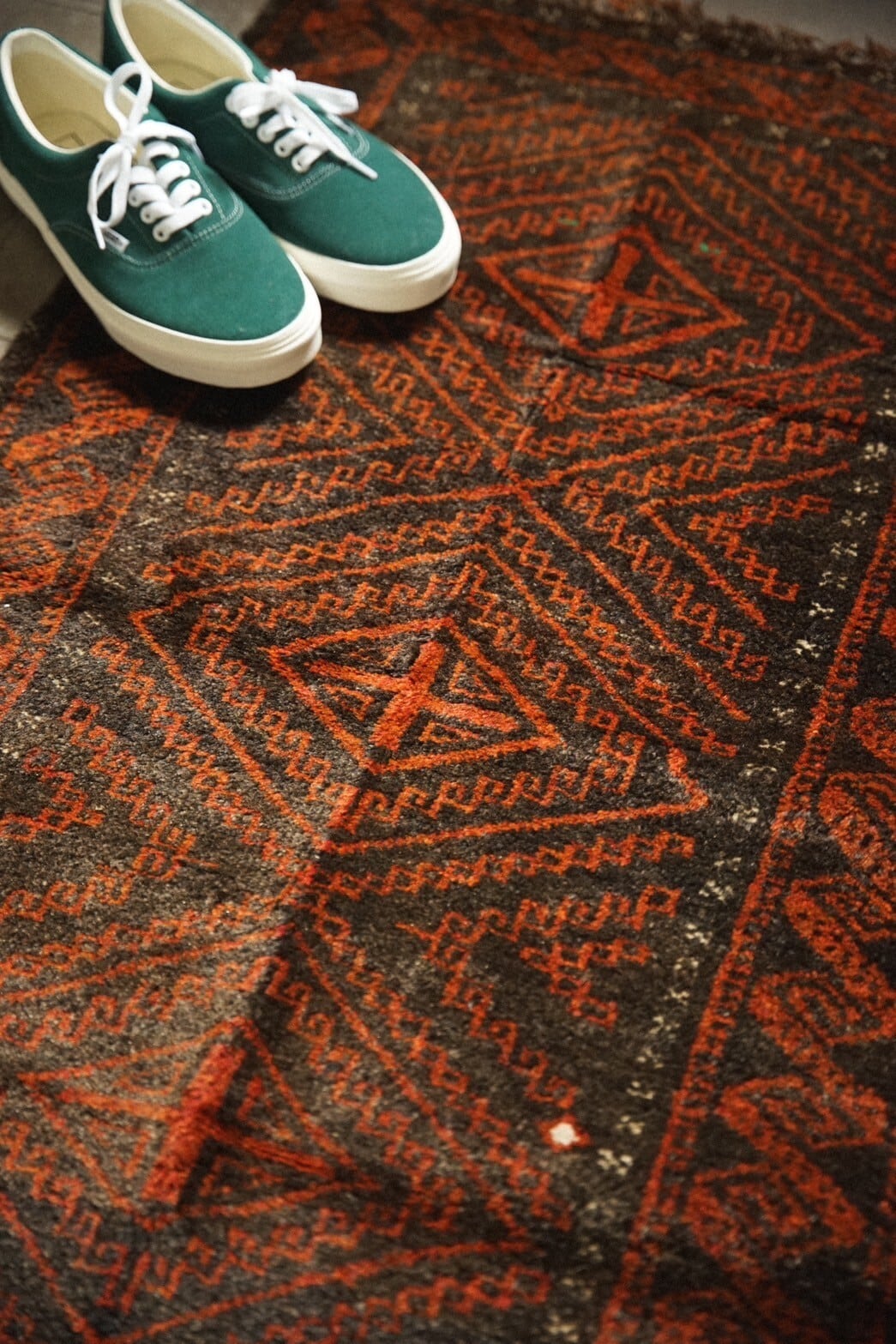 テラコッタオレンジ、ブラウン、ブラック、アイボリーのシンプルな色構成に力強いデザイン。元々バーリシトとして作られたものなので状態も良く、艶のあるパイルも綺麗に残っています。バルーチらしい渋めの色味がたまらないかっこよさです。