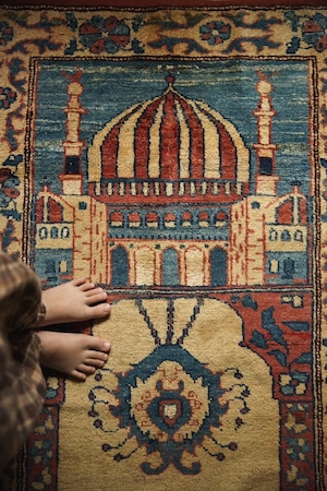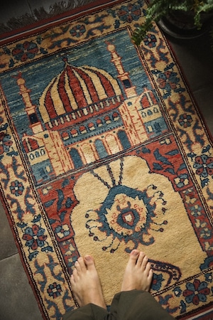 アイボリーをベースに茜色とブルーの色構成になっており、青空に映えるモスクが美しく神聖な雰囲気が魅力的な一枚です。