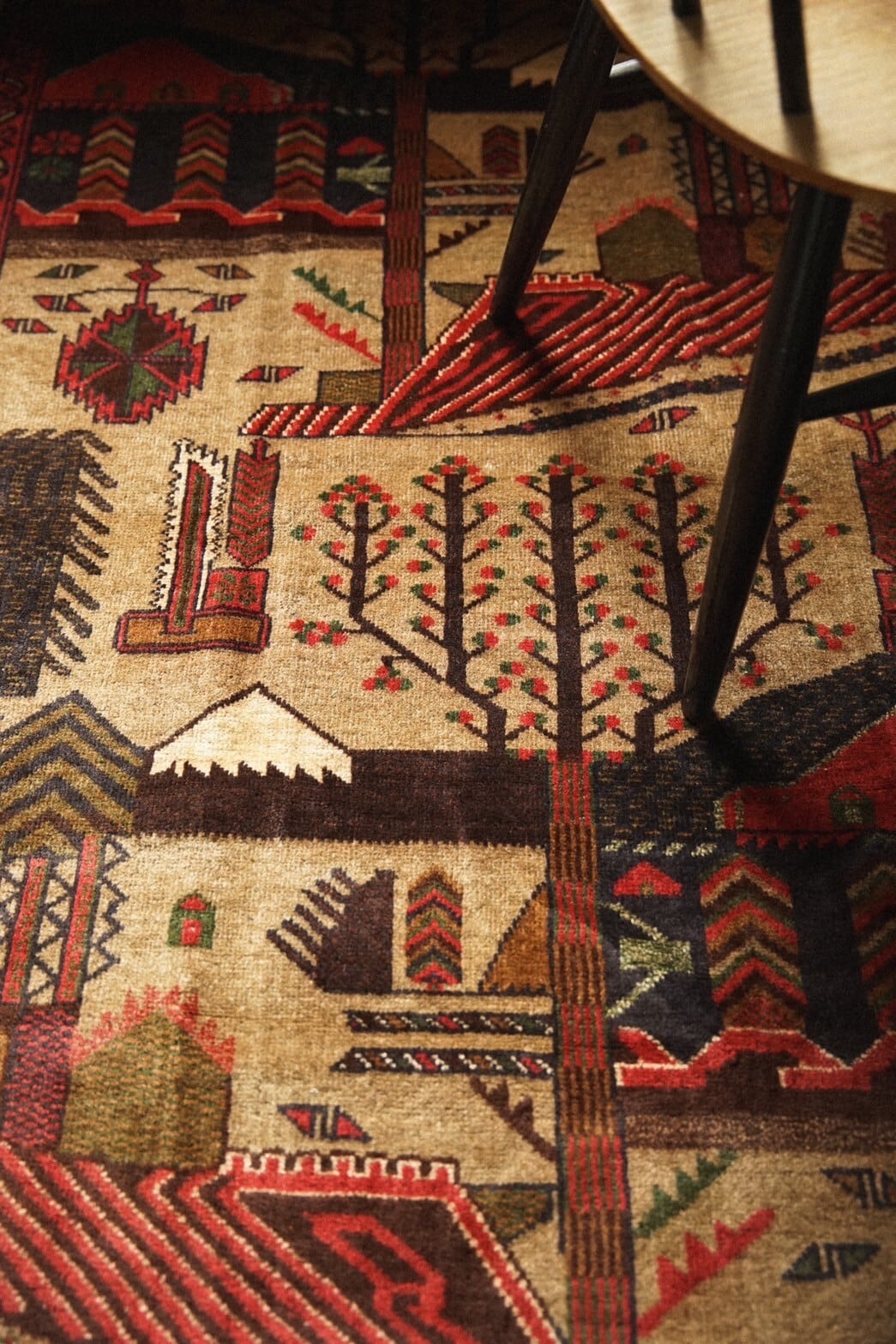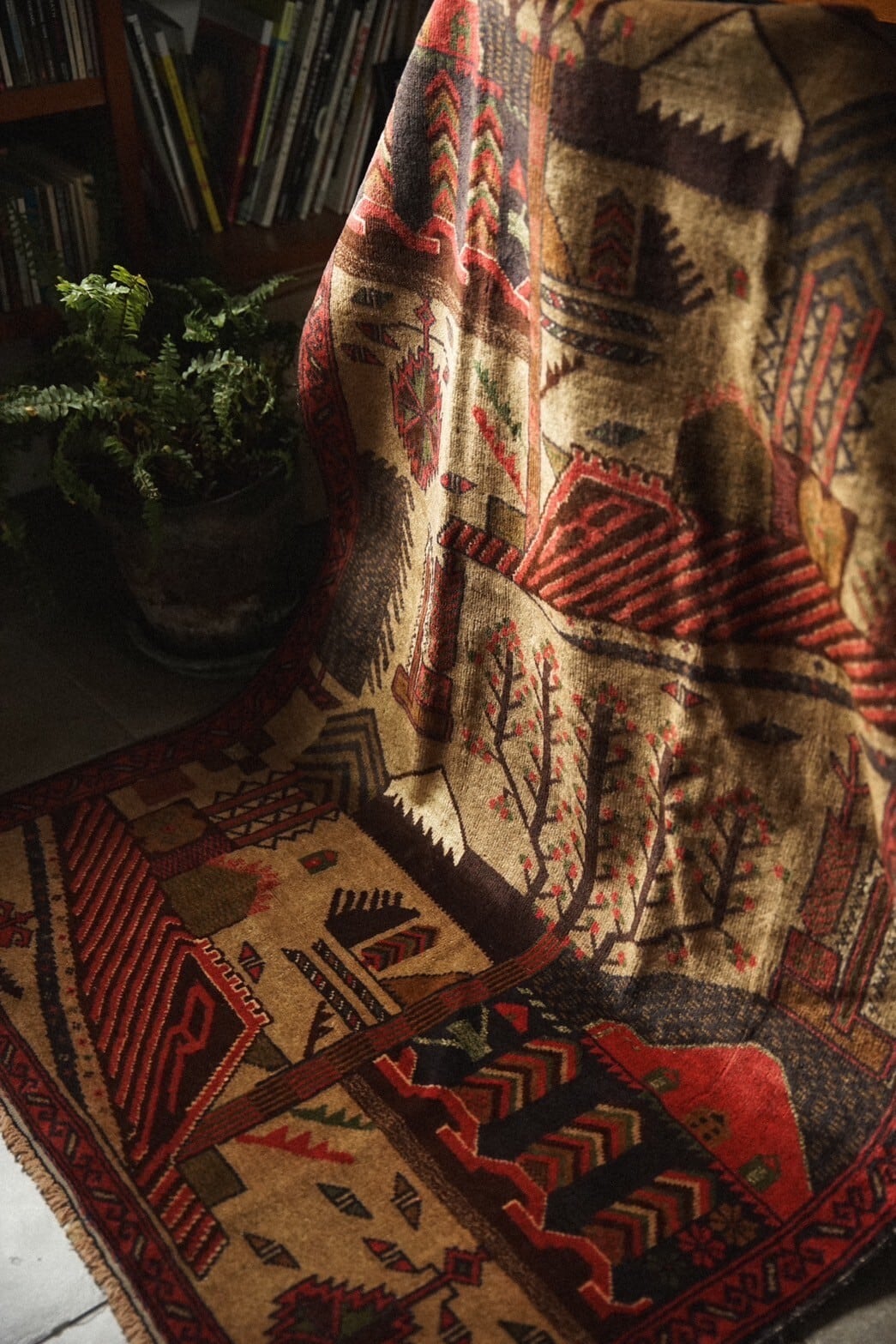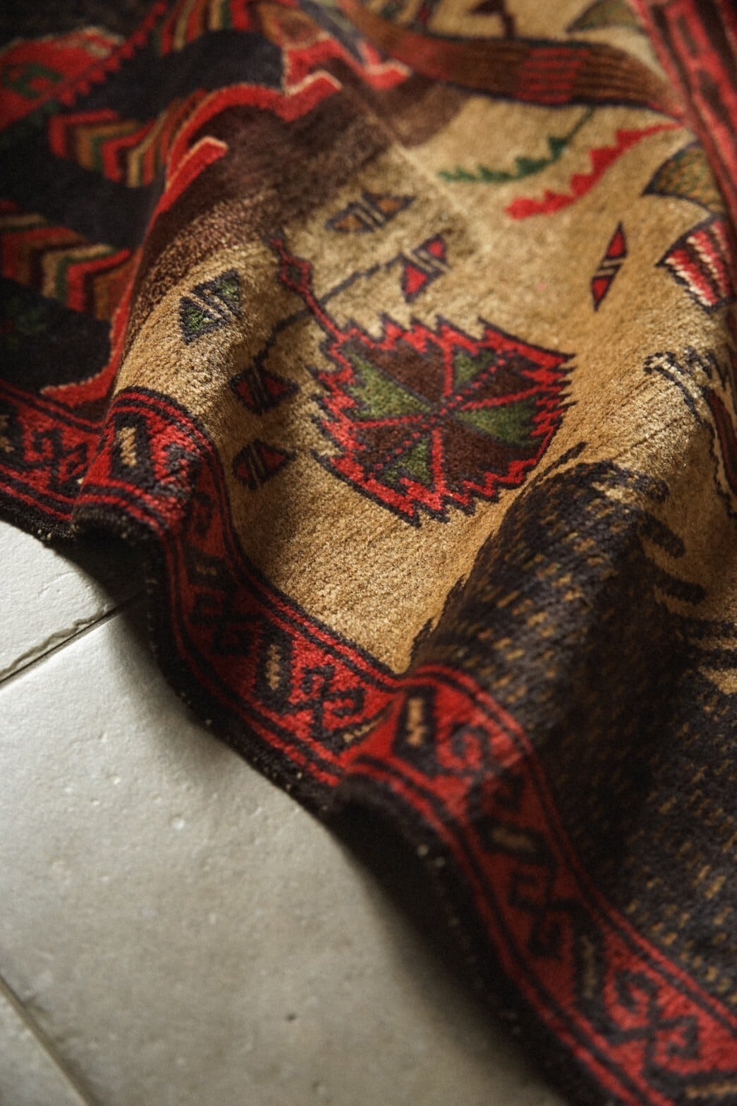 1980年代に織られたアフガニスタン産のバルーチラグ。絵画のようなデザインと赤とベージュの配色がとても可愛らしい一枚。