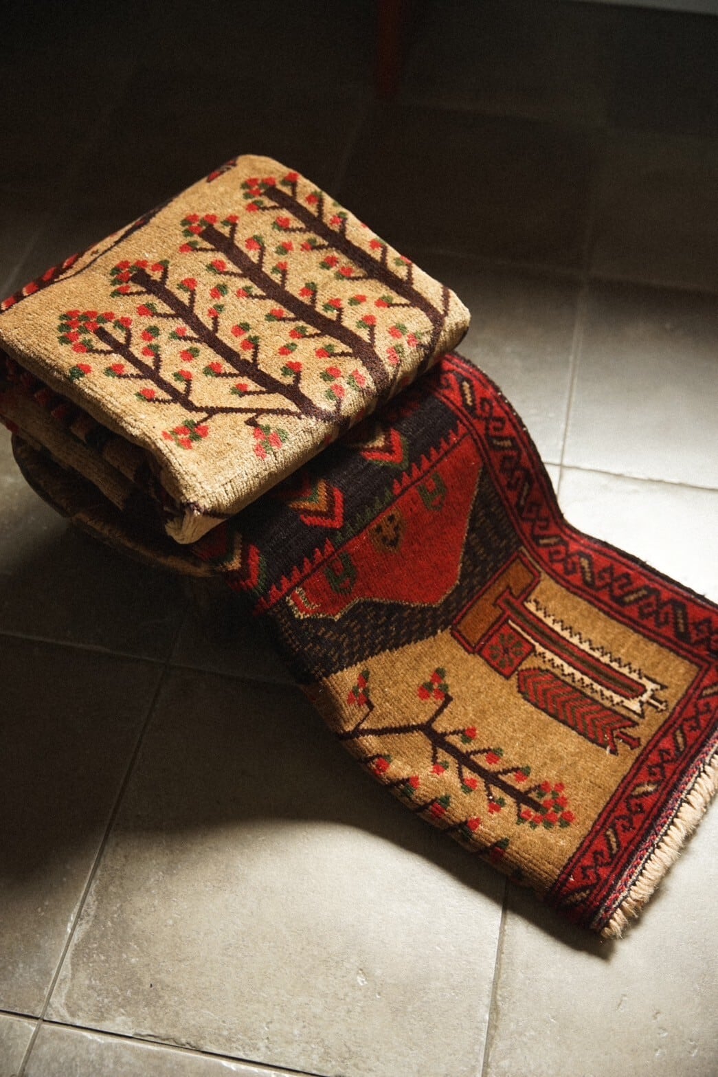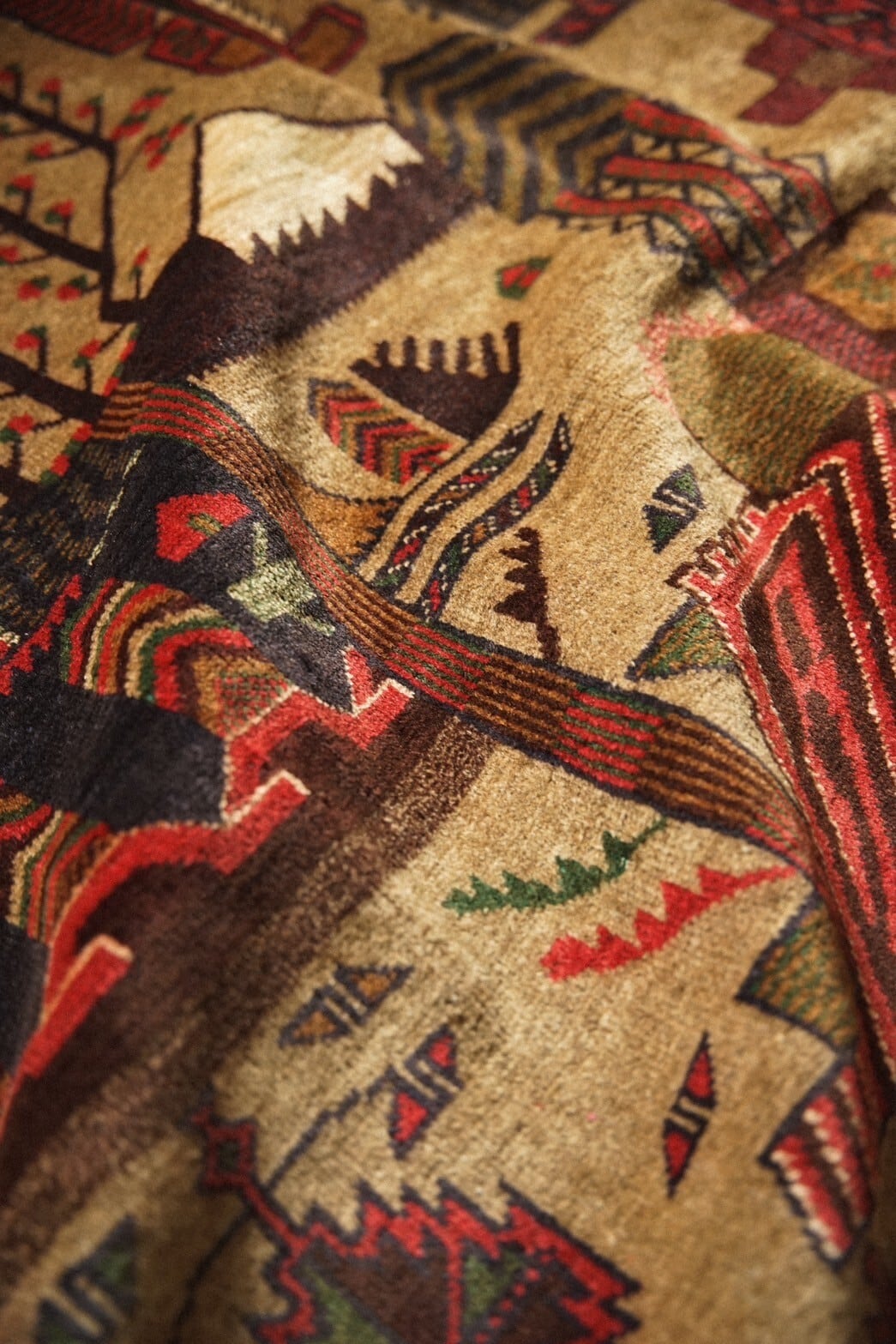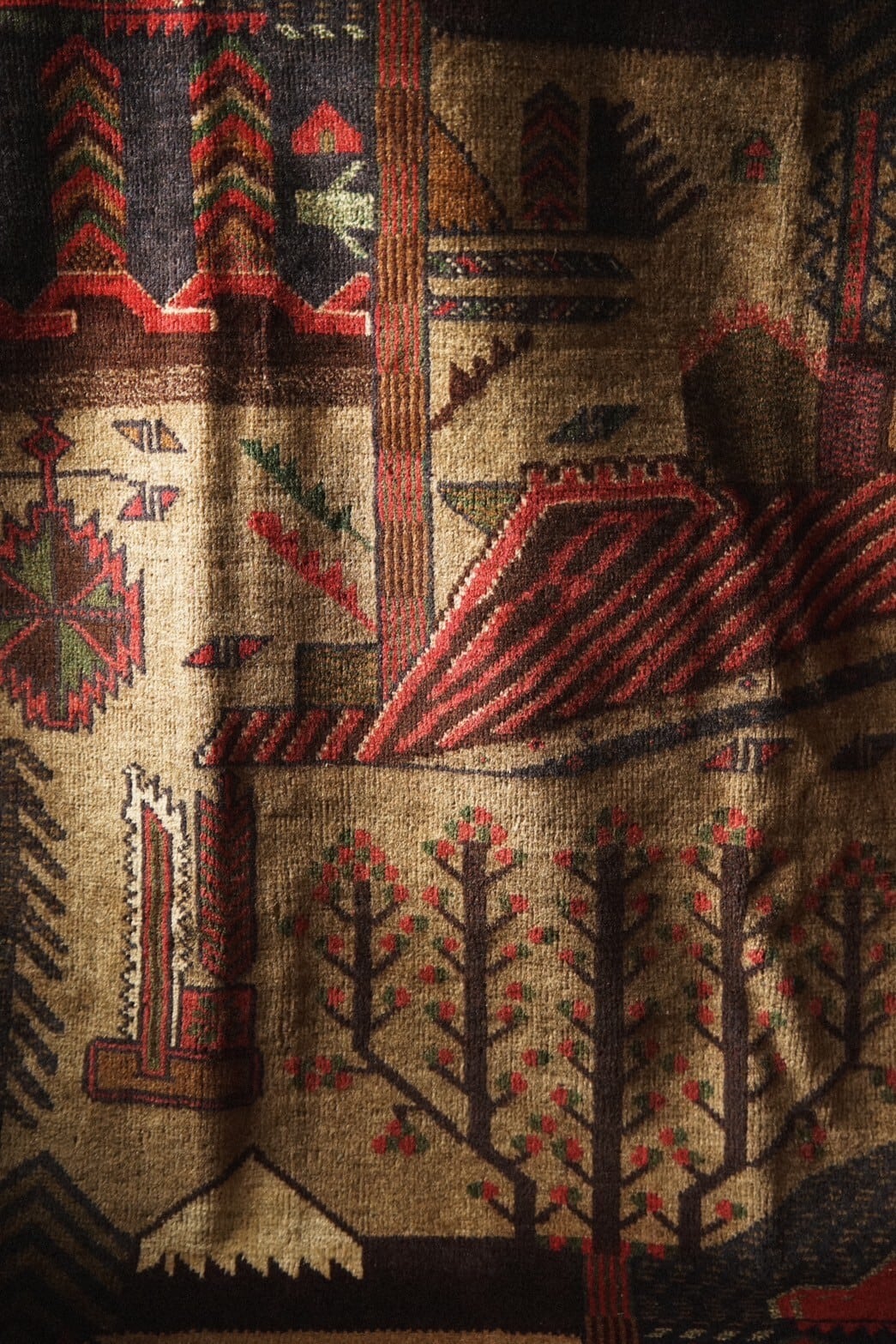 1980年代に織られたアフガニスタン産のバルーチラグ。絵画のようなデザインと赤とベージュの配色がとても可愛らしい一枚。