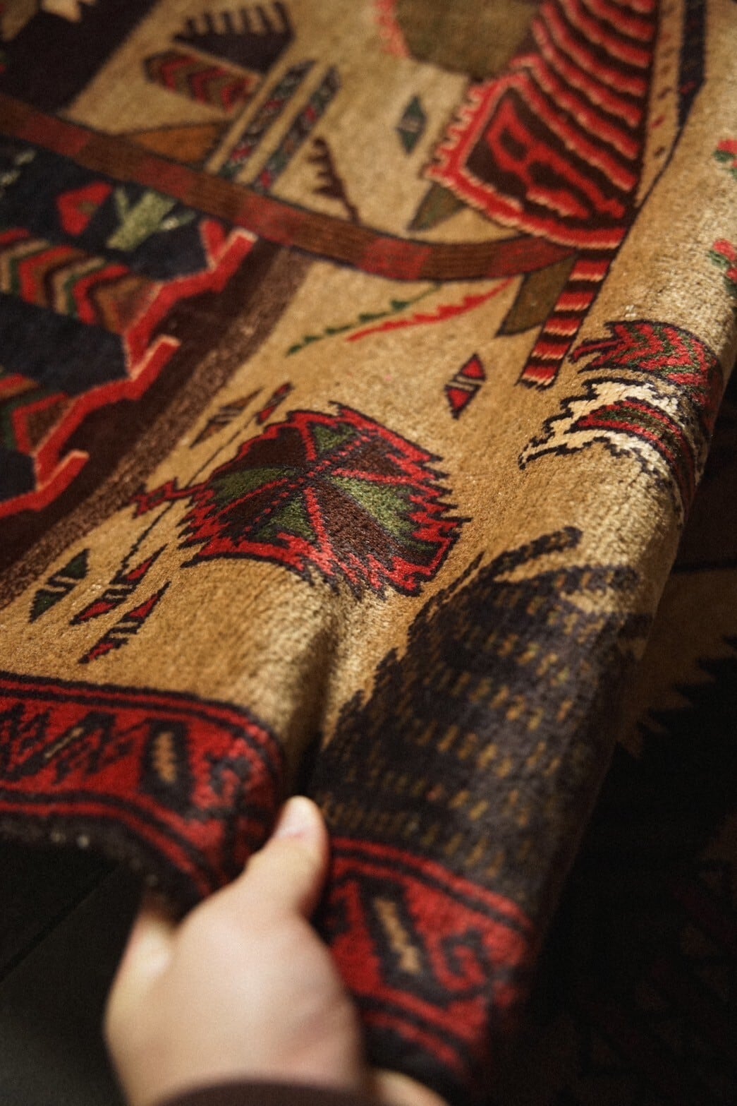 色味はベージュ、レッド、カーキ、グリーン、ネイビーなど落ち着いた色味になっており、どんなインテリアにも相性良く馴染んでくれそうです。艶のあるパイルは綺麗に残っておりグッドコンディション。