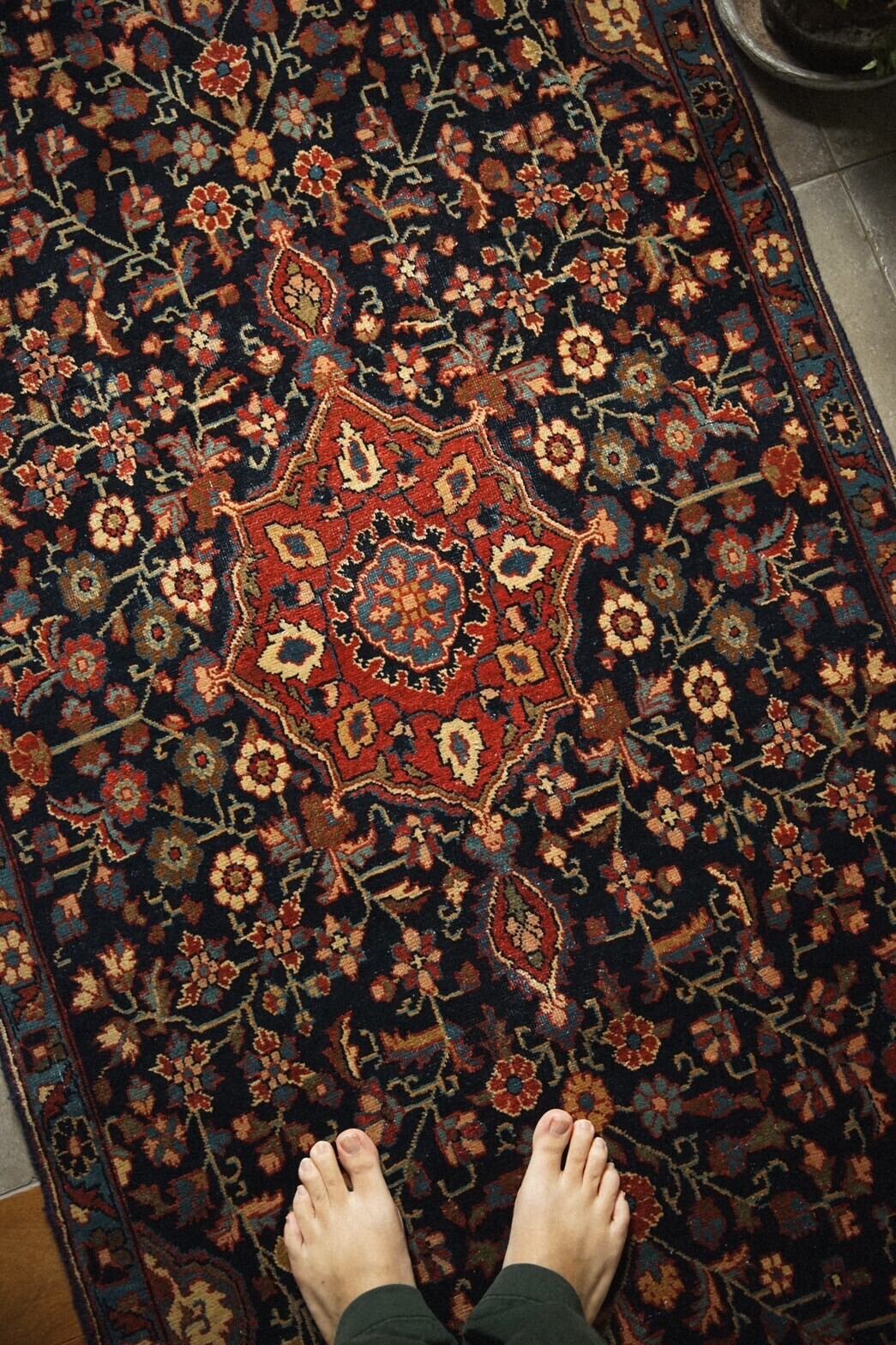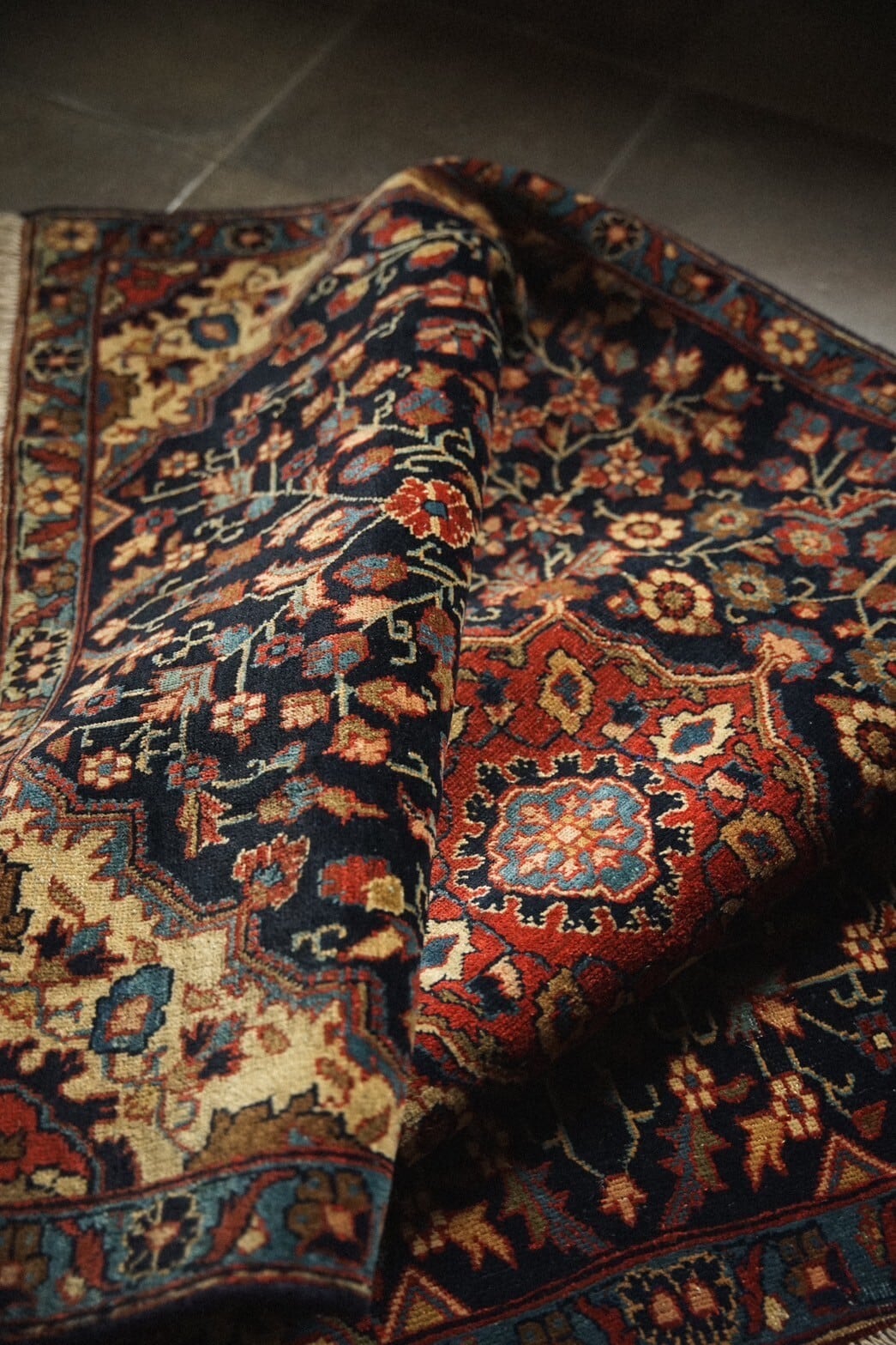 ラグ全体に織り込まれた美しい花紋様とフィールドのネイビー、ボーダー部分のインディゴなどブルー系の色味がデザインの美しさと色彩の豊かさを感じさせてくれます。