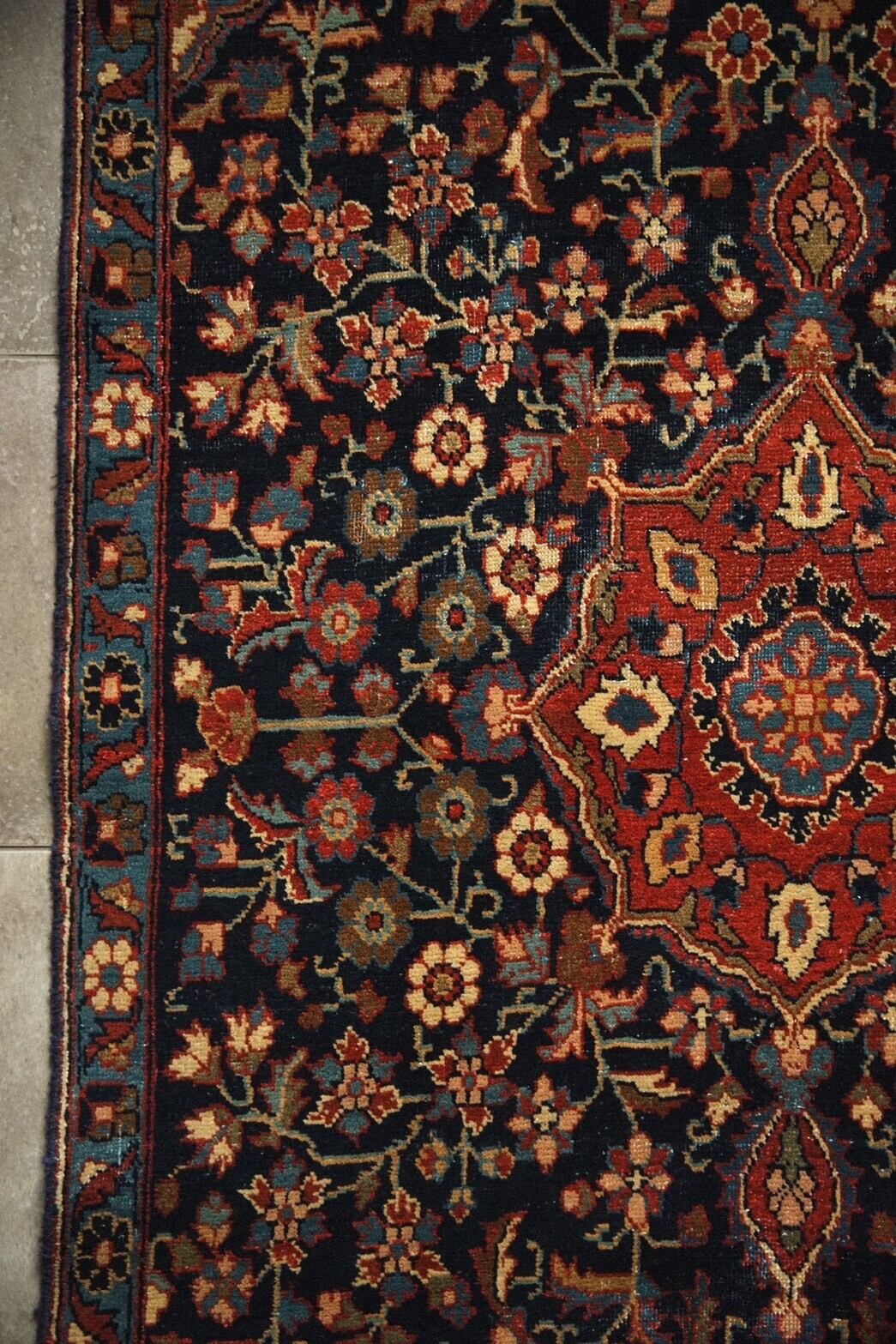 深みのあるネイビーのフィールドに鮮やかな色合いで描かれたフローラルモチーフと真ん中のメダリオンがクラシカルで華やかな一枚。