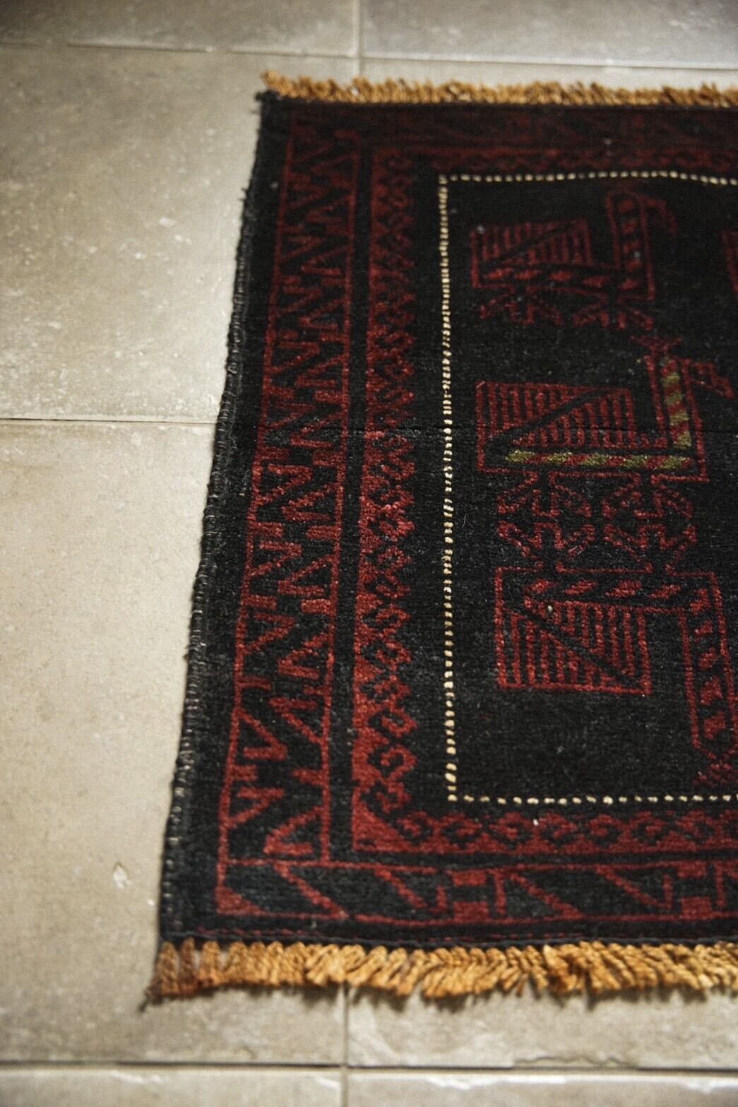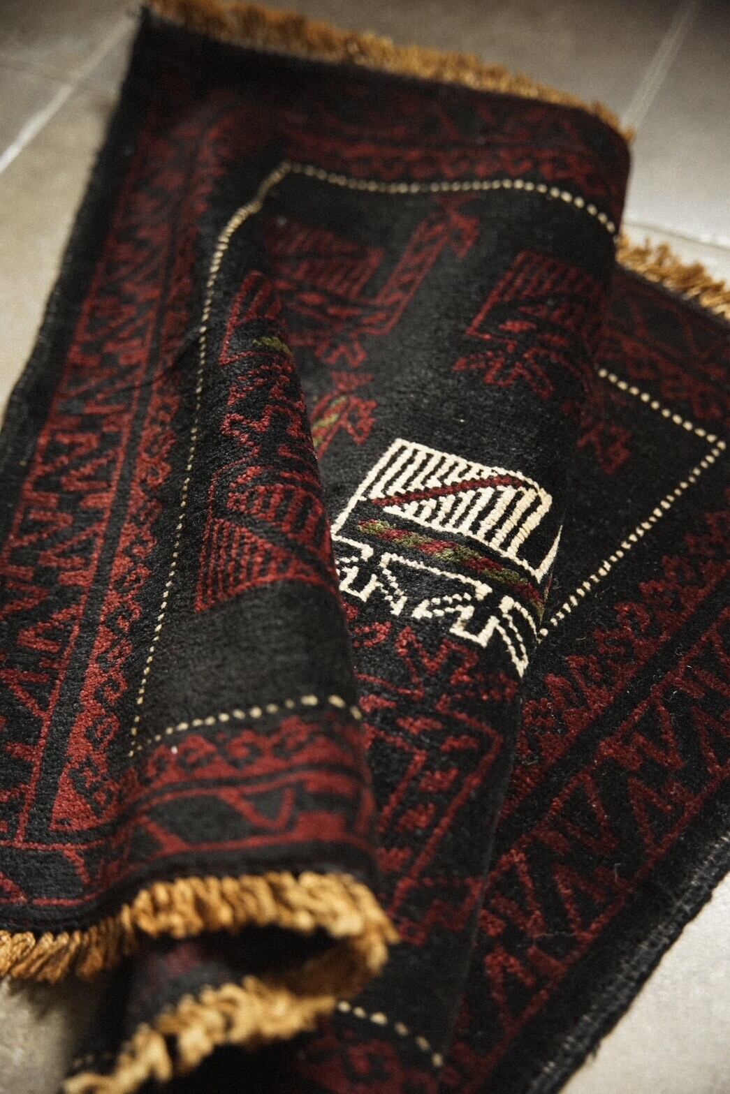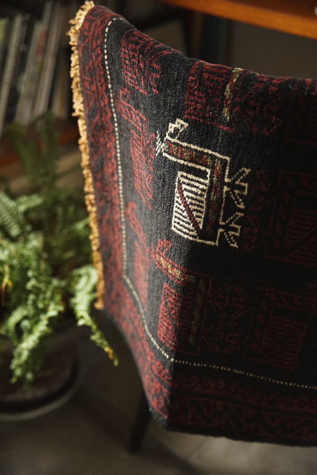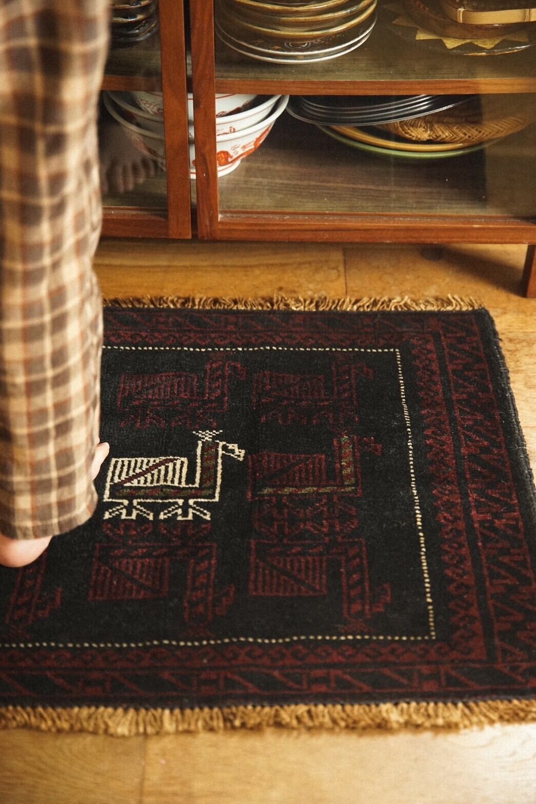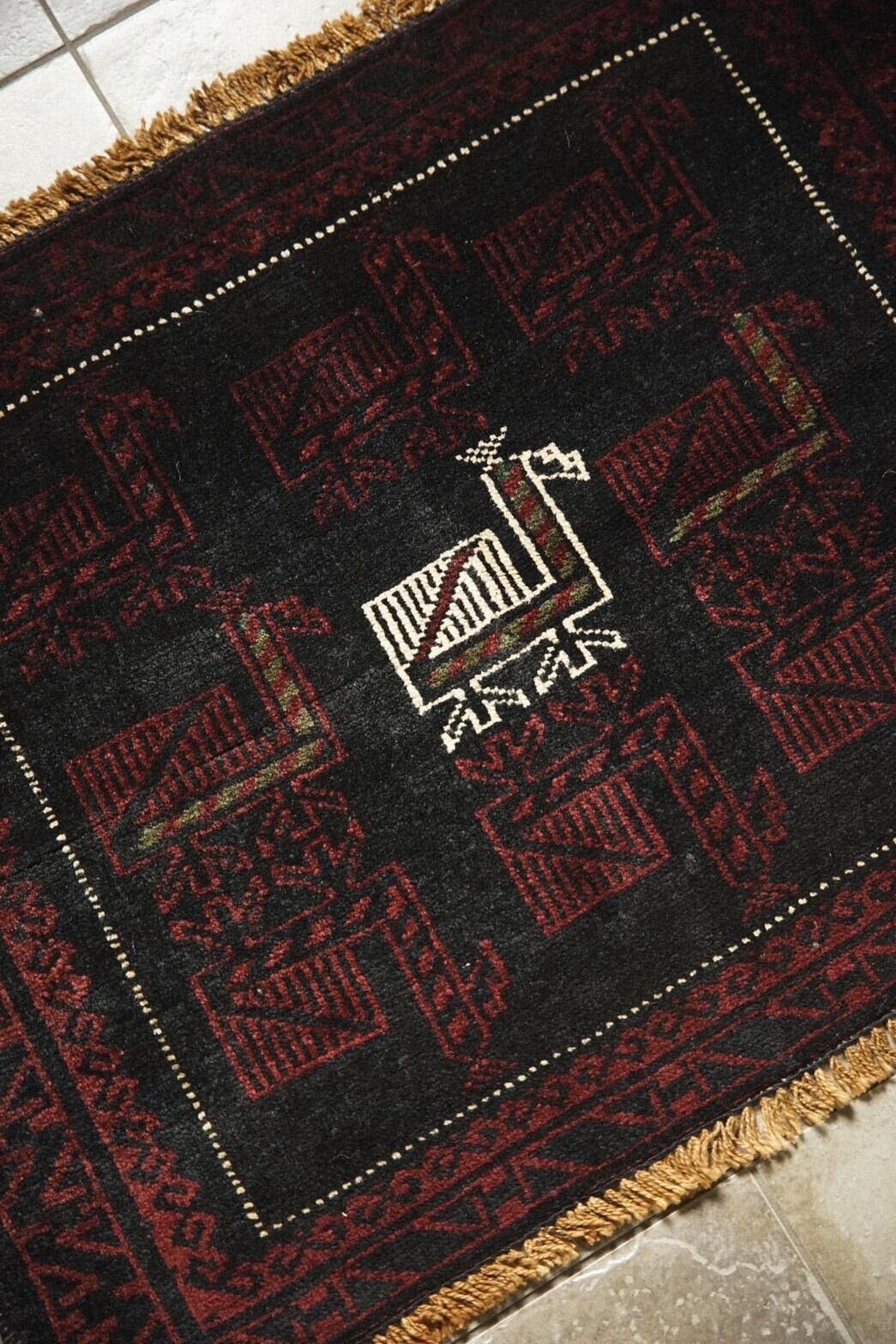 ネイビー、カーキ、レッドなど渋めの色合いに沢山の鳥が並ぶバルーチ族の定番デザイン。