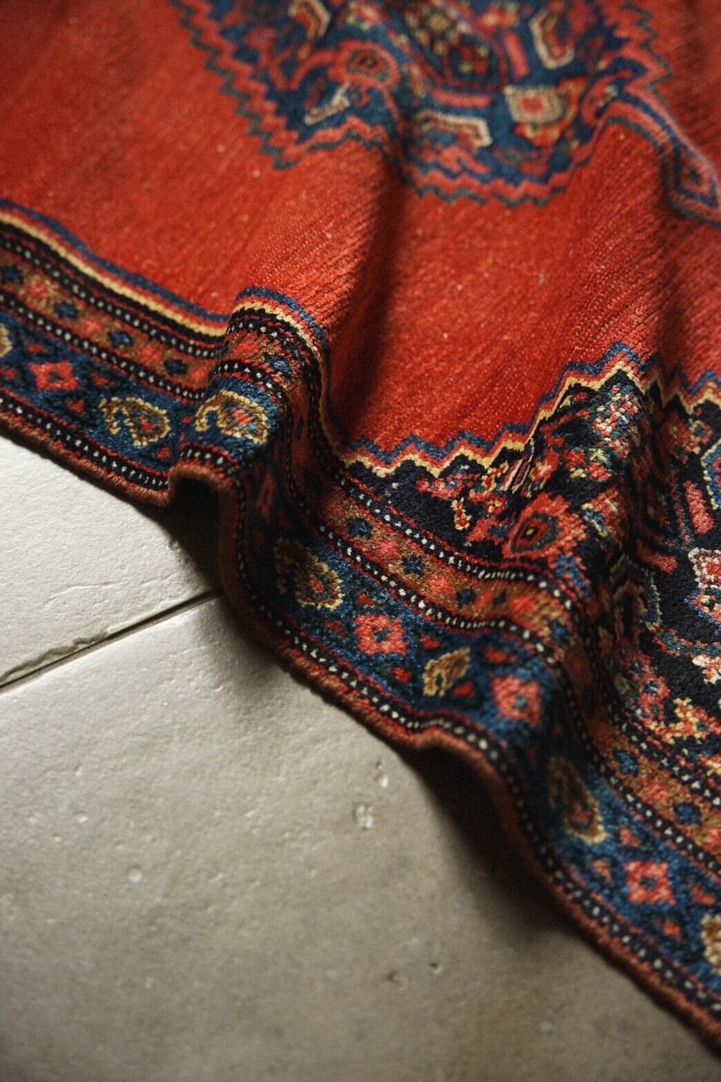 経年により赤いフィールドはパイルは短くなりサラッとした質感ですが、フィールド部分はパイルが残っており、ウールの柔らかい質感を楽しむことができます。