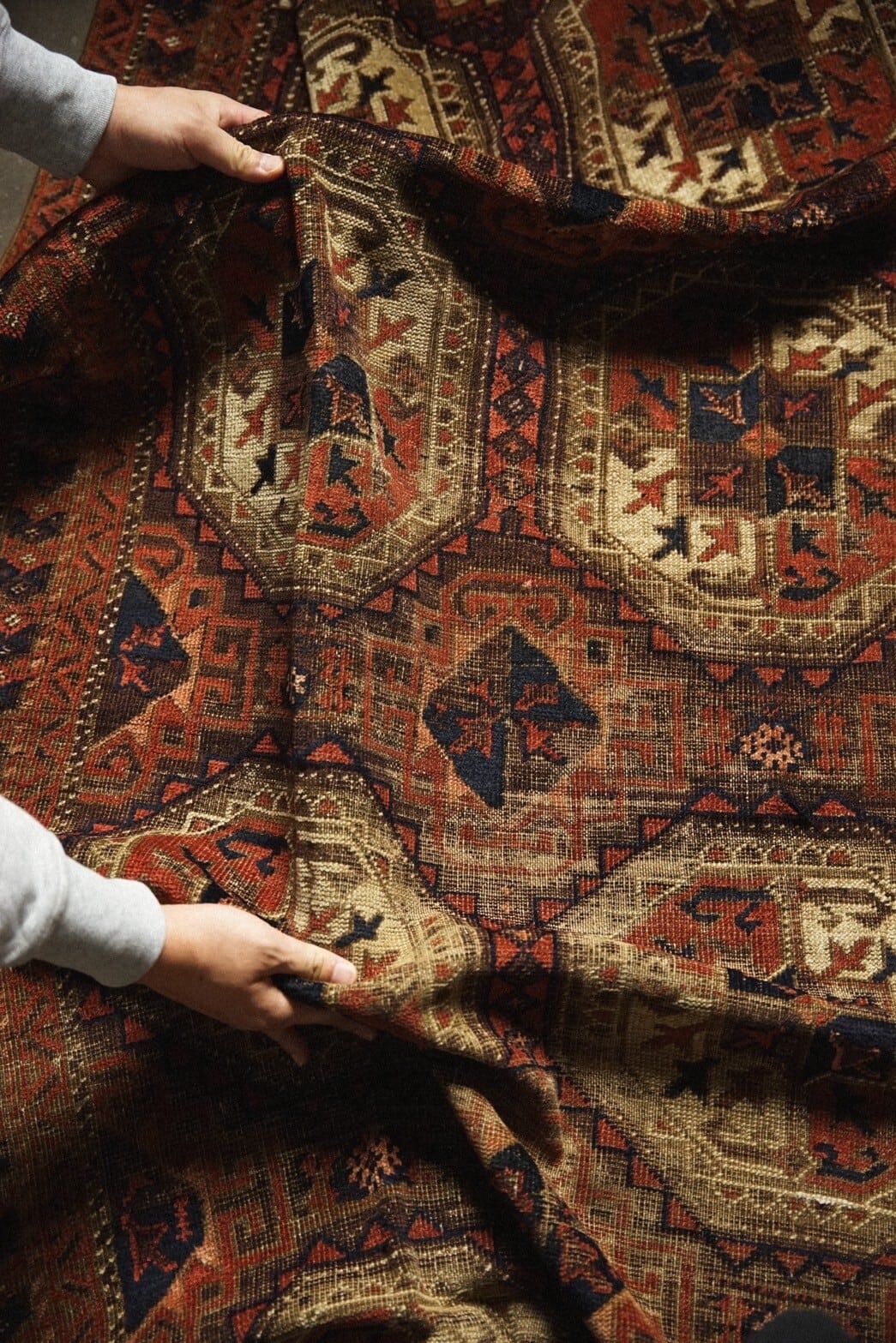 経年による色落ちや擦れなどアンティークラグにしか出せない風合いが味わい深い魅力があり、歴史を感じる古いものが好きな方にはたまらない一枚です。