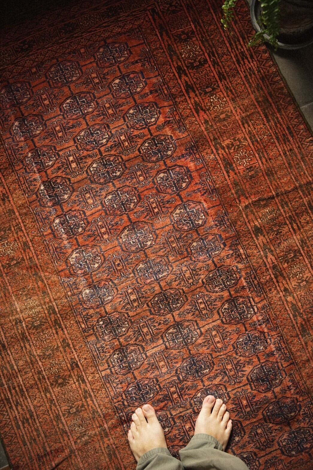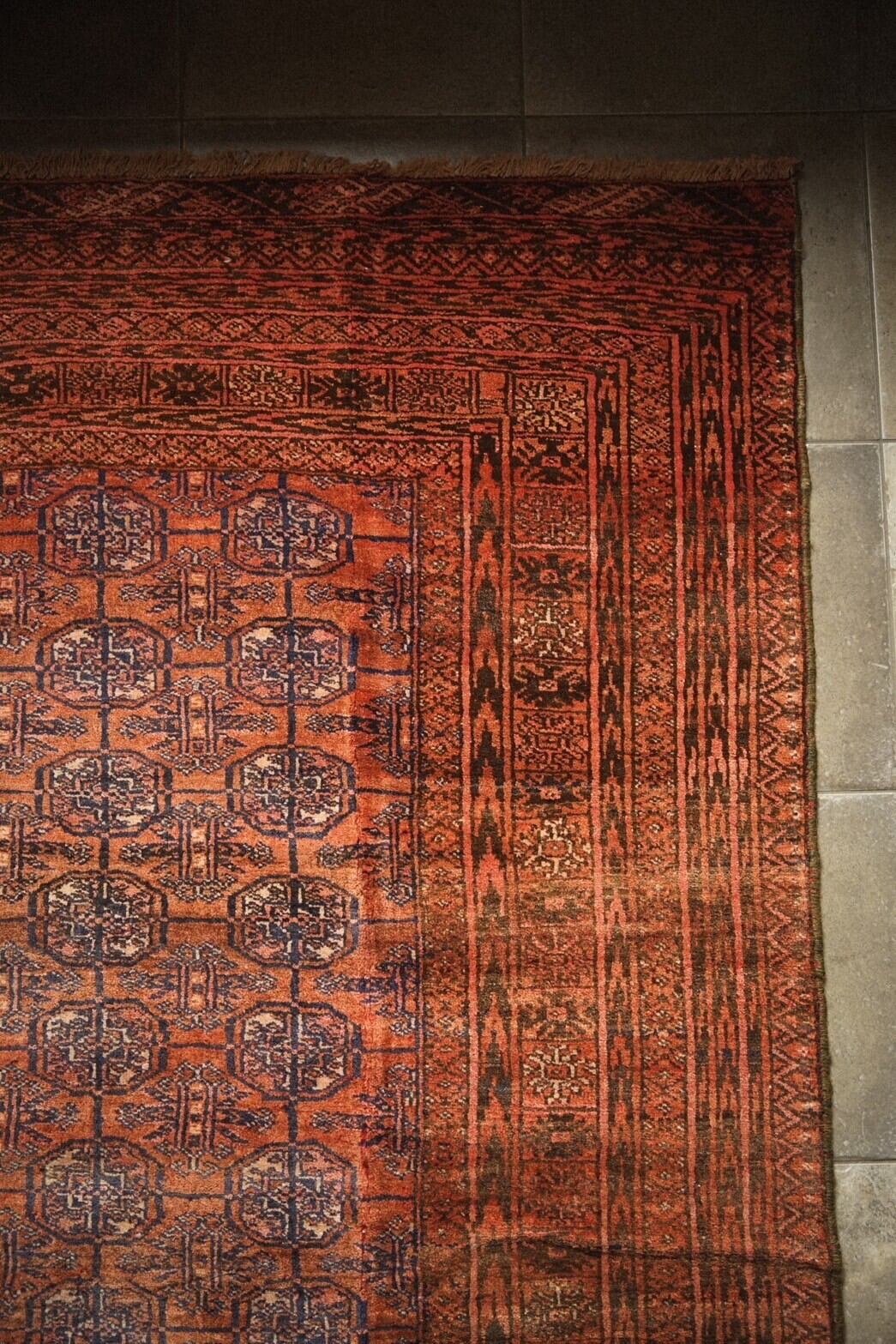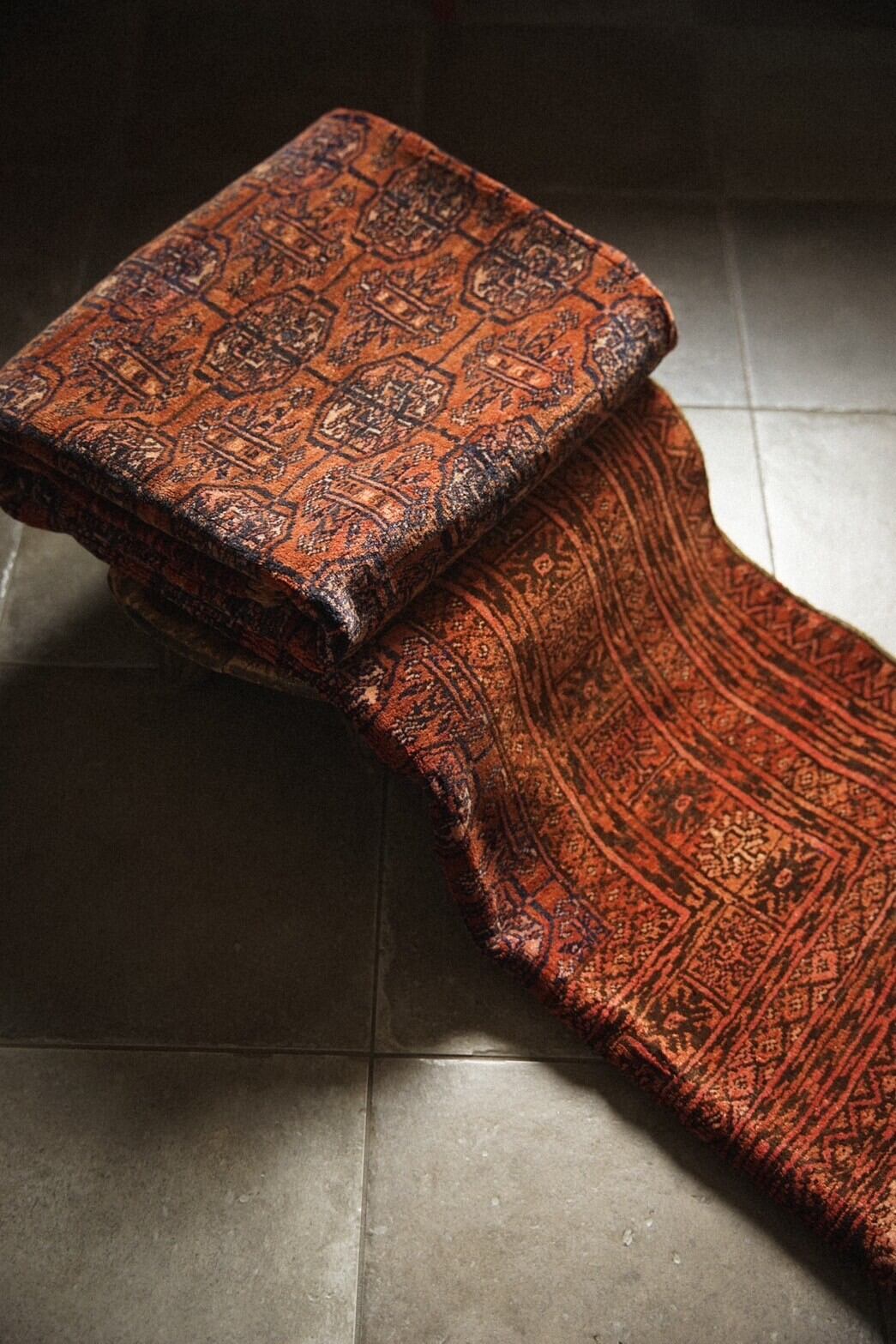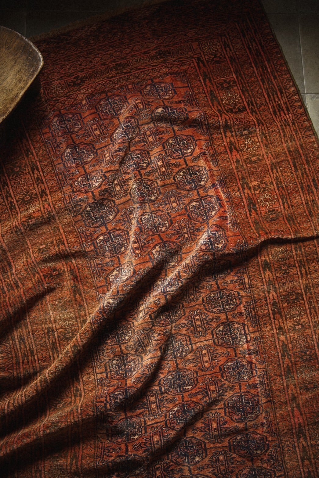 朱赤に近い優しい色味の赤色とネイビーをベースにMauri Gulと呼ばれるギュルがたくさん並んだデザインのアフガントルクメンラグ。