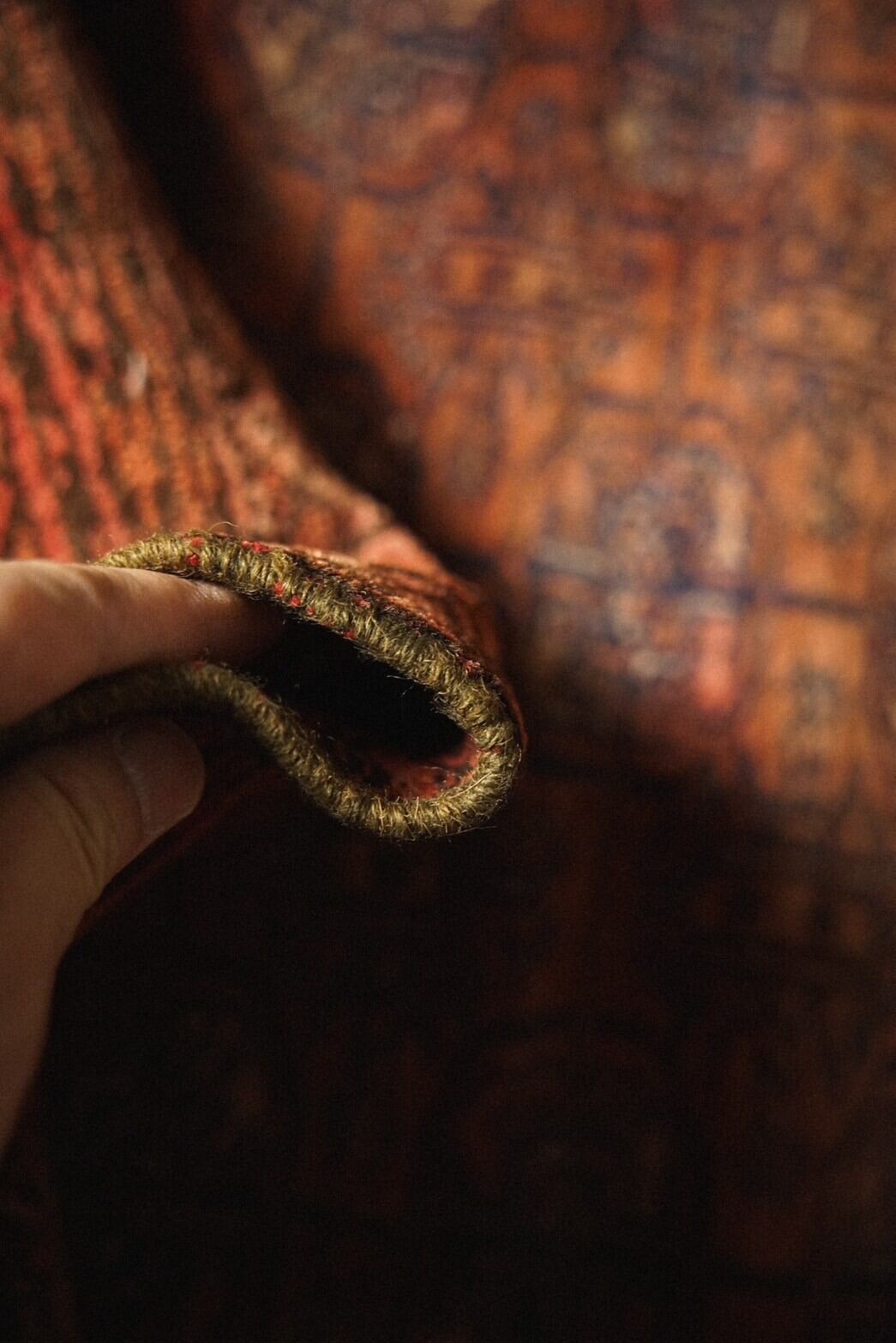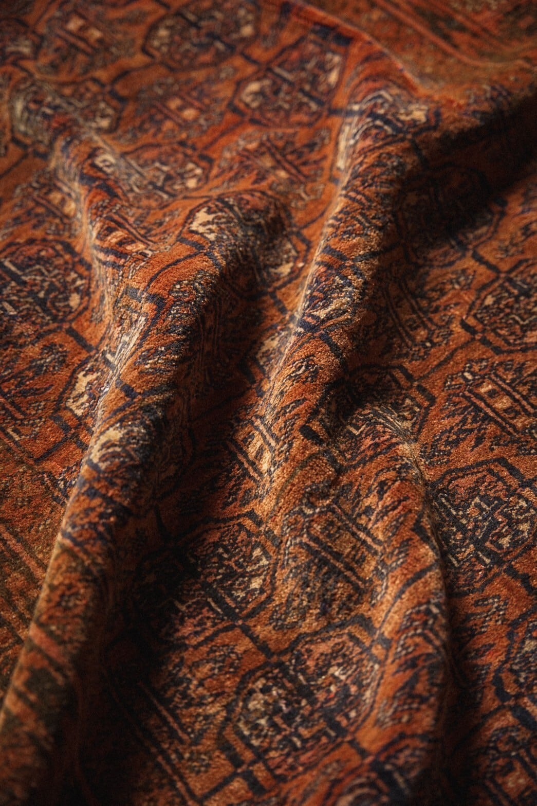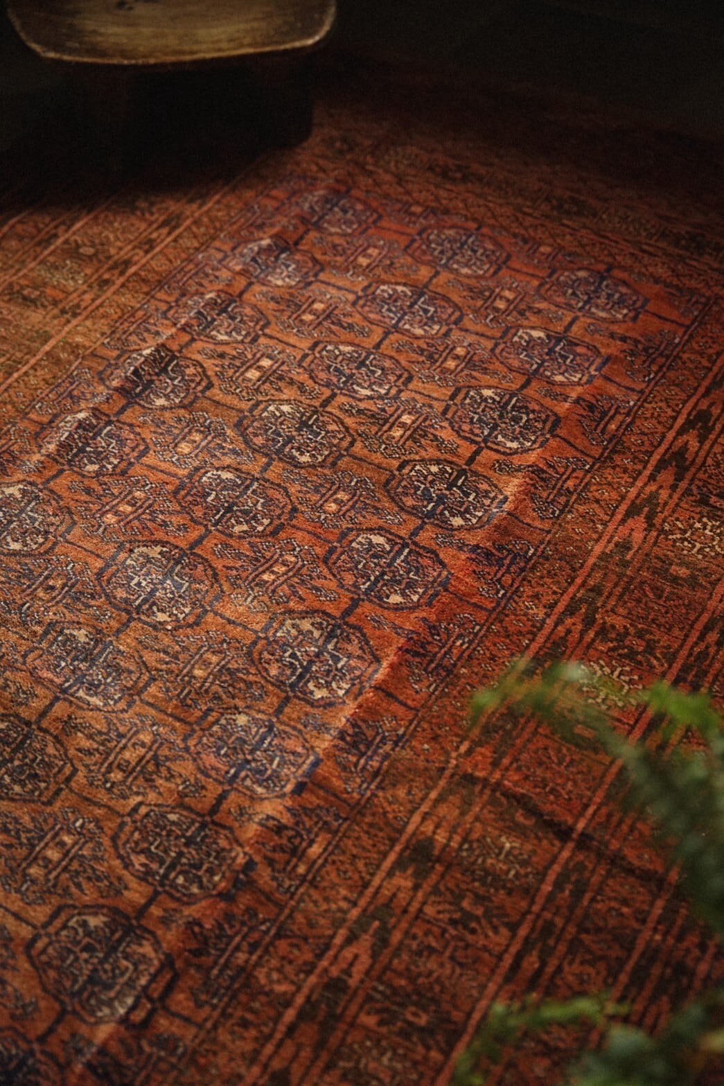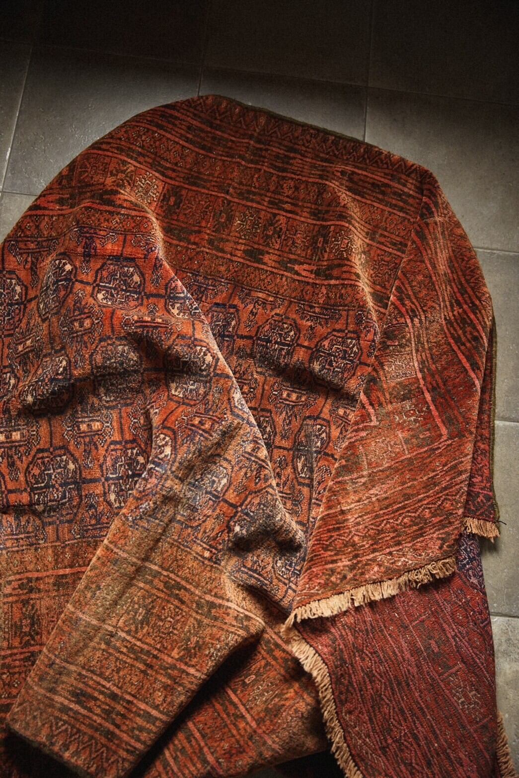 朱赤に近い優しい色味の赤色とネイビーをベースにMauri Gulと呼ばれるギュルがたくさん並んだデザインのアフガントルクメンラグ。