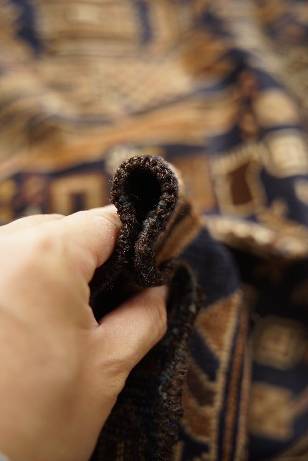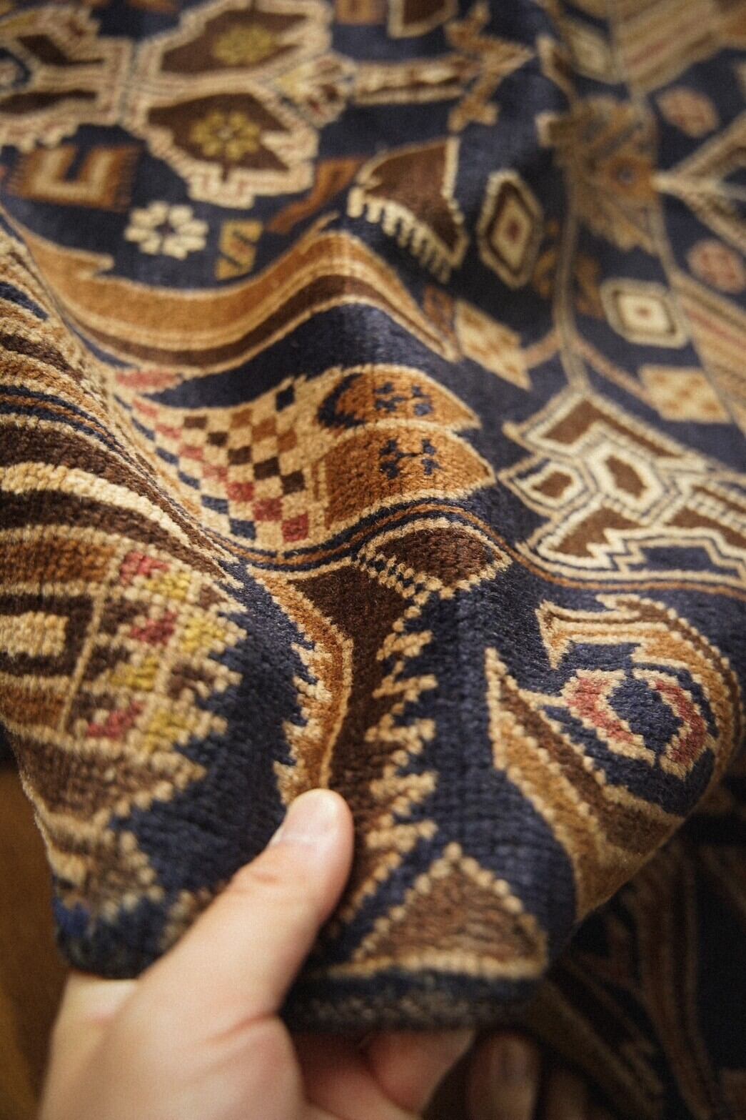 ネイビーをベースにブラウン、ベージュ、レッド、アイボリーで描かれるのは力強い印象の幾何学紋様。