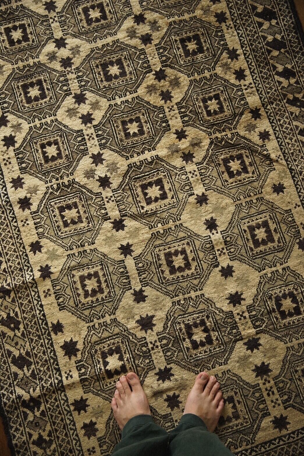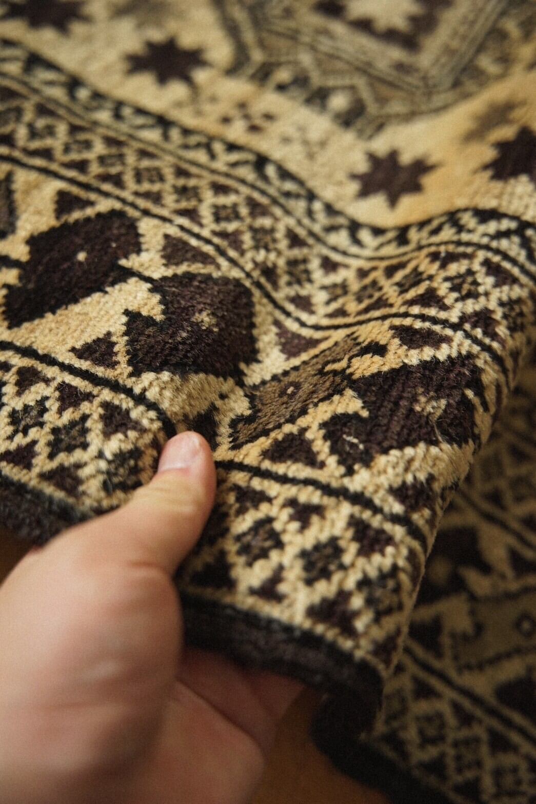 1930年代に織られたアフガニスタン産の染色していない原毛色のウールを使用しているバルーチラグ。