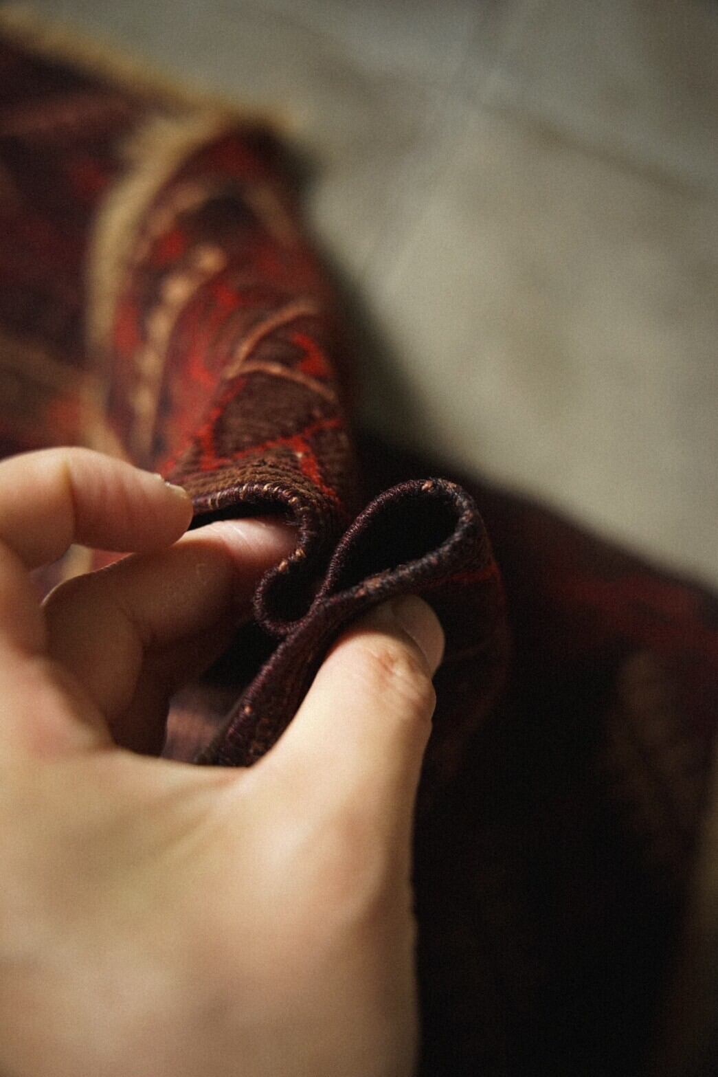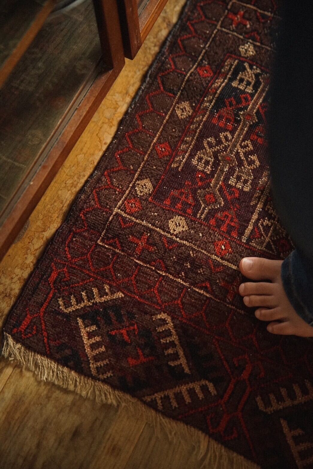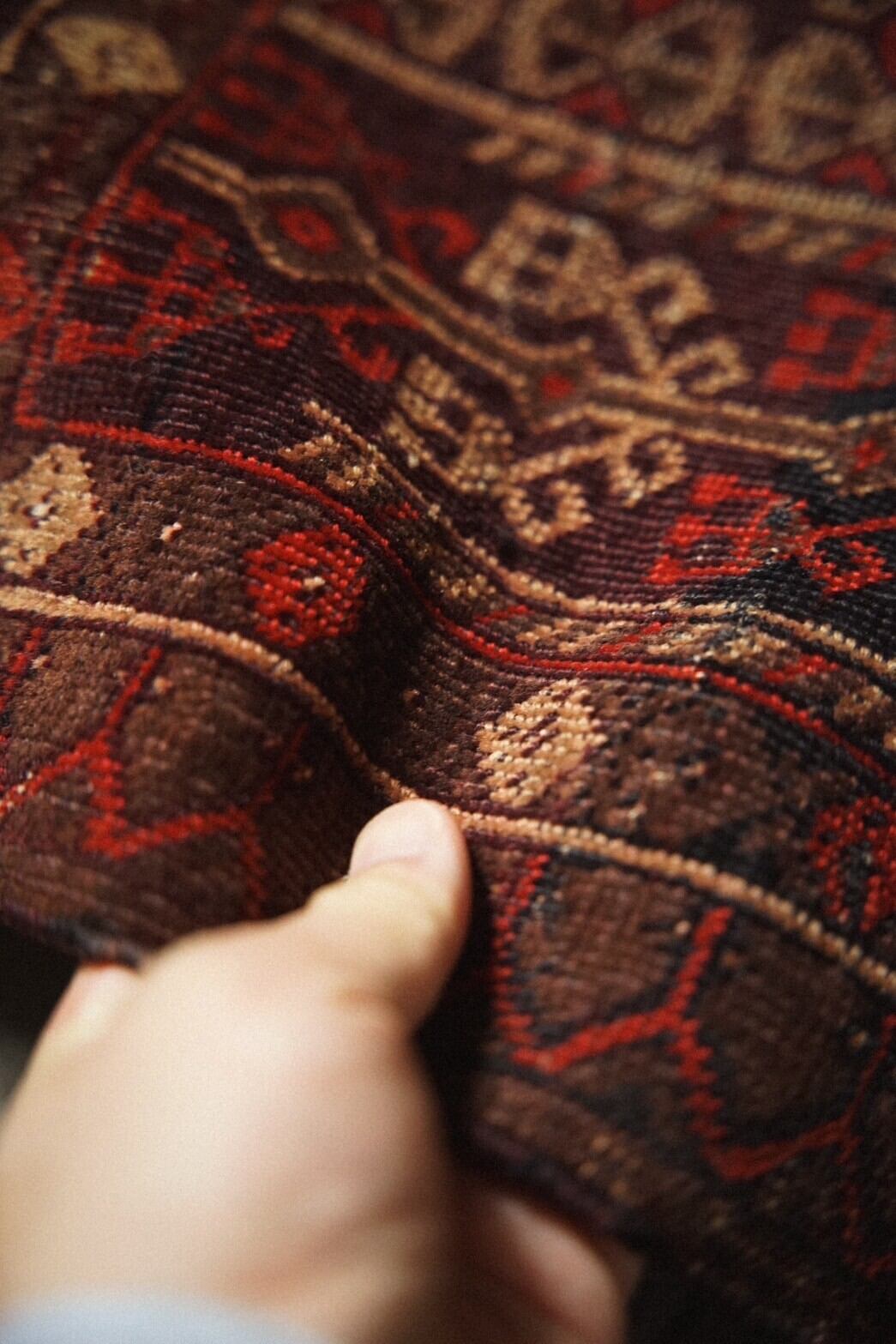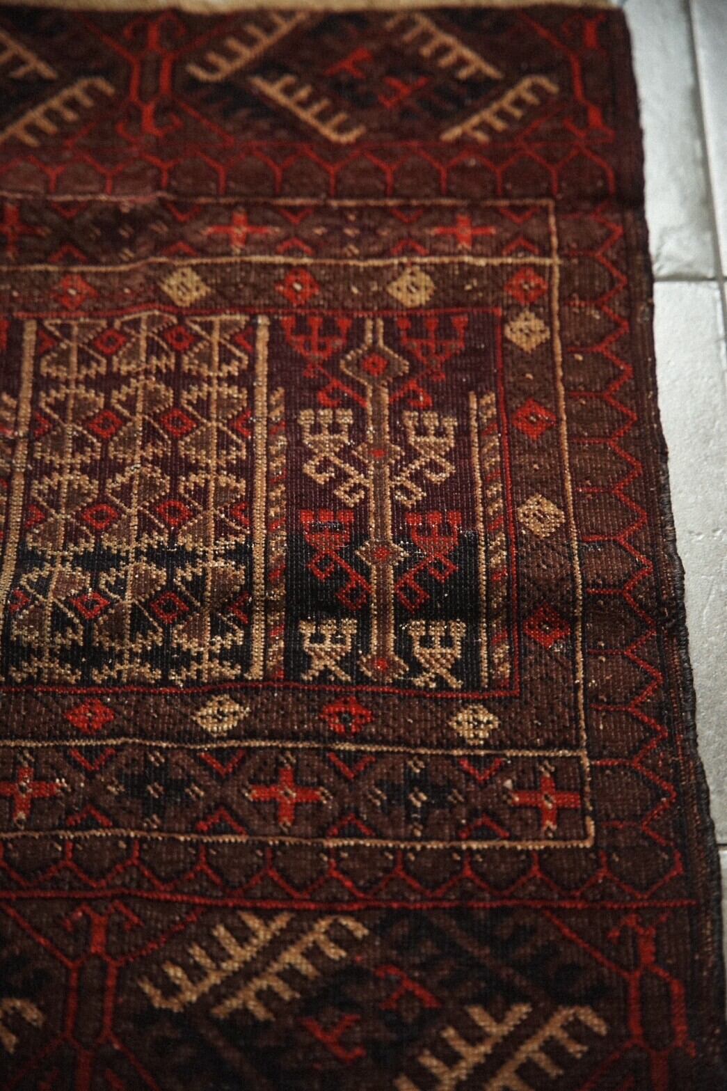 渋めのブラウンや赤系の配色と細かいモチーフが美しいトルクメン族のアリホジャラグ。