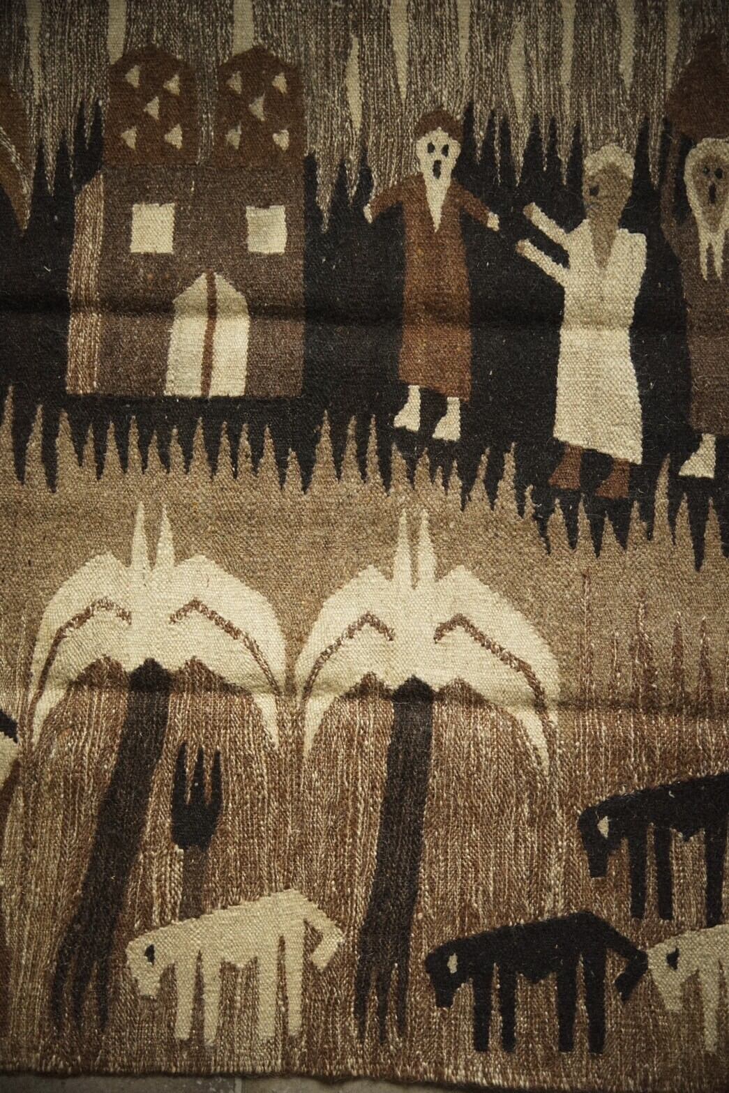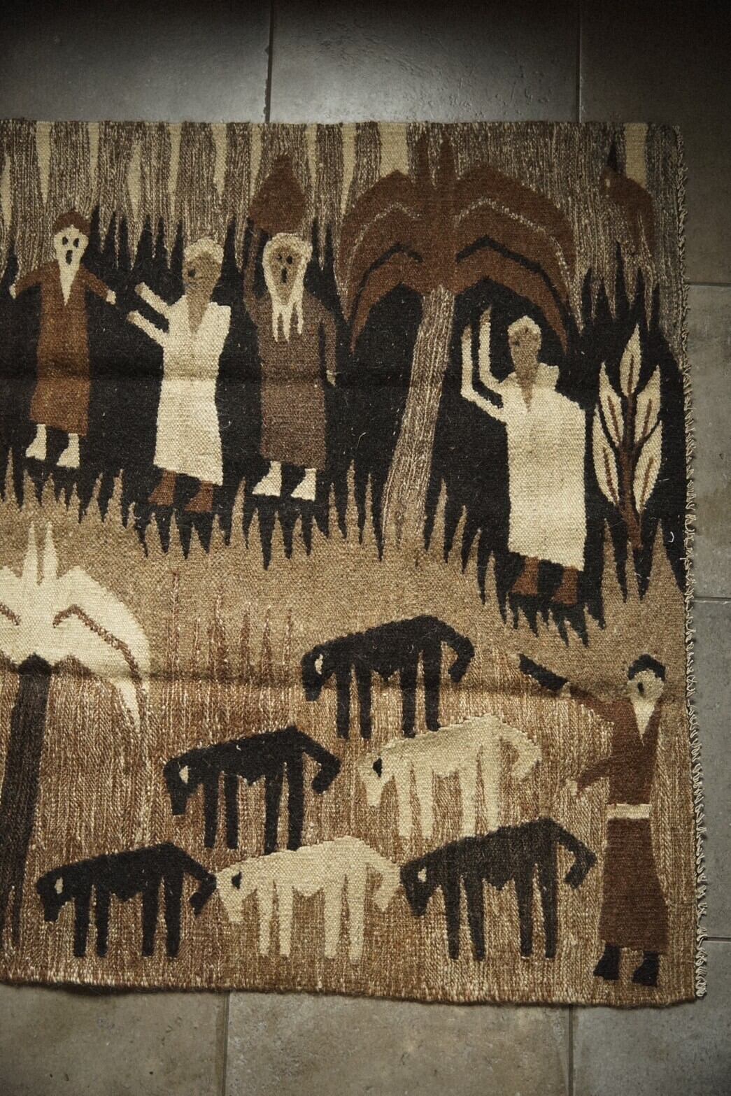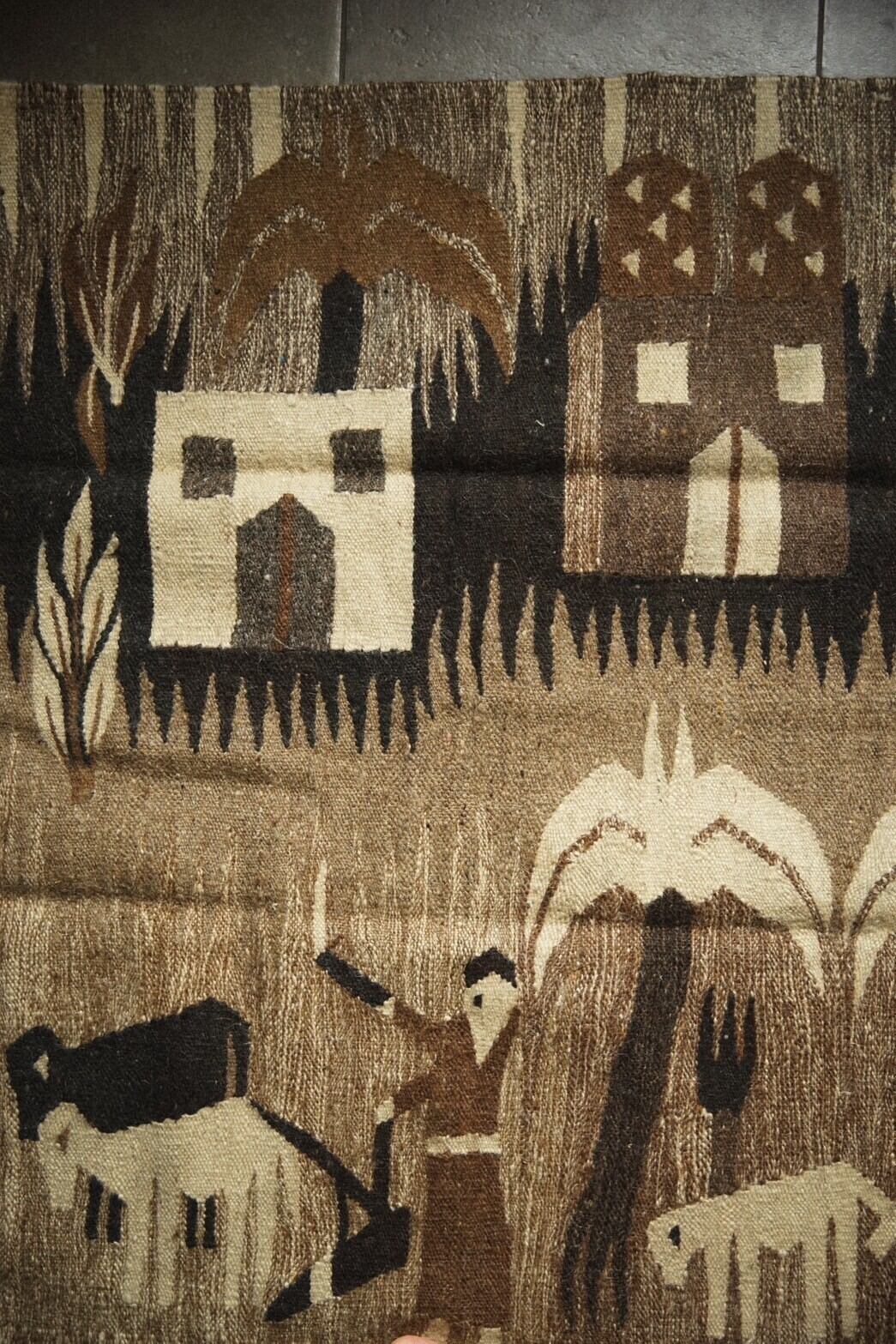 人々の生活風景を絵画のように描かれたピクトリアルデザインのキリム。
