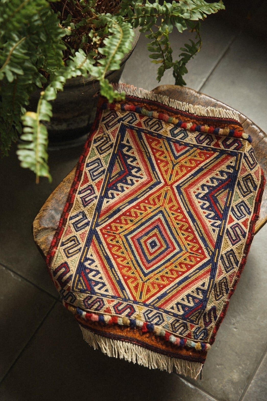 マシュワニ族によって織られたキリムです。眺めるだけで元気が出る色彩豊かな1枚。