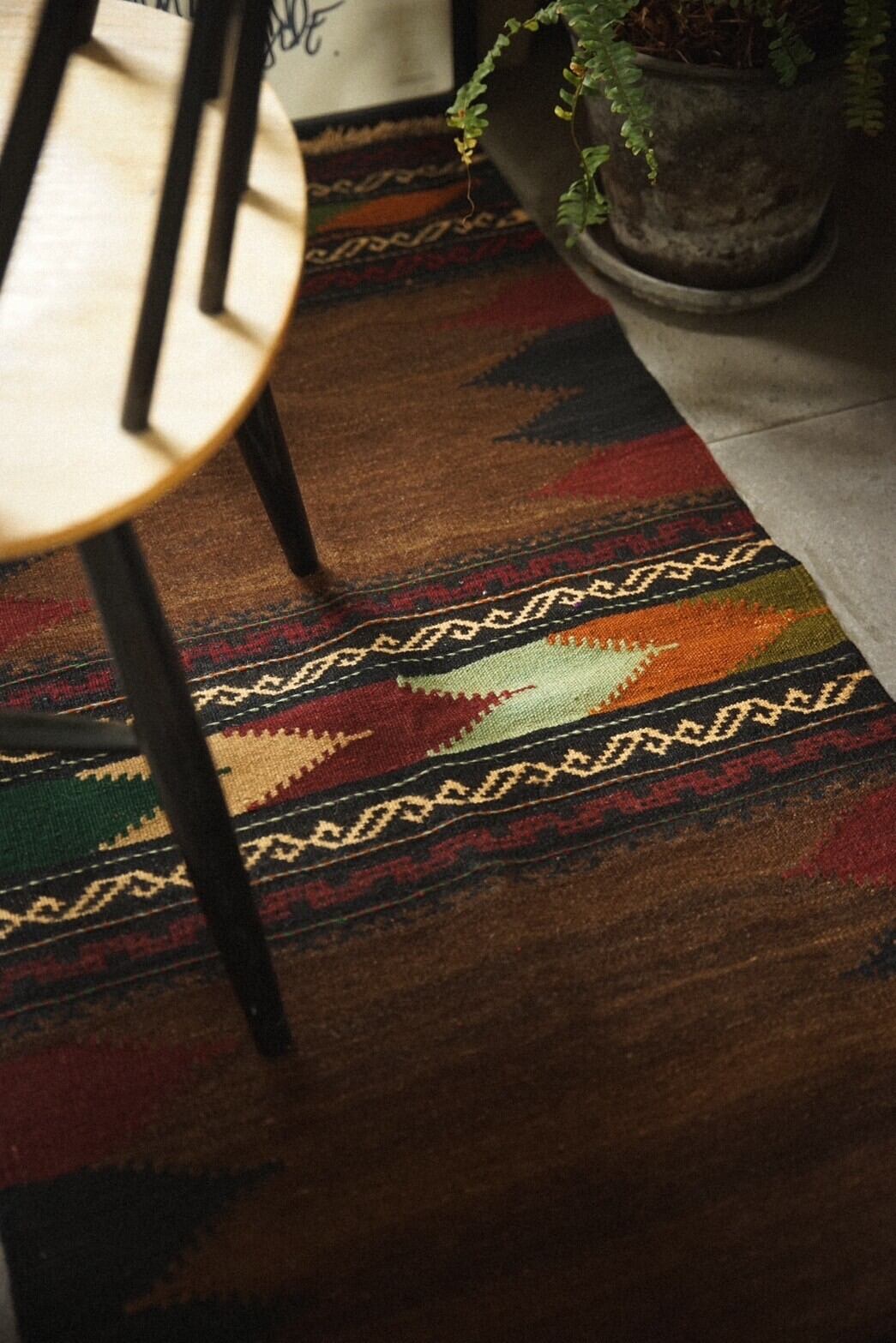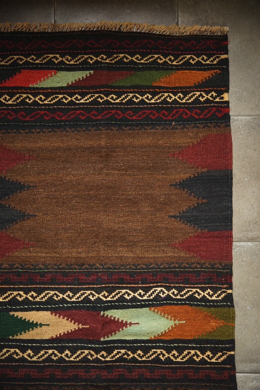 細長い形のソフレはこの上にお食事を載せて、みんなで食卓を囲む際に使われたキリムです。ブラウンベースにグリーン、マスタード、カーキ、レッド、ブラックで描かれたジグザグ紋様。